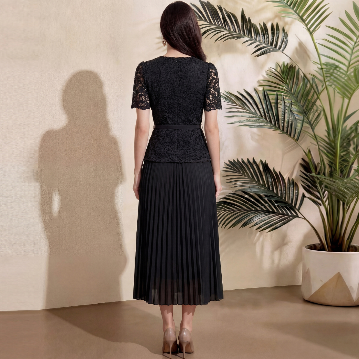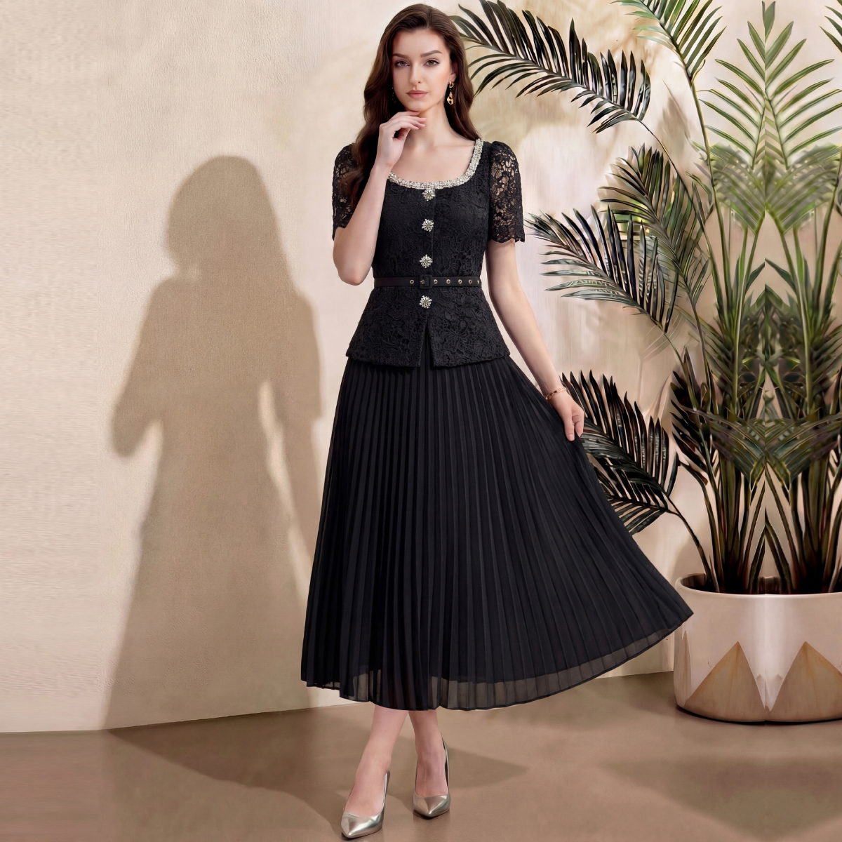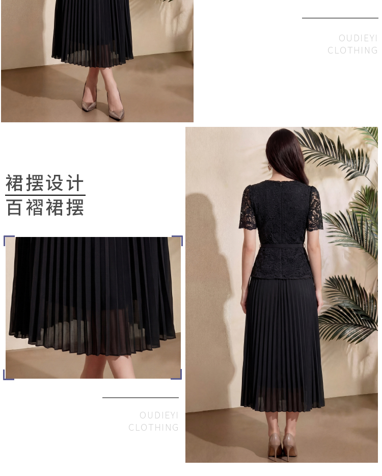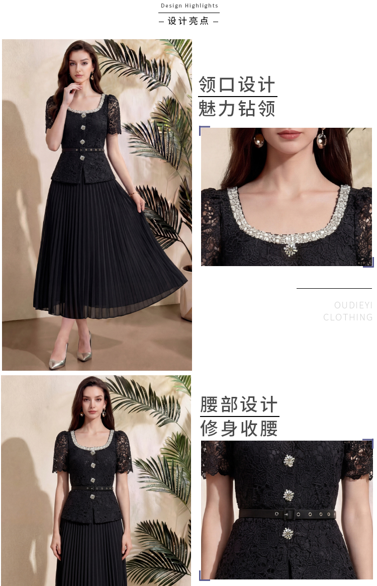 RY4115# 实拍法式小香风修身镶钻大圆领短袖蕾丝拼接中长百褶连衣裙配腰带