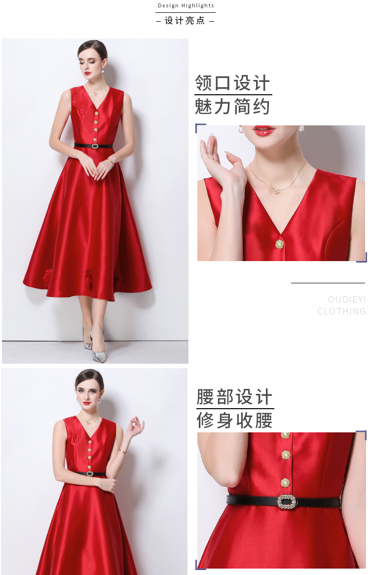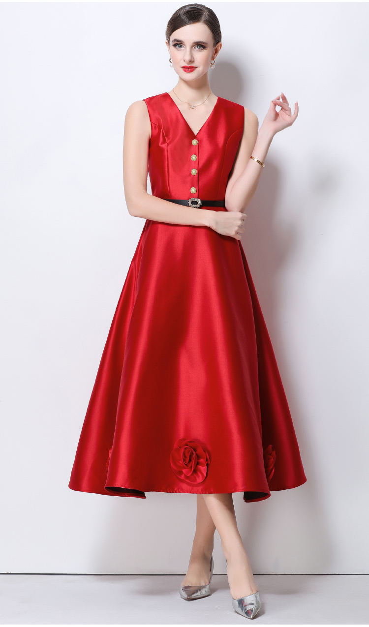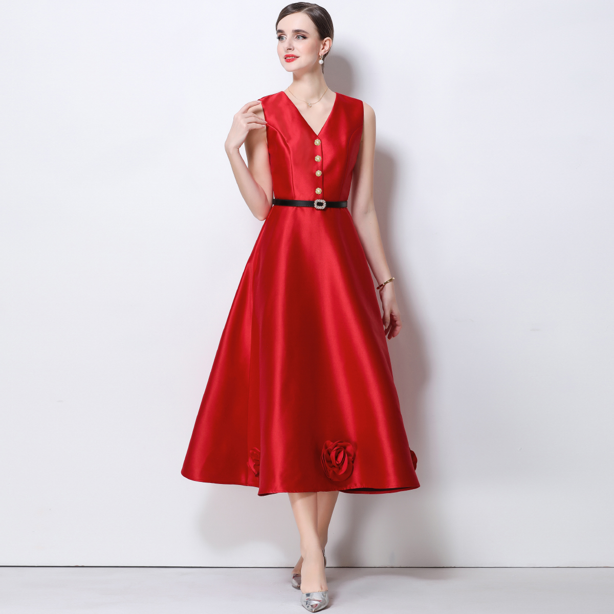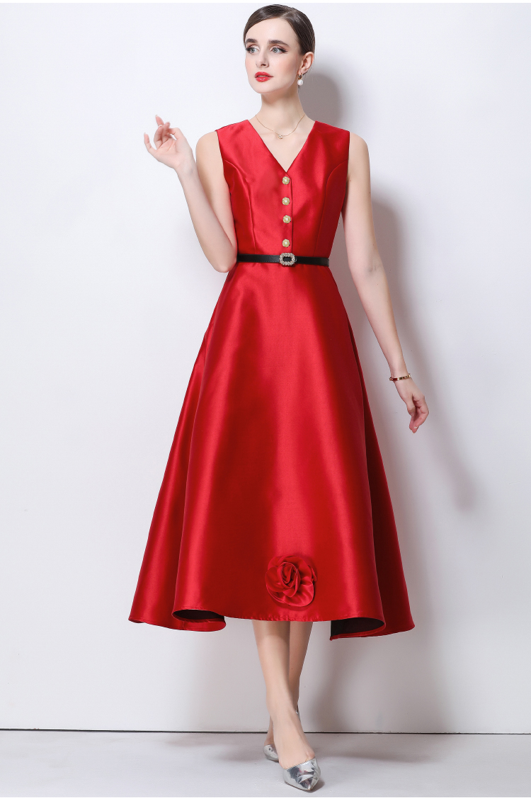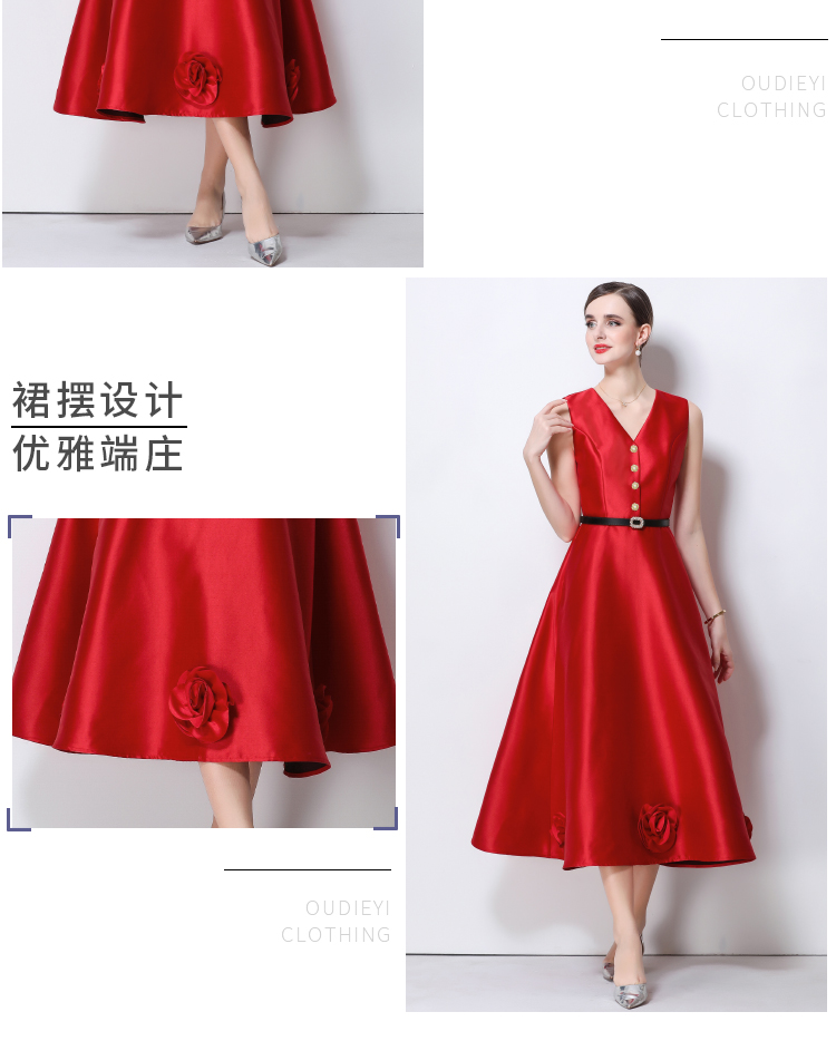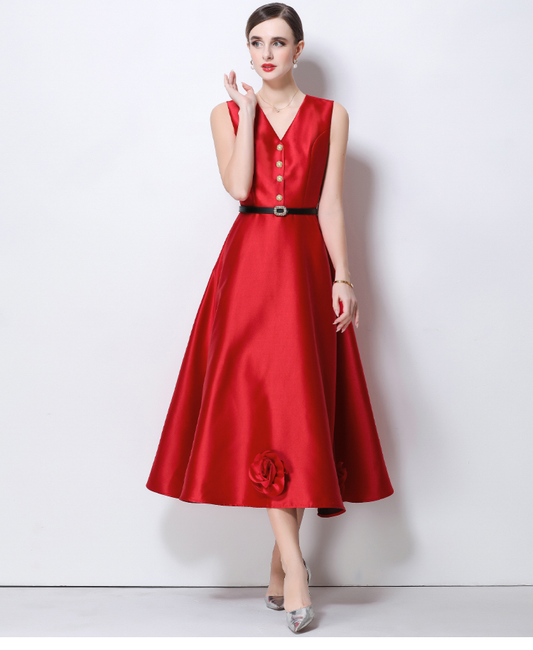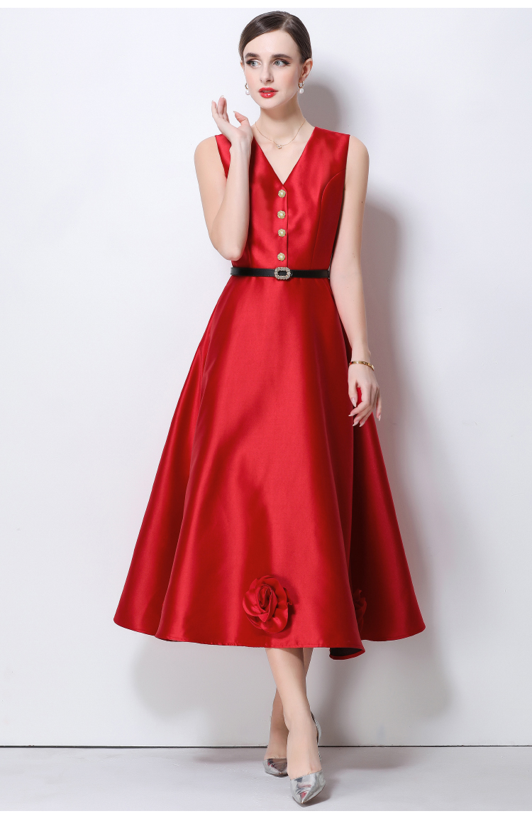 RY4118# 实拍法式简约立体花朵连衣裙无袖V领收腰显瘦中长裙女配腰带