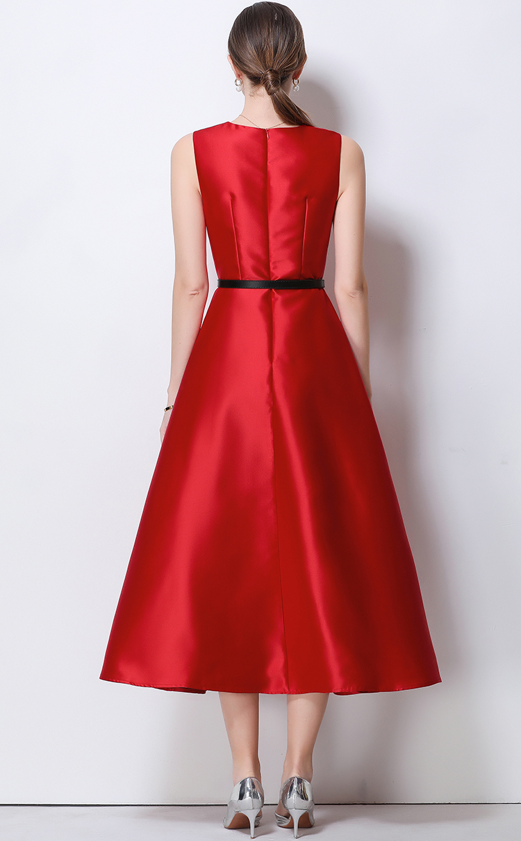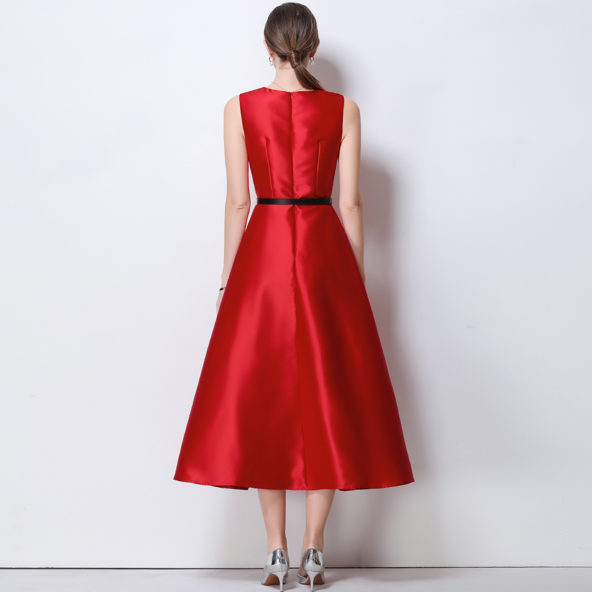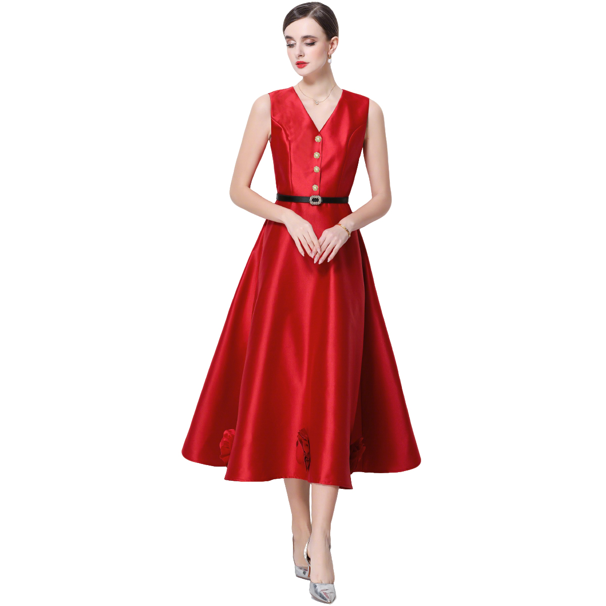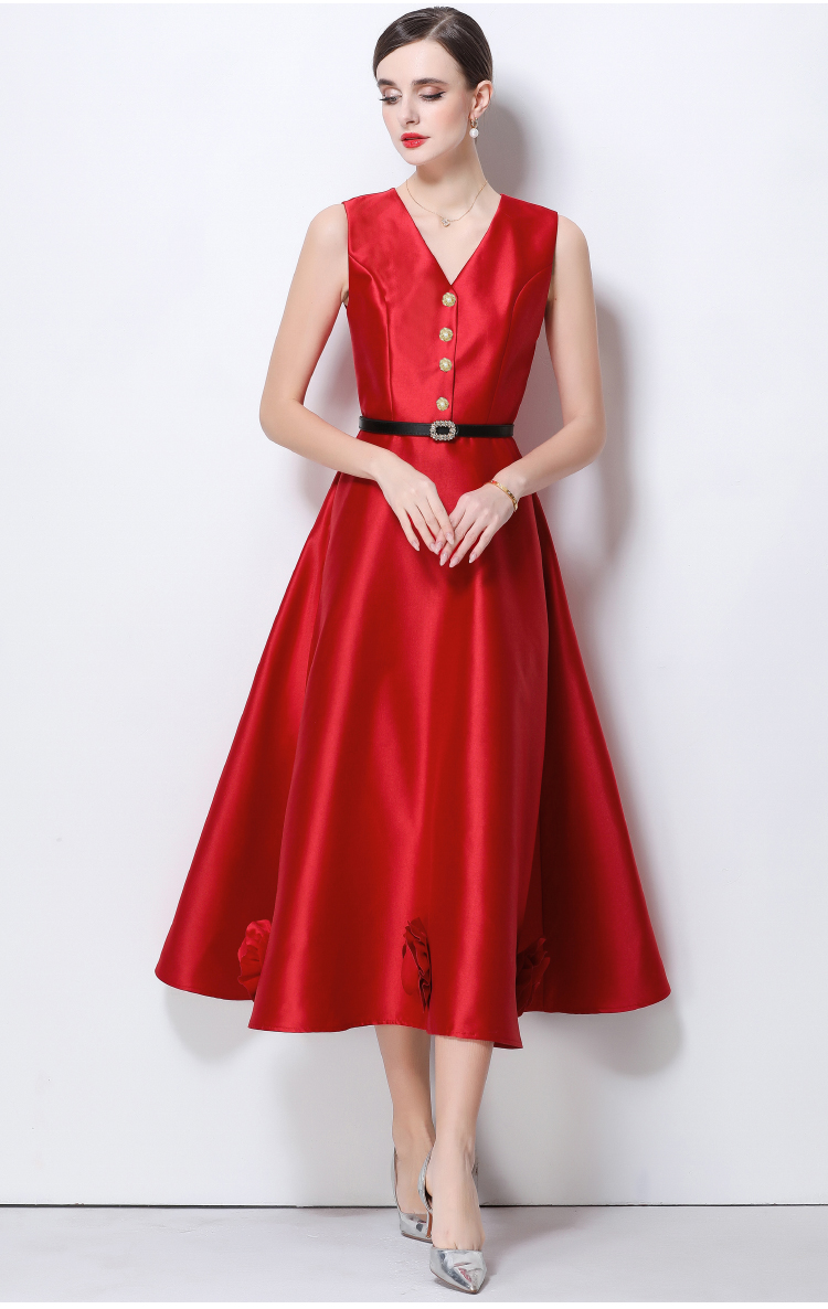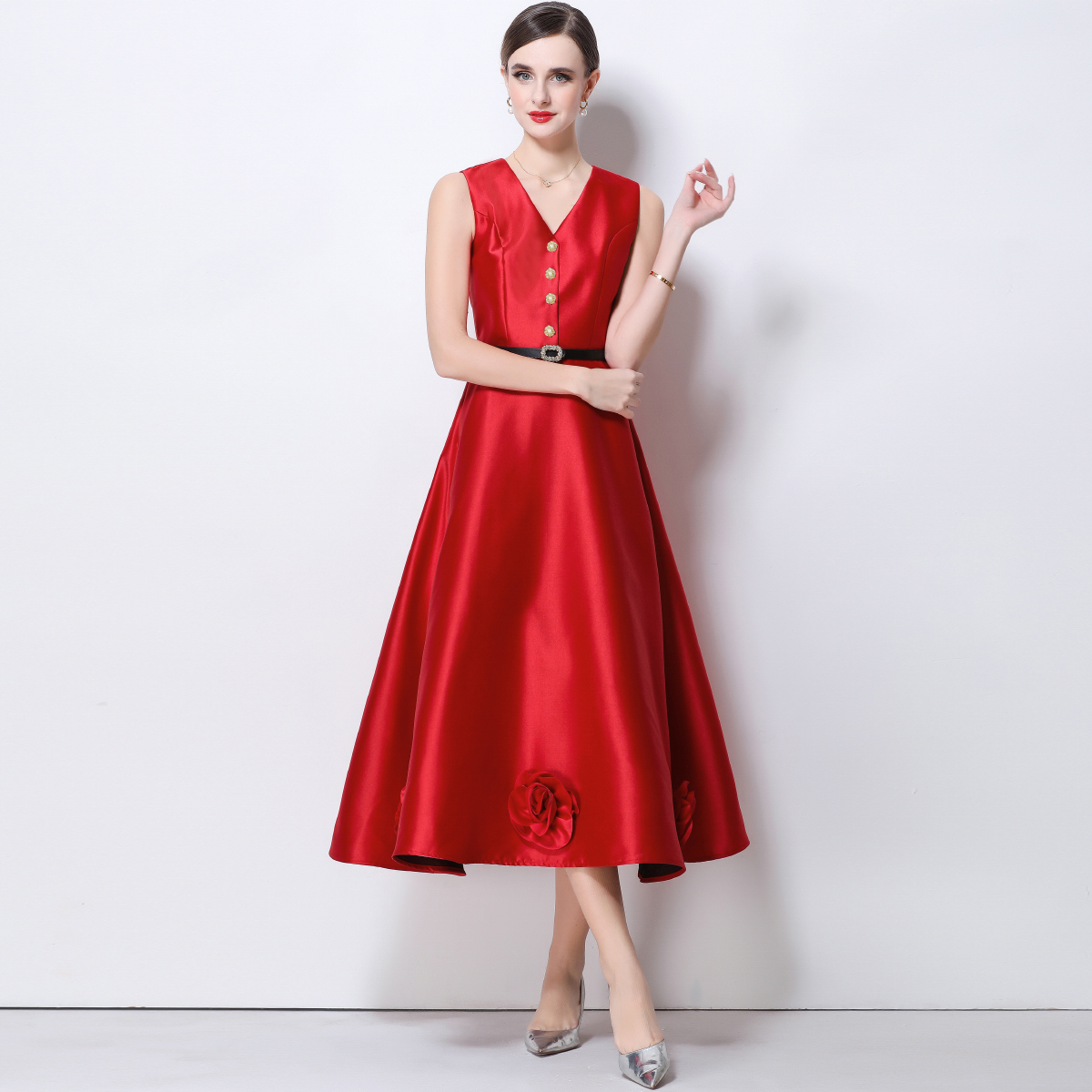 RY4118# 实拍法式简约立体花朵连衣裙无袖V领收腰显瘦中长裙女配腰带