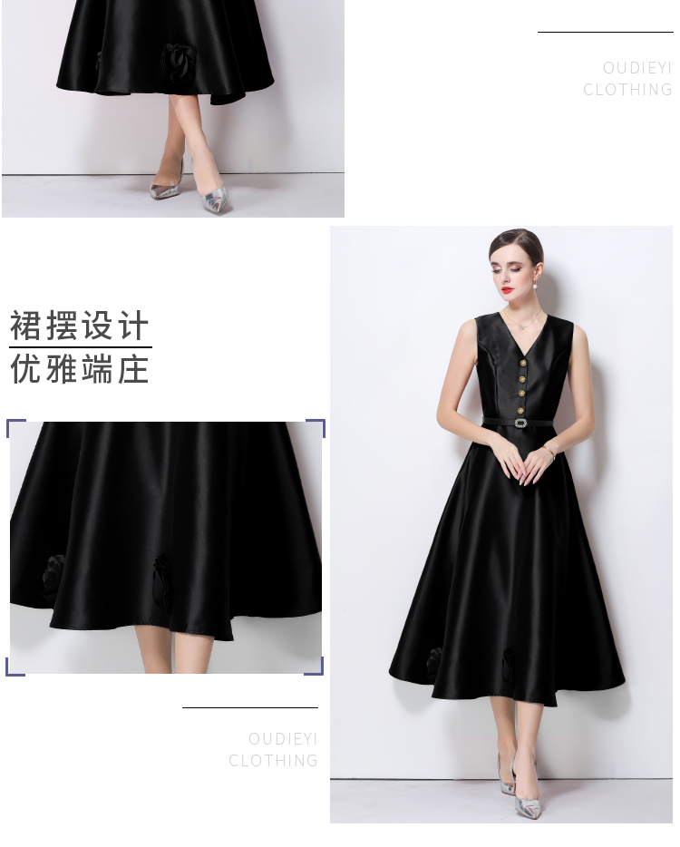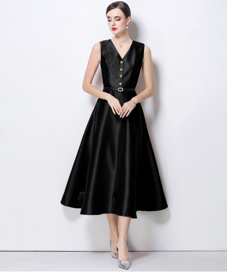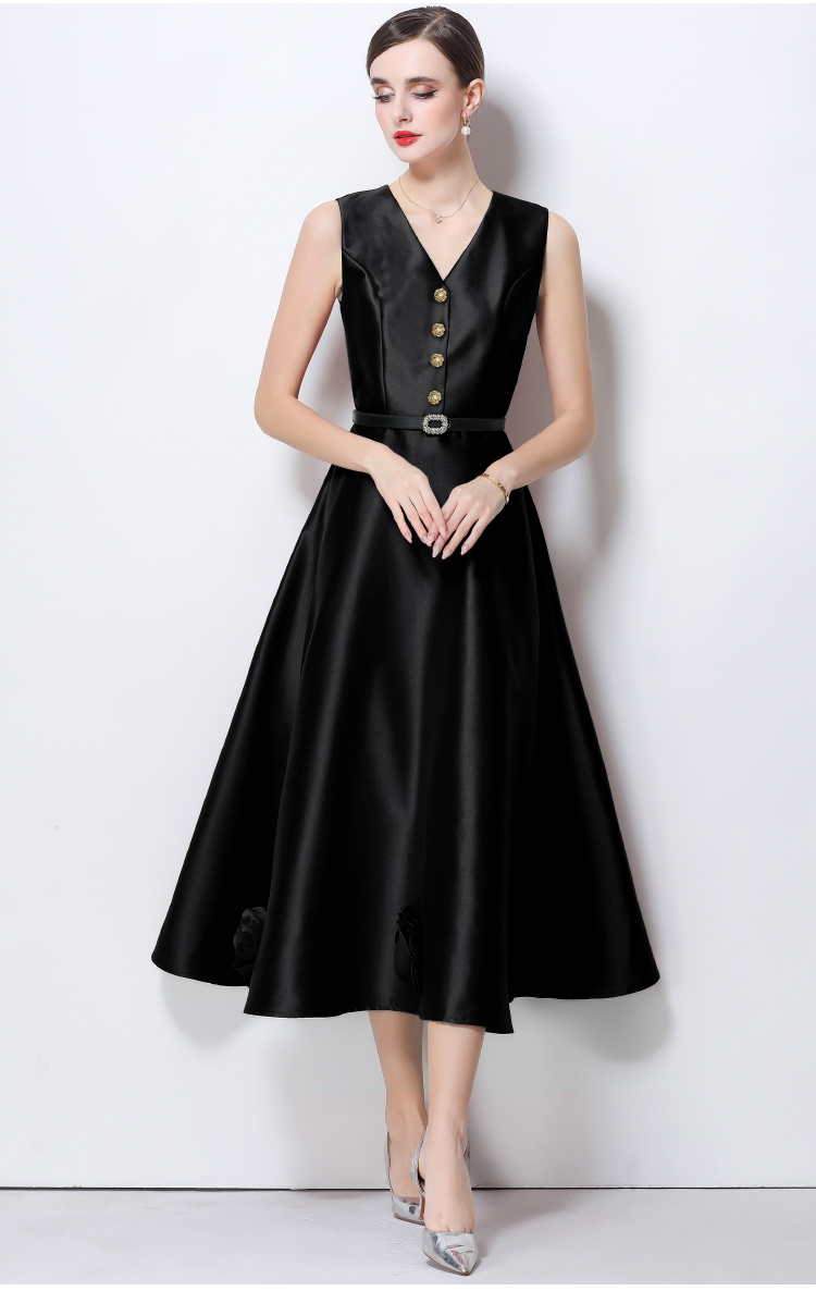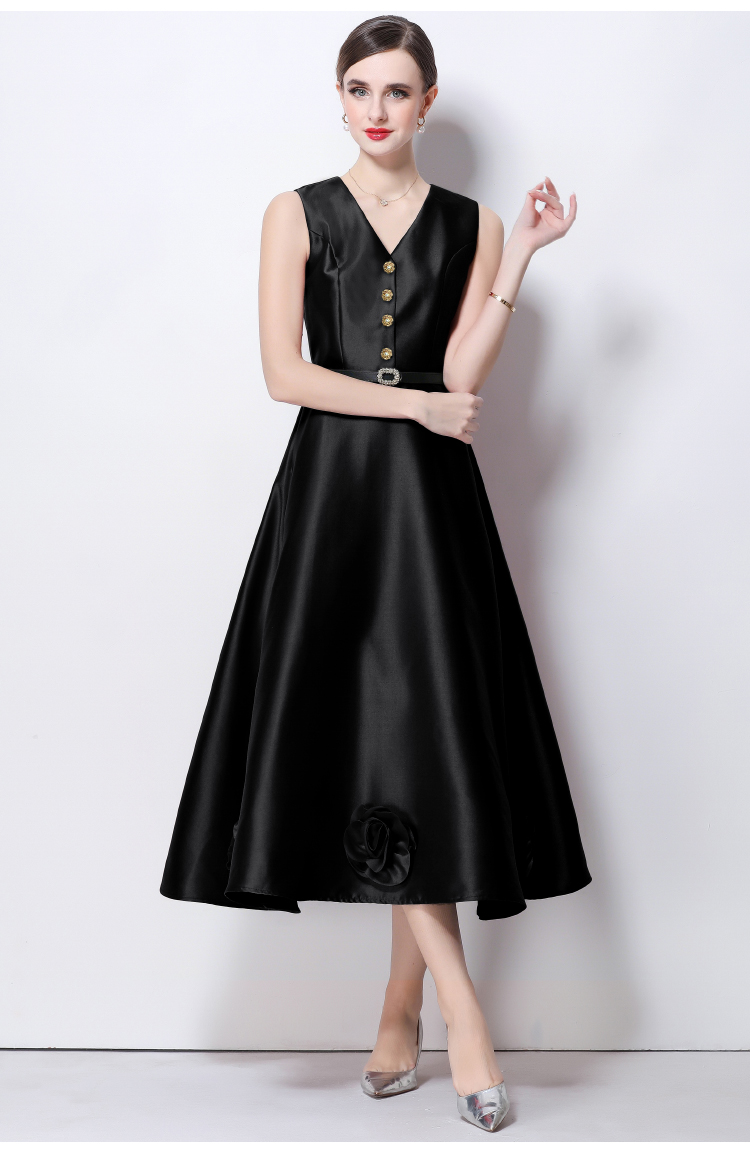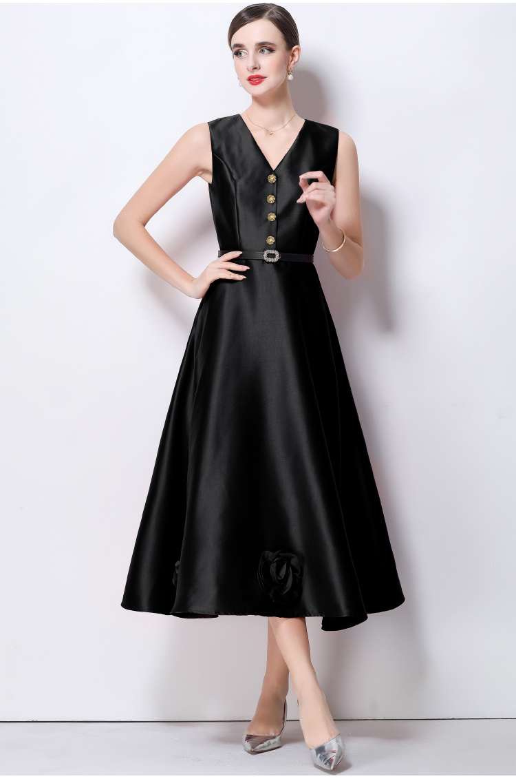 RY4120# 实拍法式简约立体花朵连衣裙无袖V领收腰显瘦中长裙女配腰带