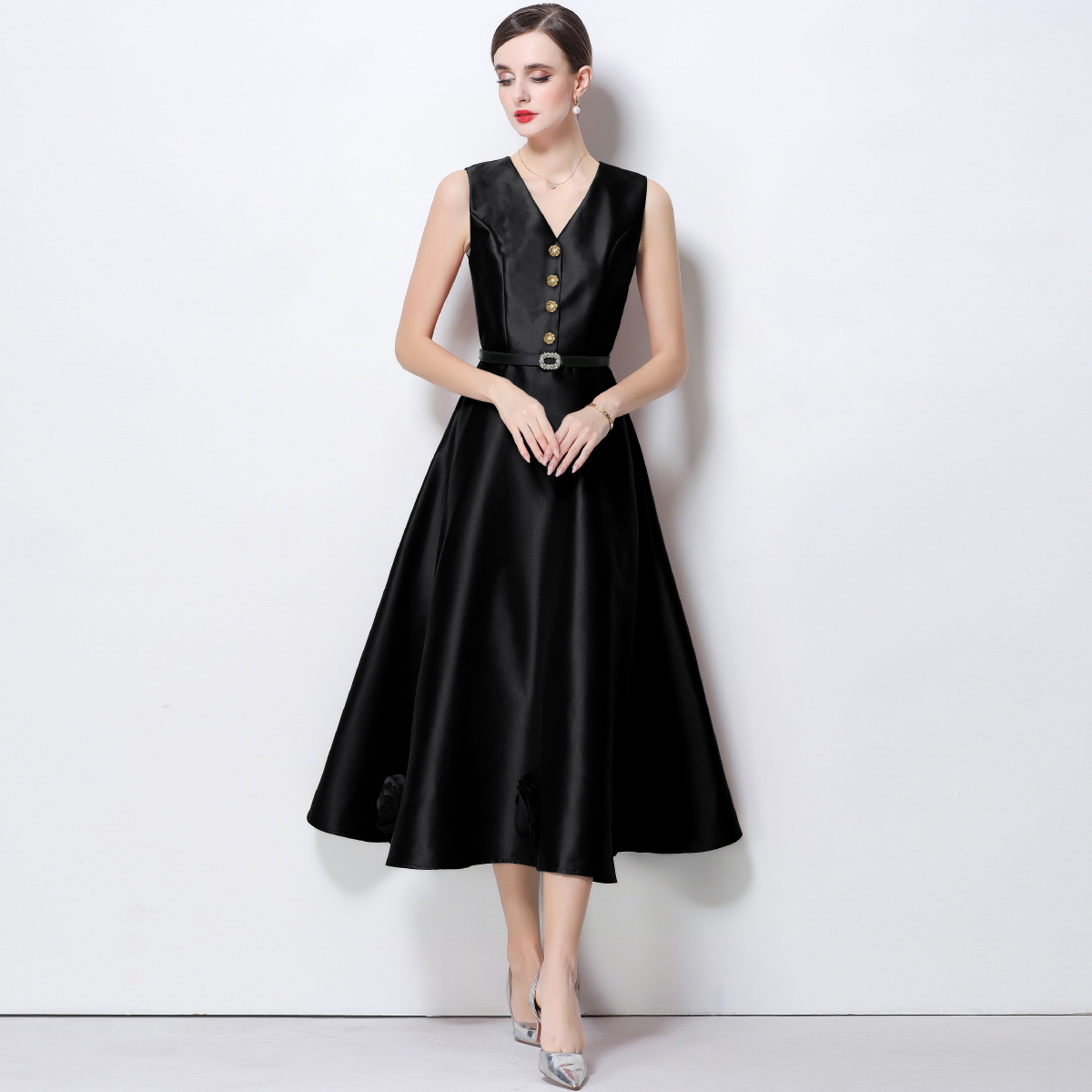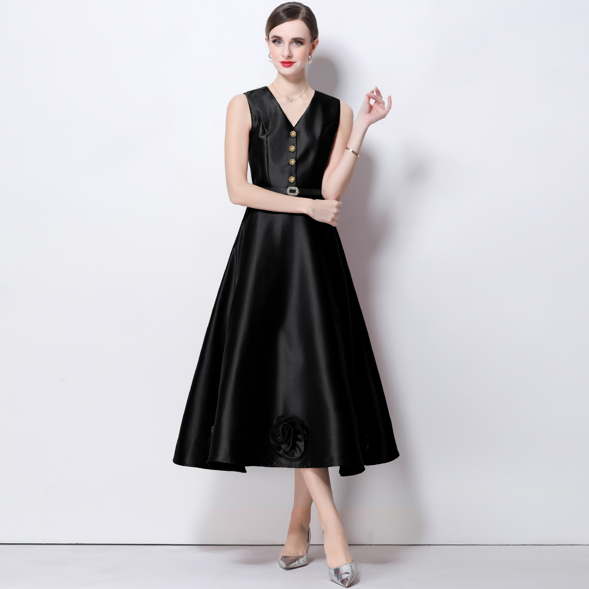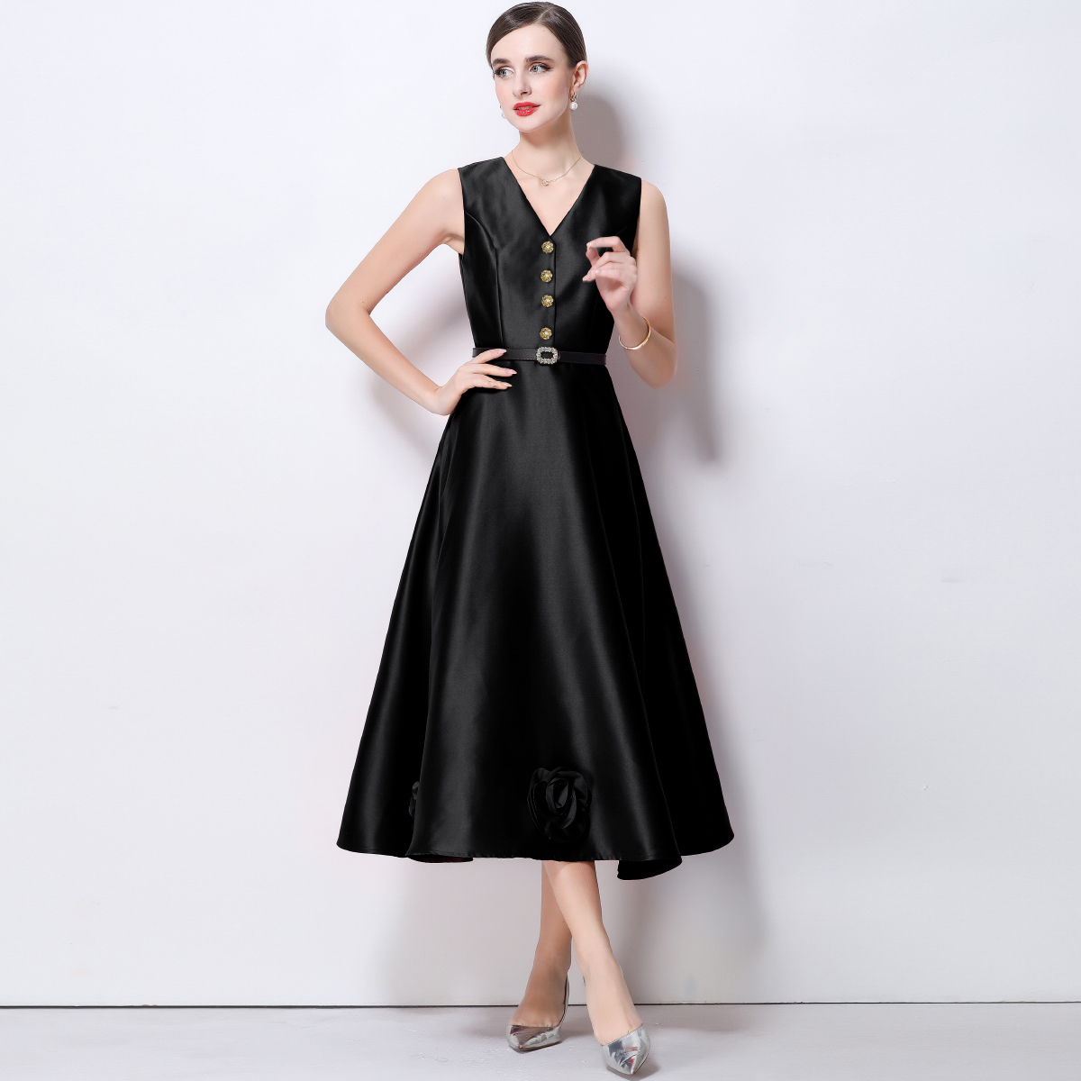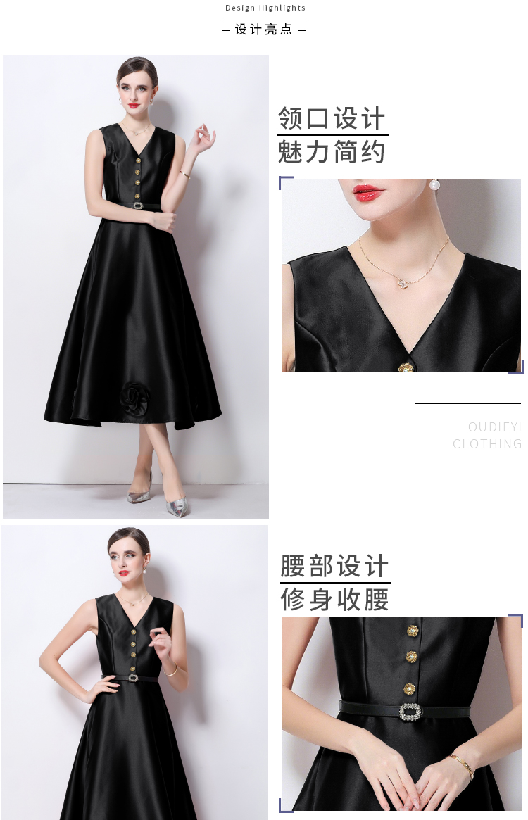 RY4120# 实拍法式简约立体花朵连衣裙无袖V领收腰显瘦中长裙女配腰带