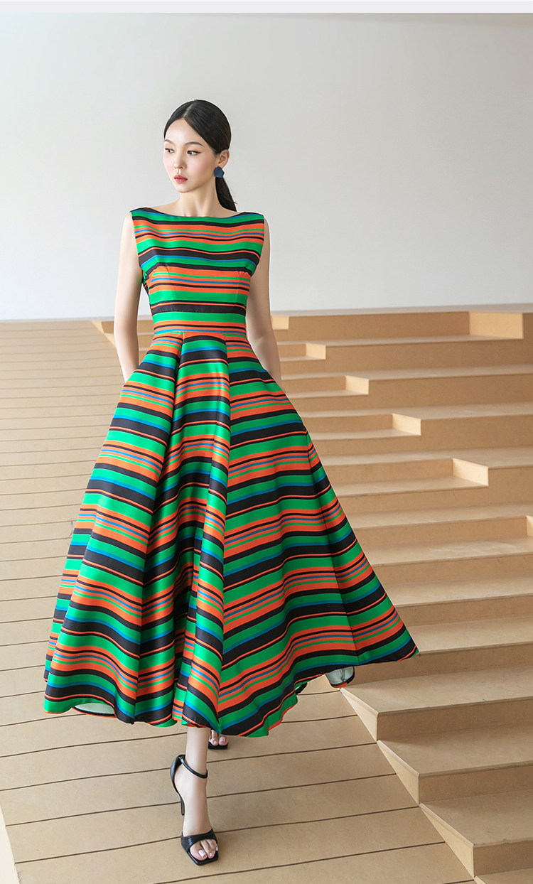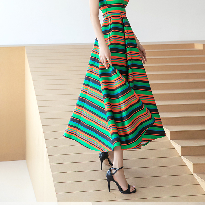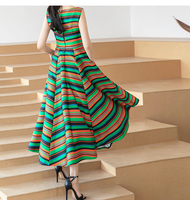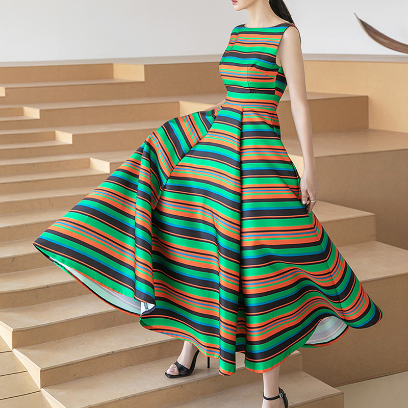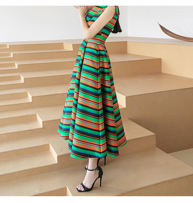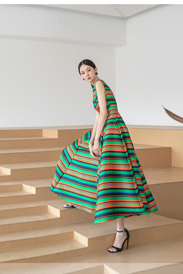 RY4125# 2026春夏款韩版时尚大气简约收腰显瘦彩色条纹大摆蓬蓬长款连衣裙