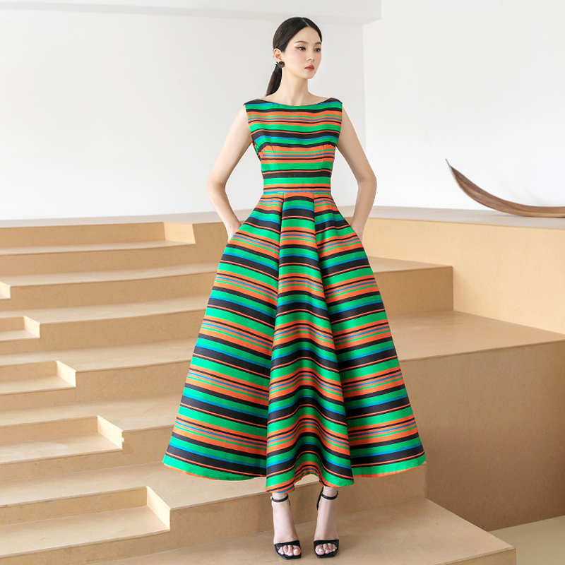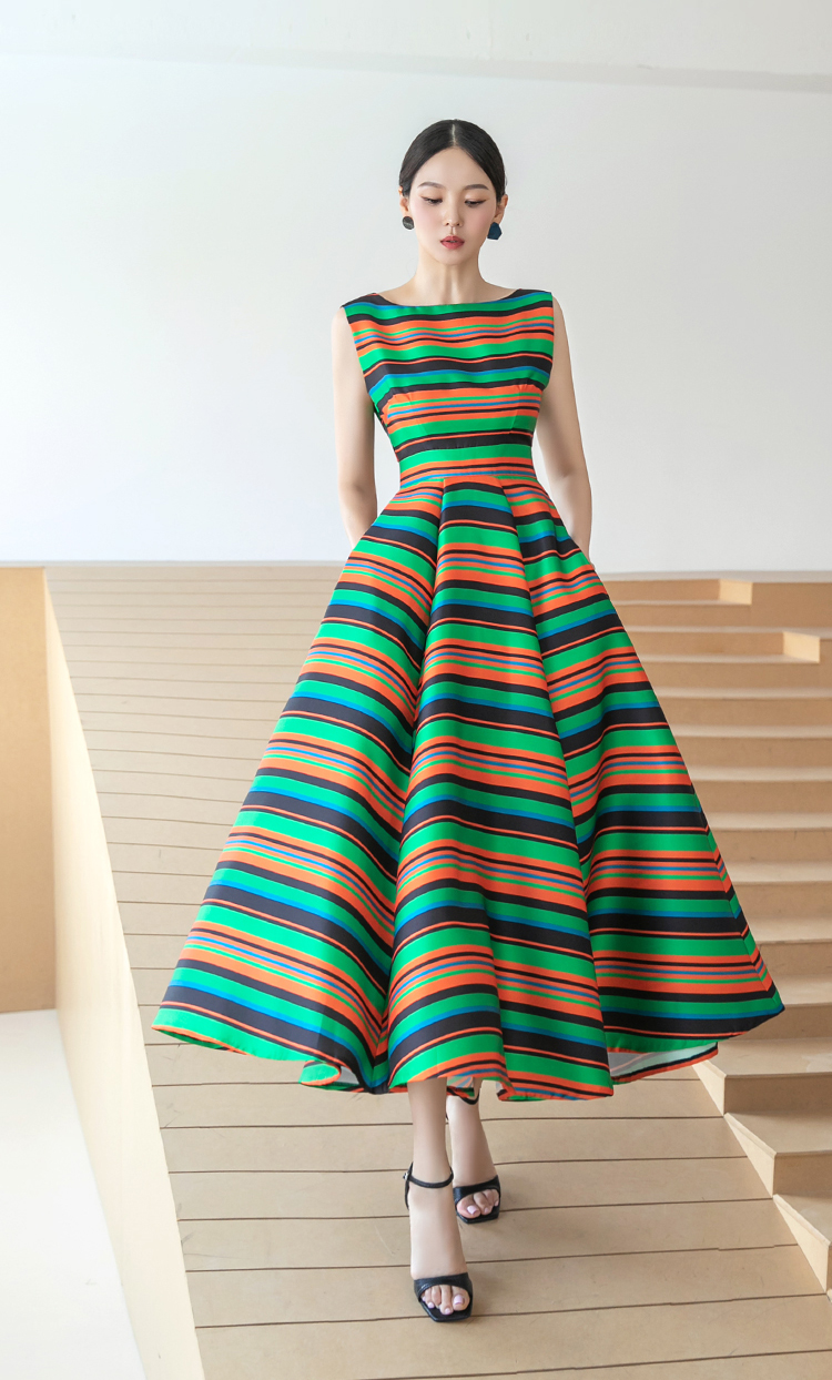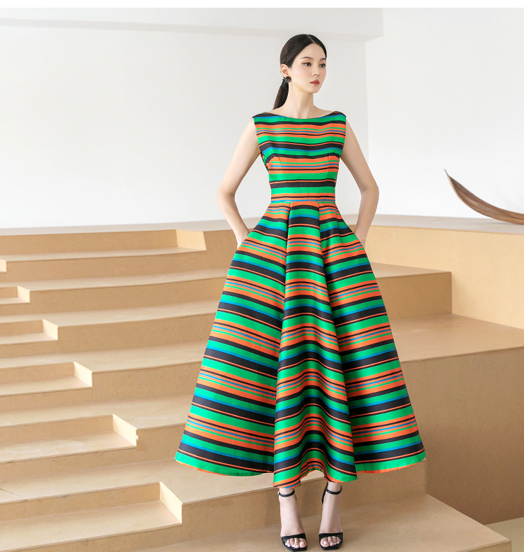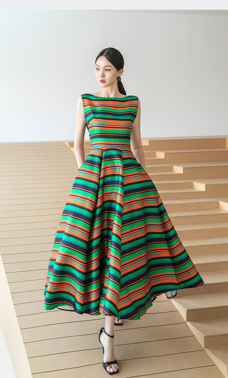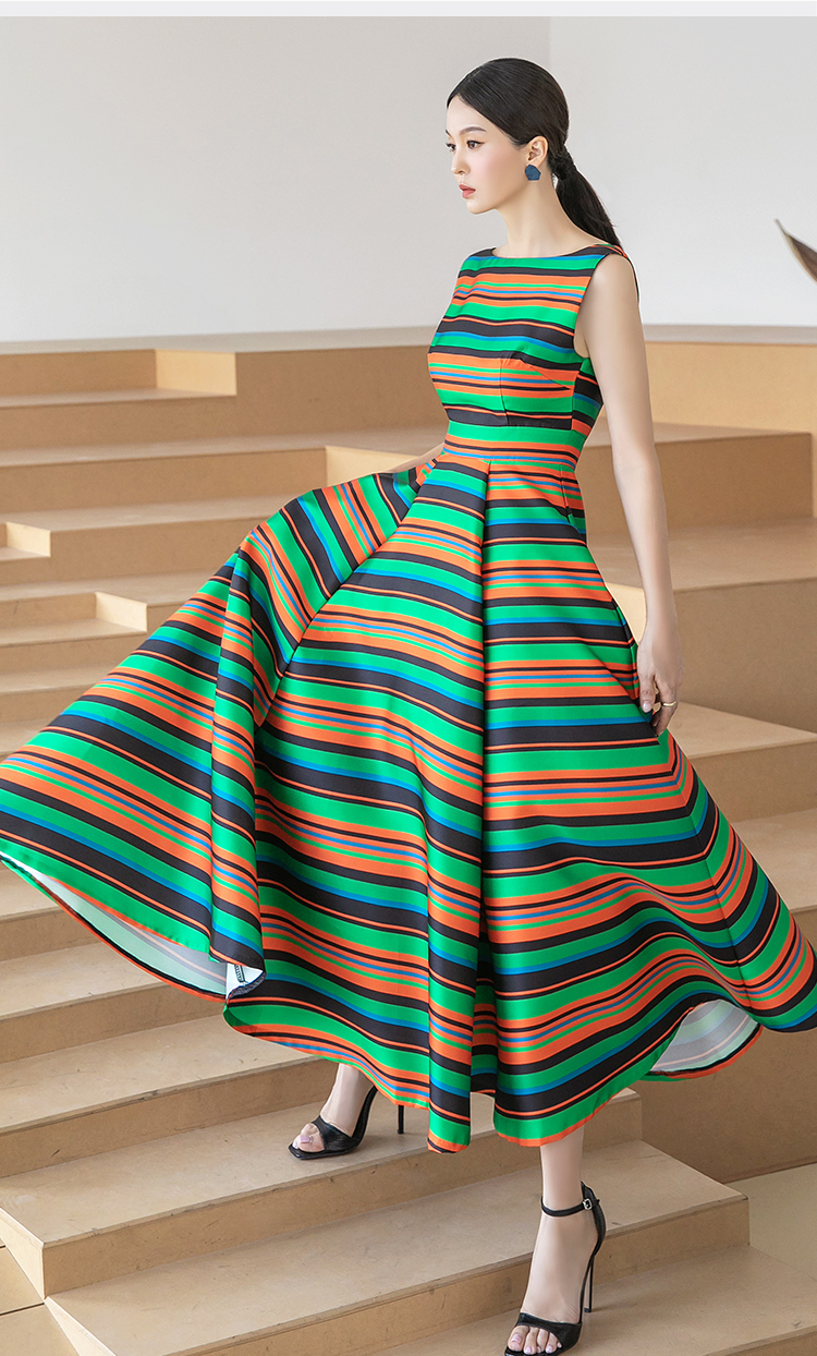 RY4125# 2026春夏款韩版时尚大气简约收腰显瘦彩色条纹大摆蓬蓬长款连衣裙