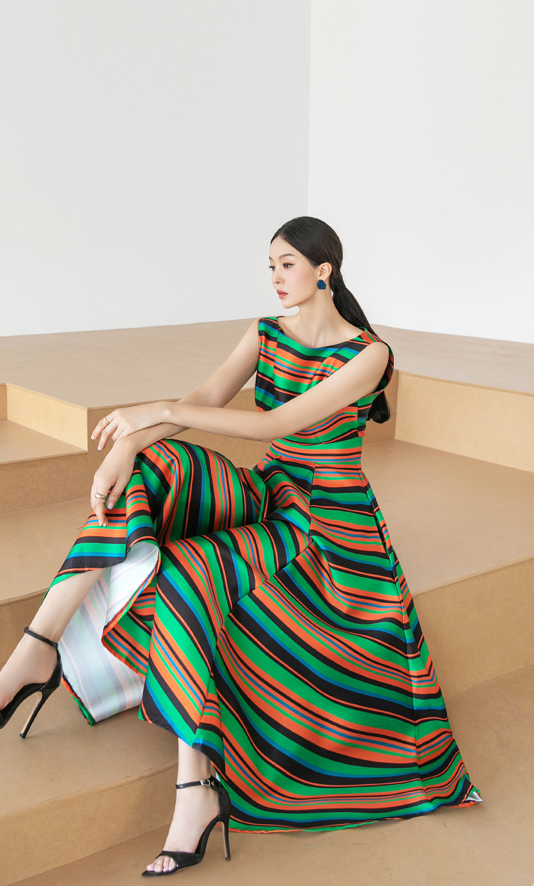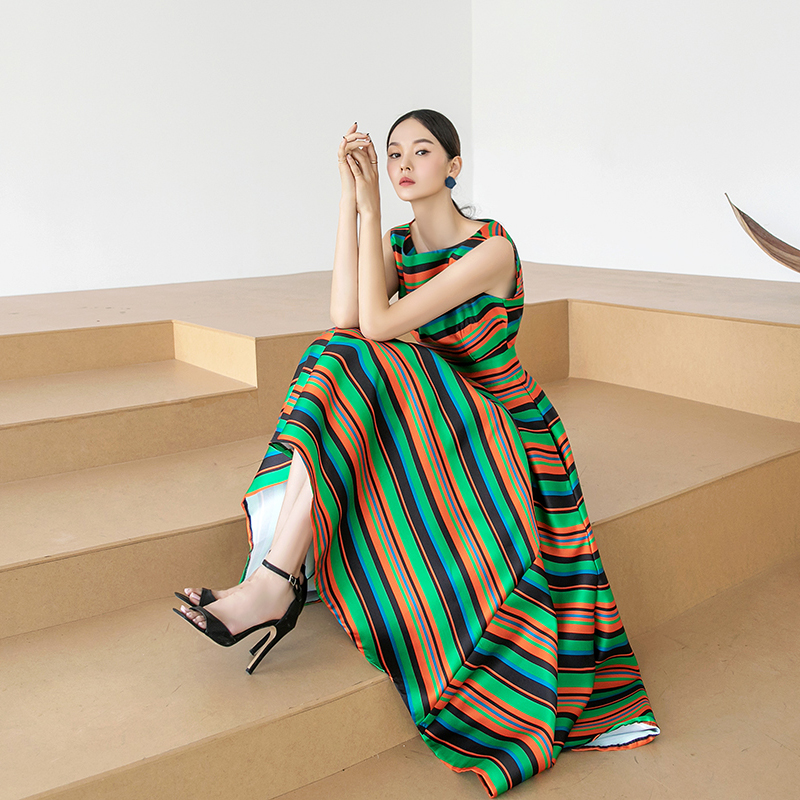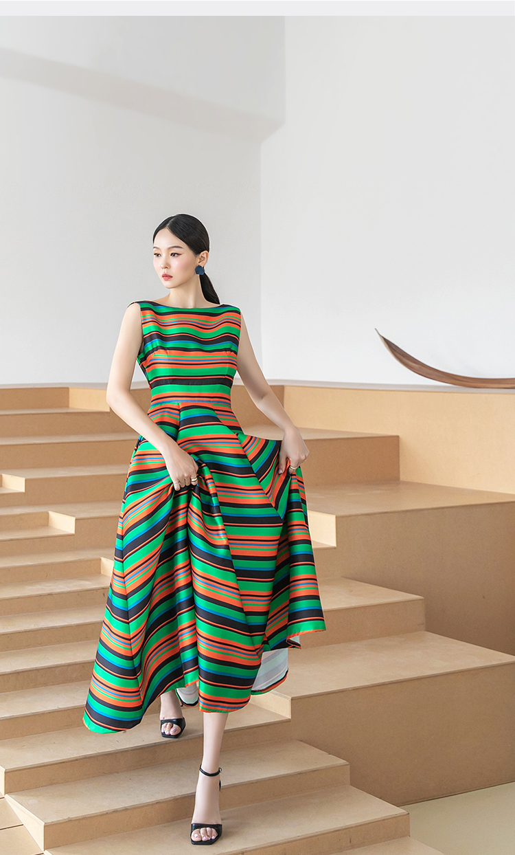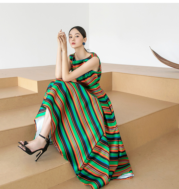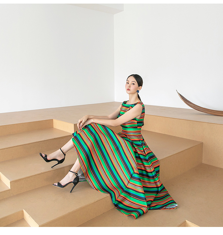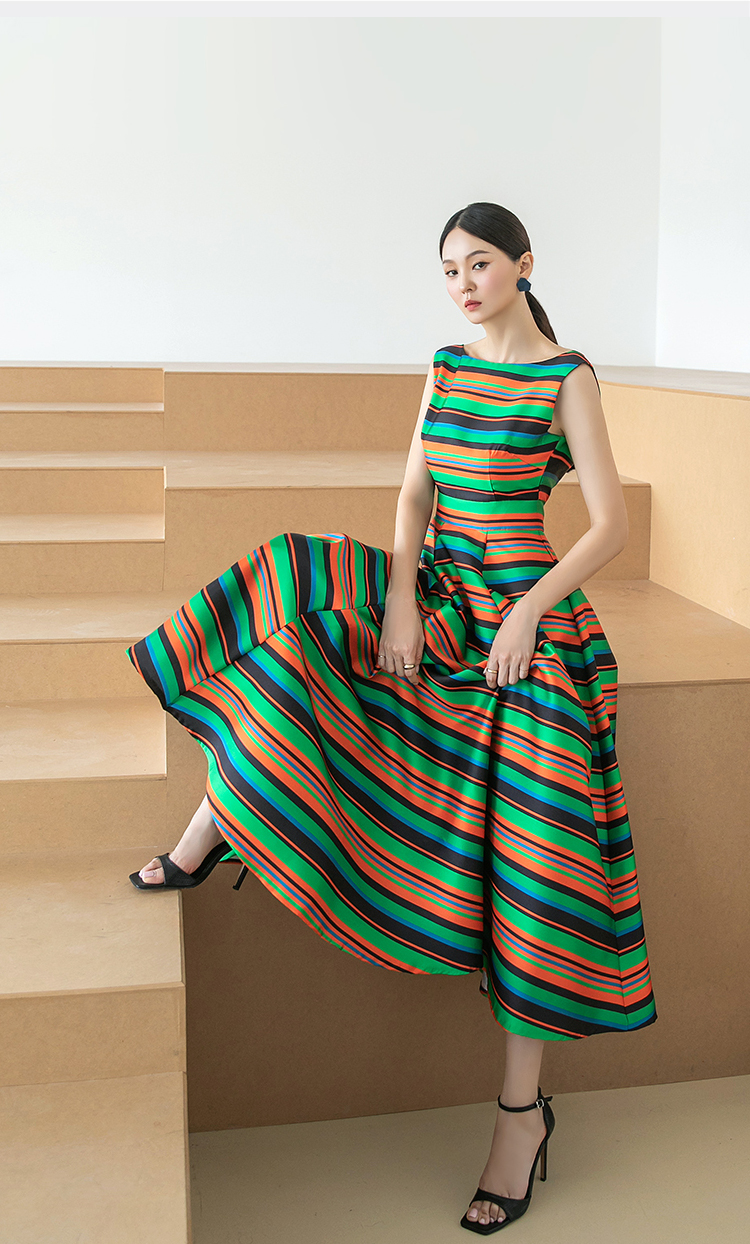 RY4125# 2026春夏款韩版时尚大气简约收腰显瘦彩色条纹大摆蓬蓬长款连衣裙