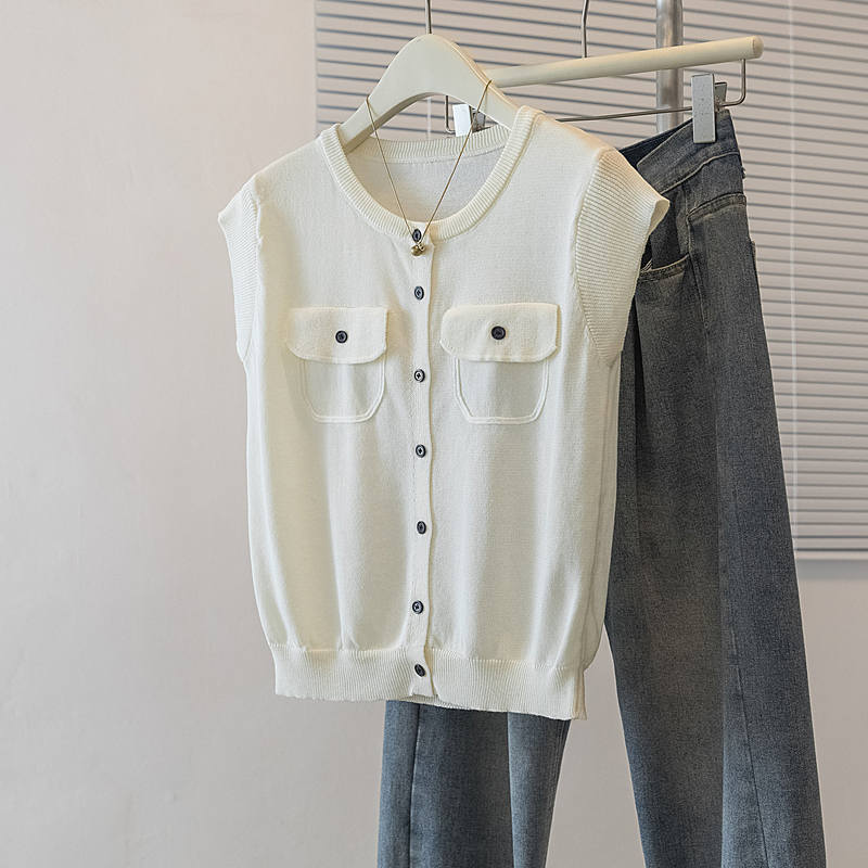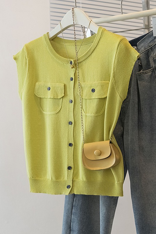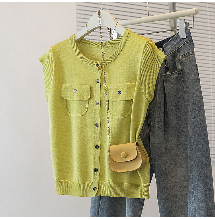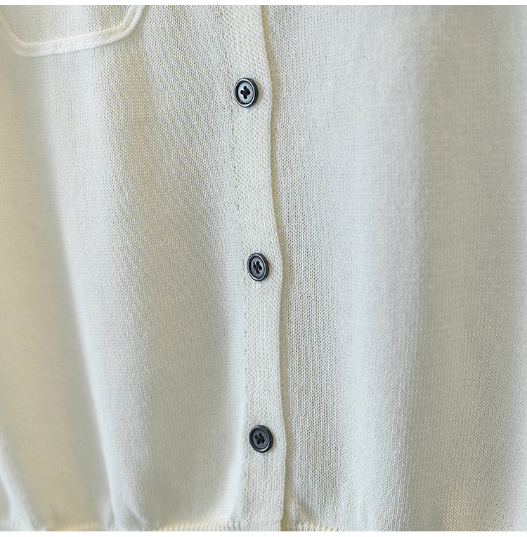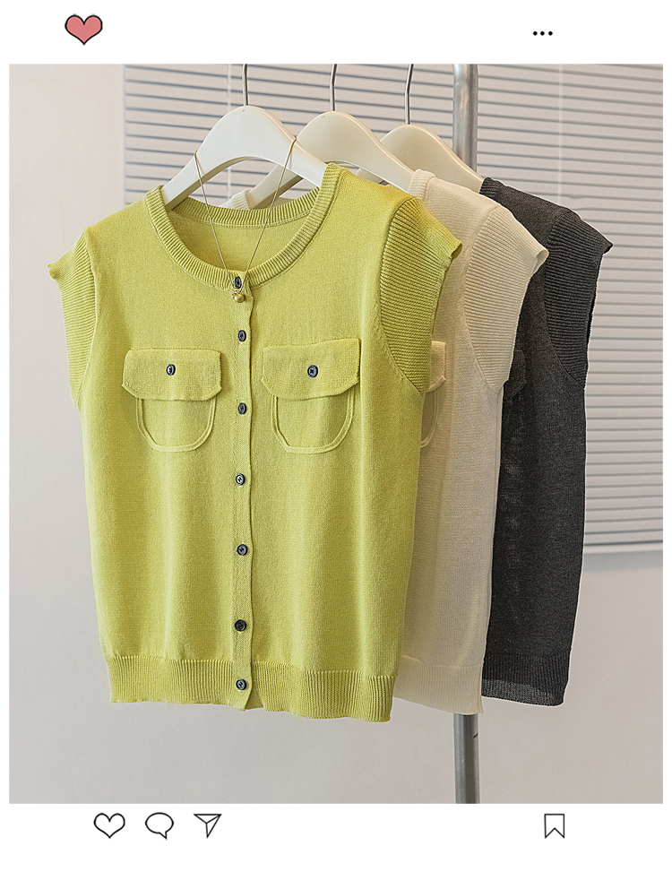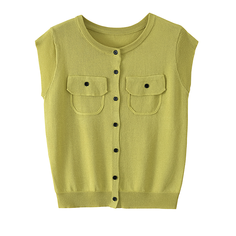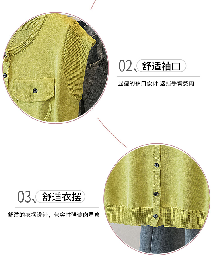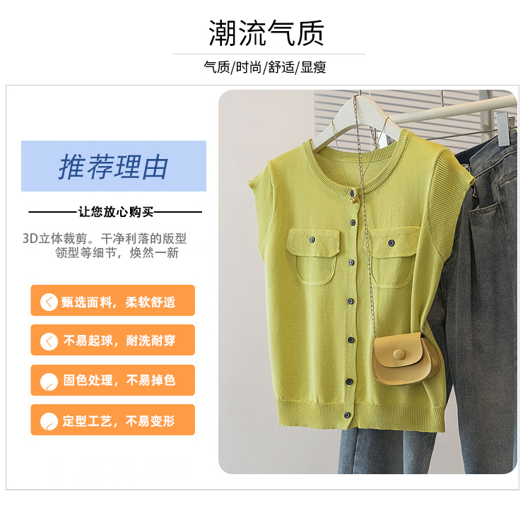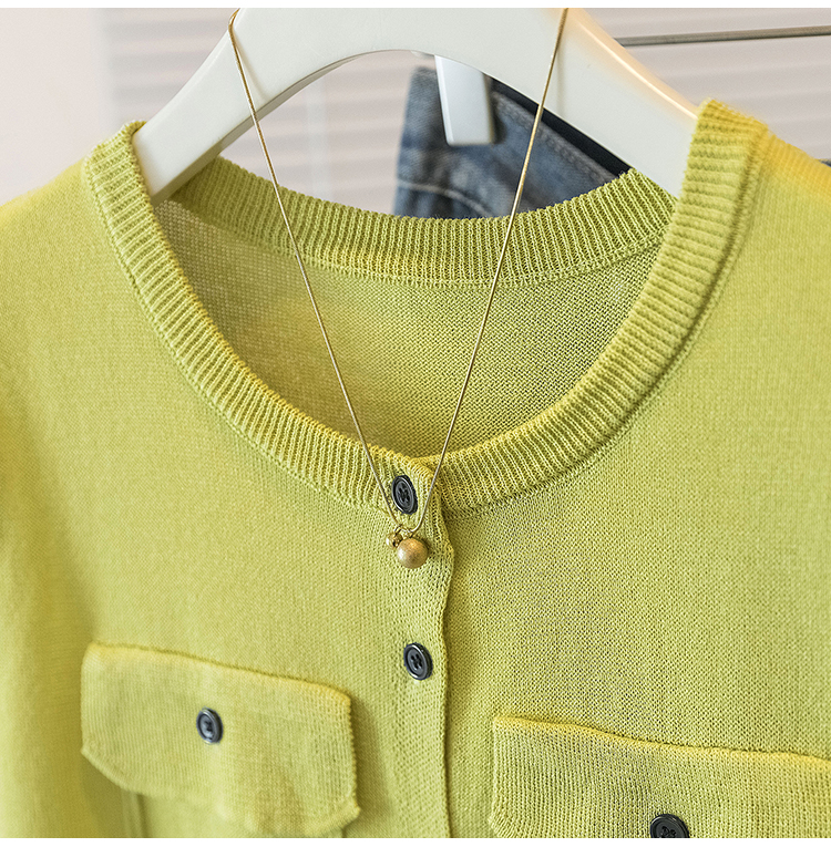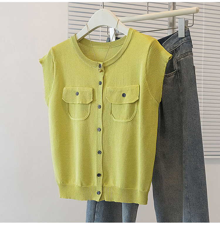 RY4133# 实拍大码短袖T恤韩系百搭小飞袖少女感圆领排扣双口袋针织开衫潮