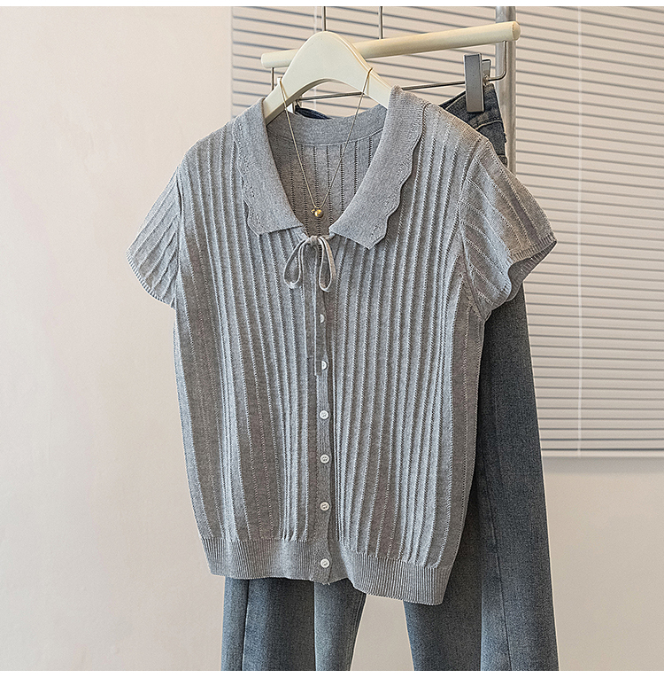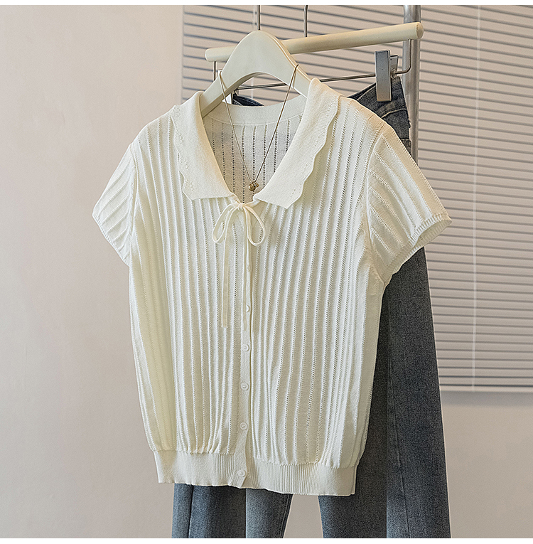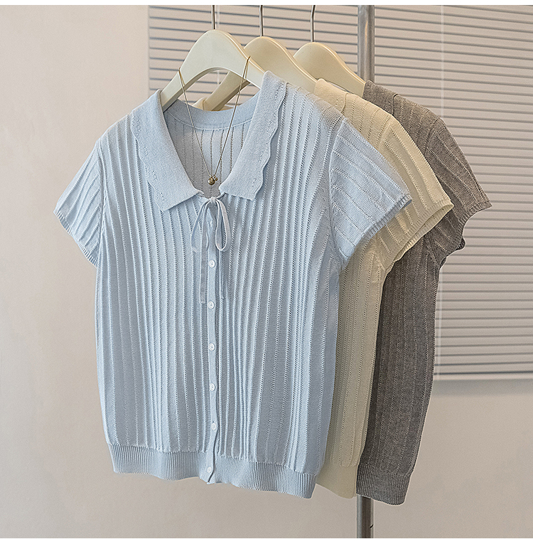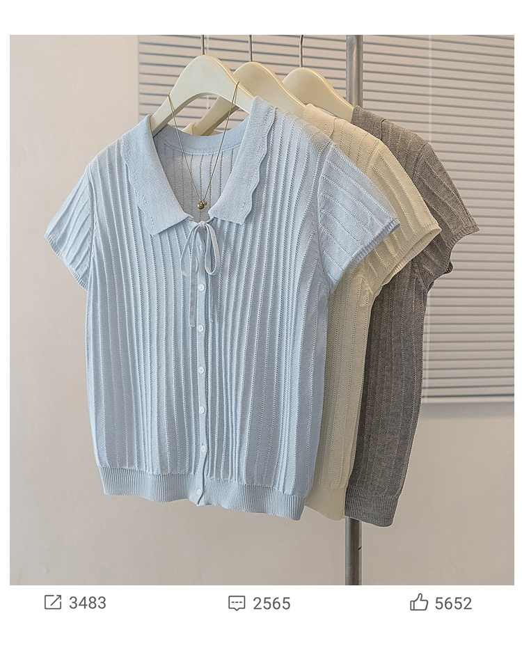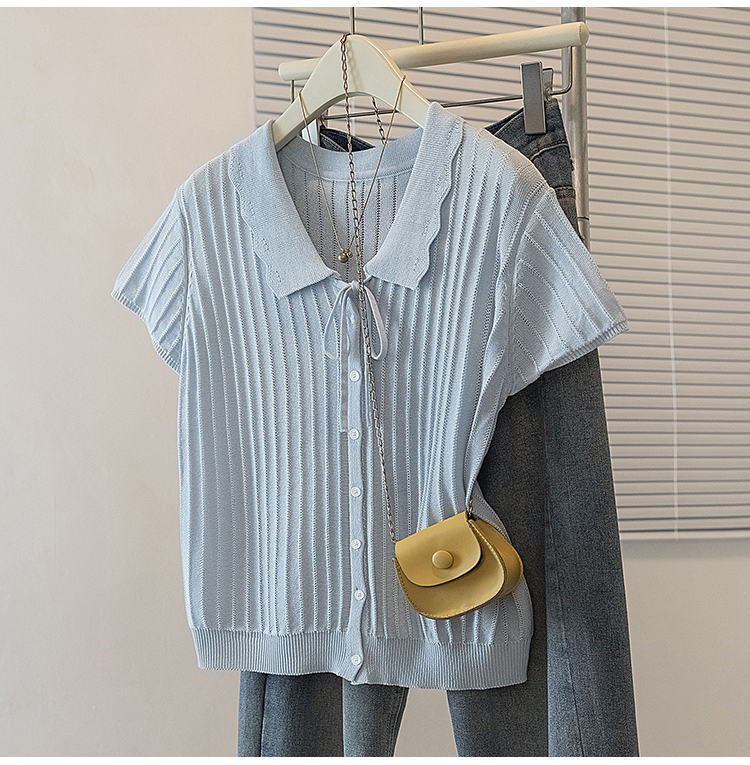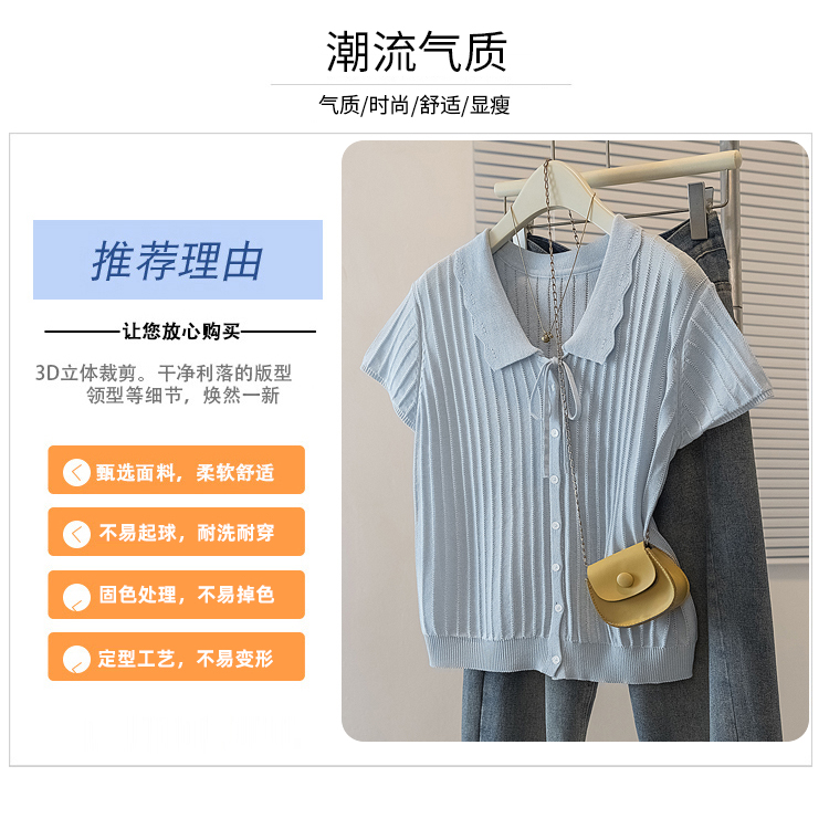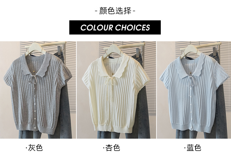 首页 > 女装批发-夏款 > 上衣 > RY4135# 实拍大码针织开衫短袖女26年夏季韩系花边翻领系带甜美单排扣上衣