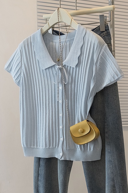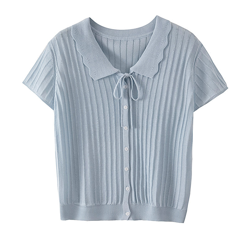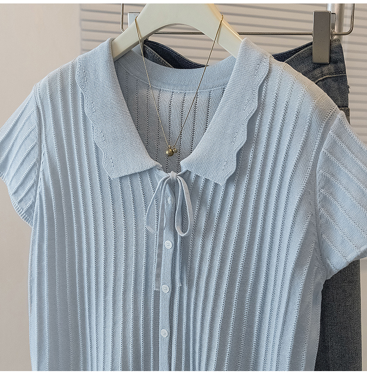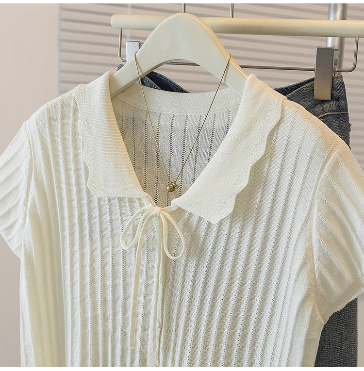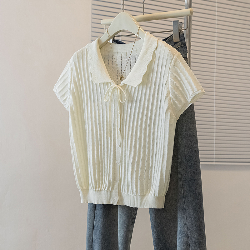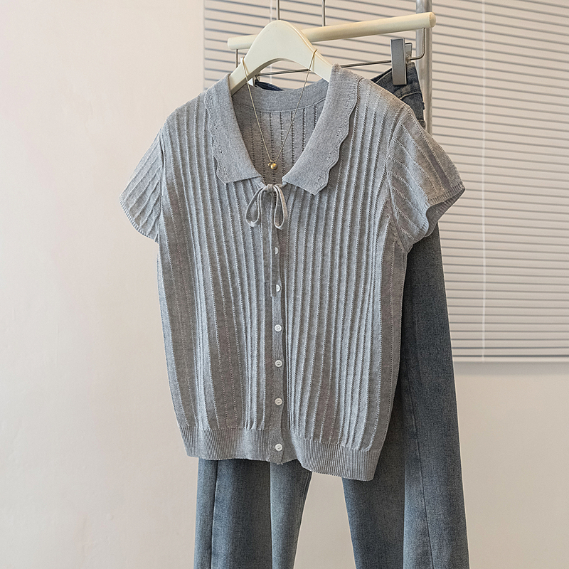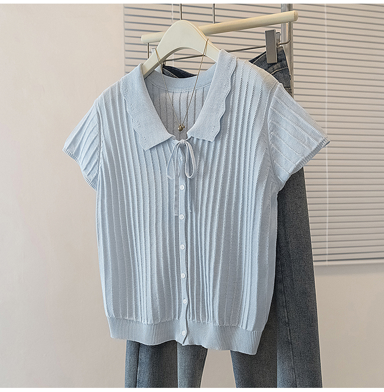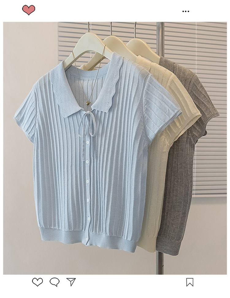 首页 > 女装批发-夏款 > 上衣 > RY4135# 实拍大码针织开衫短袖女26年夏季韩系花边翻领系带甜美单排扣上衣