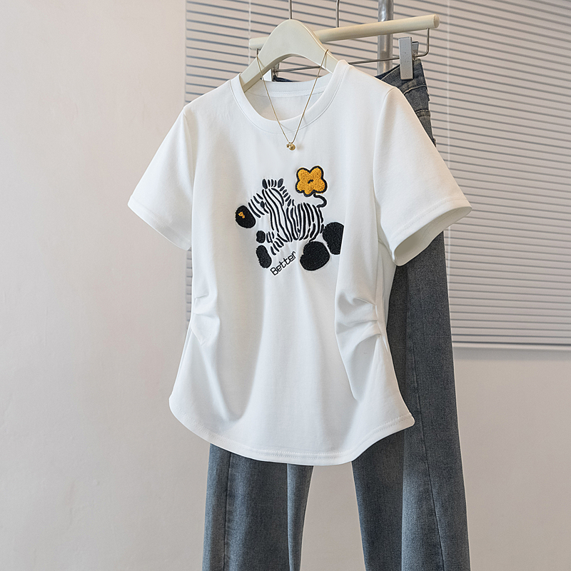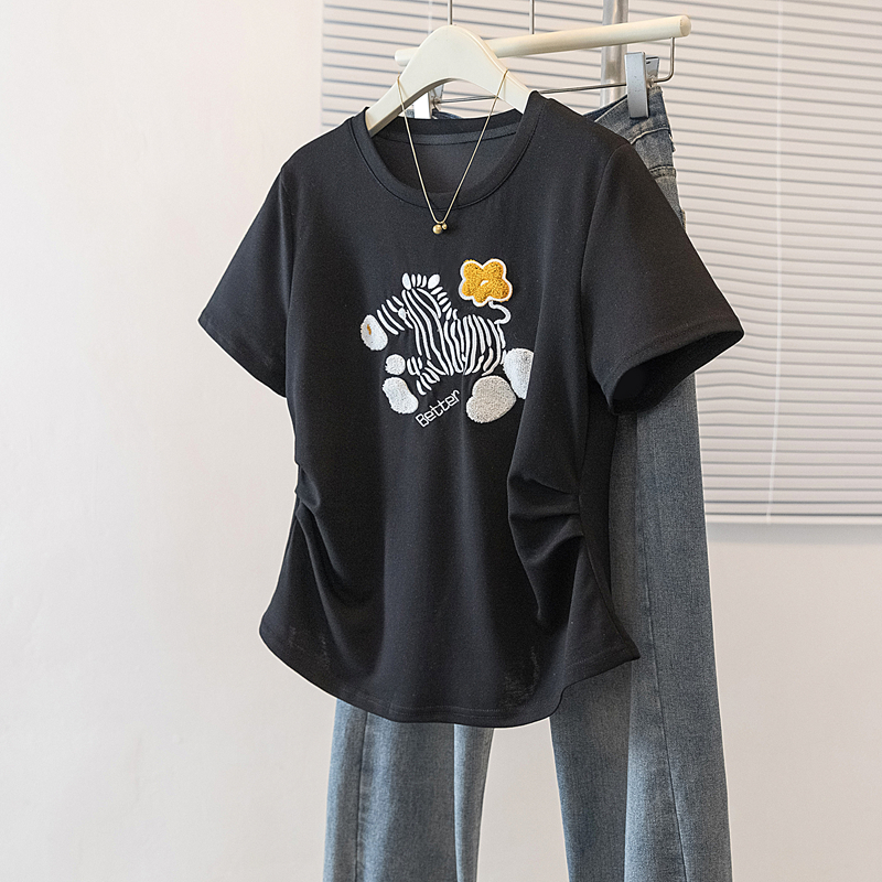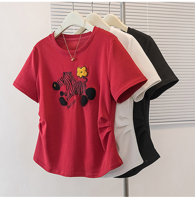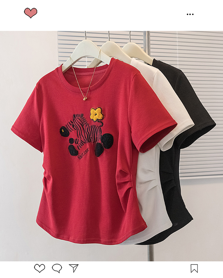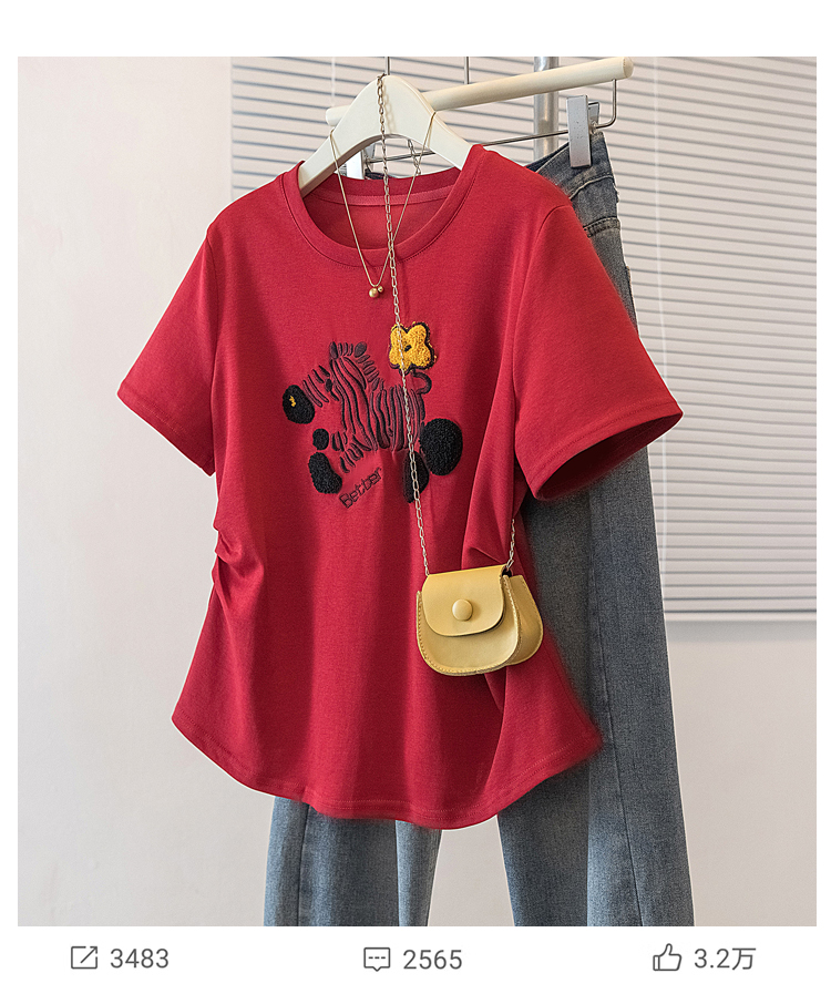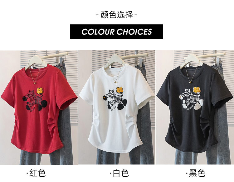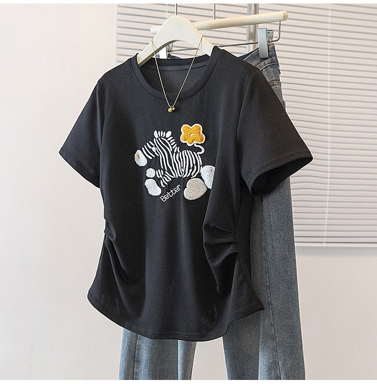 RY4144# 实拍大码女装刺绣斑马短袖T恤女2026夏季新款褶皱减龄百搭上衣潮