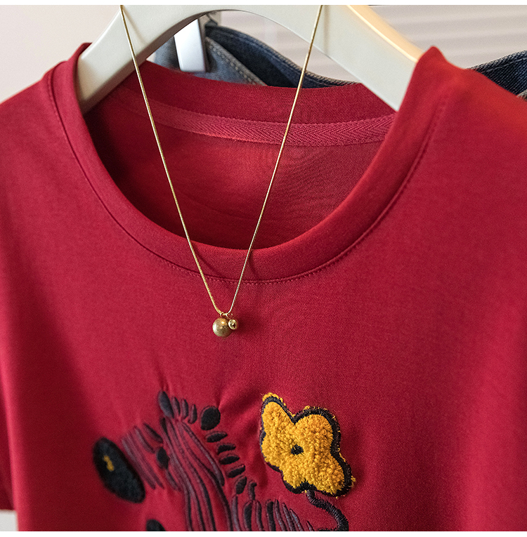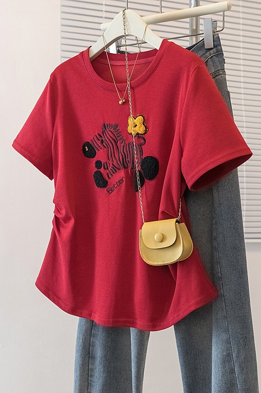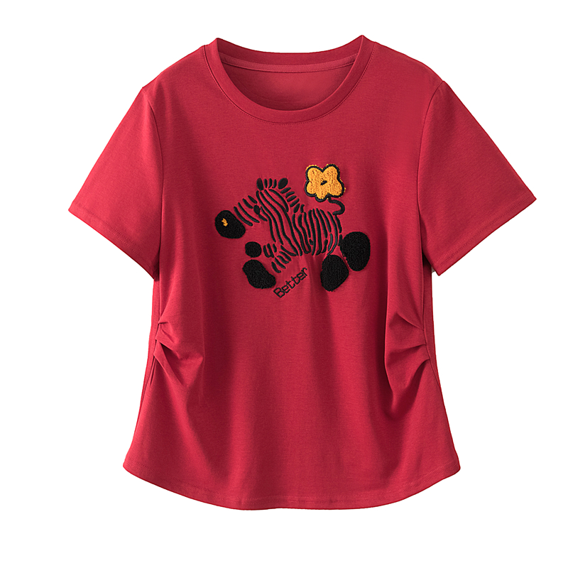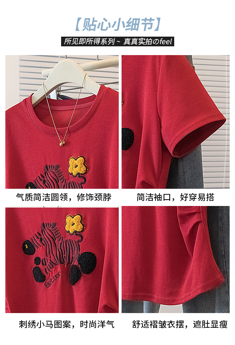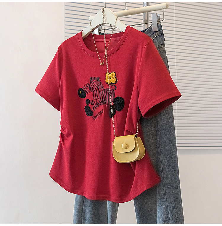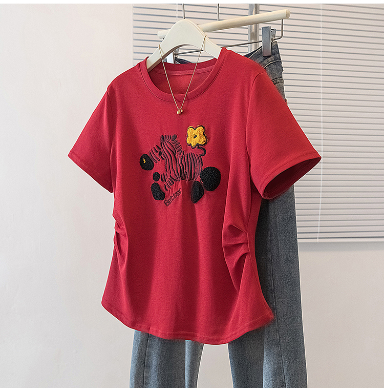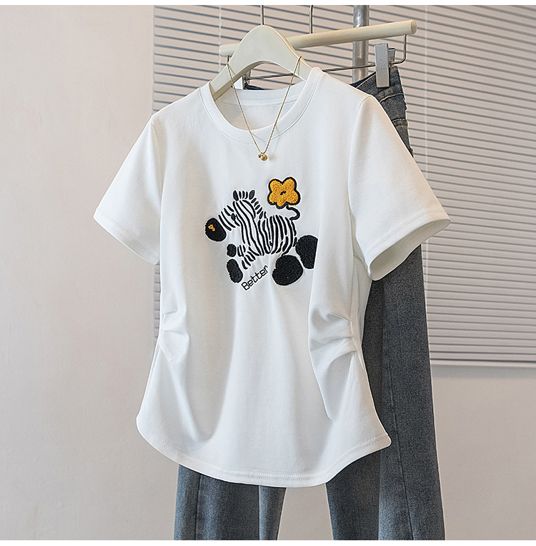 RY4144# 实拍大码女装刺绣斑马短袖T恤女2026夏季新款褶皱减龄百搭上衣潮