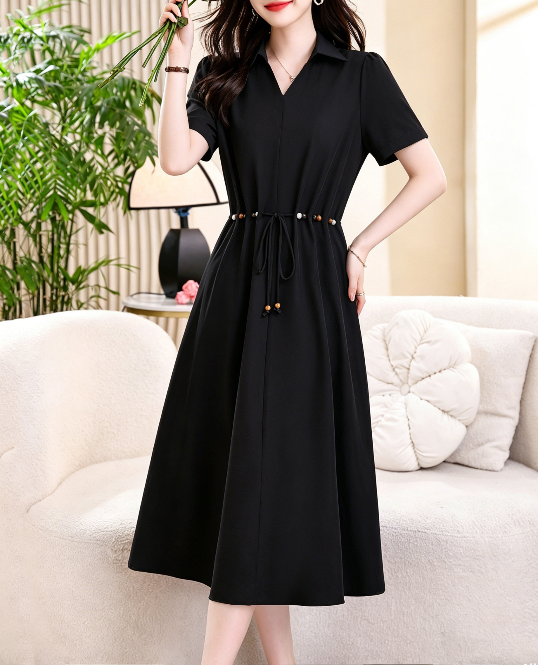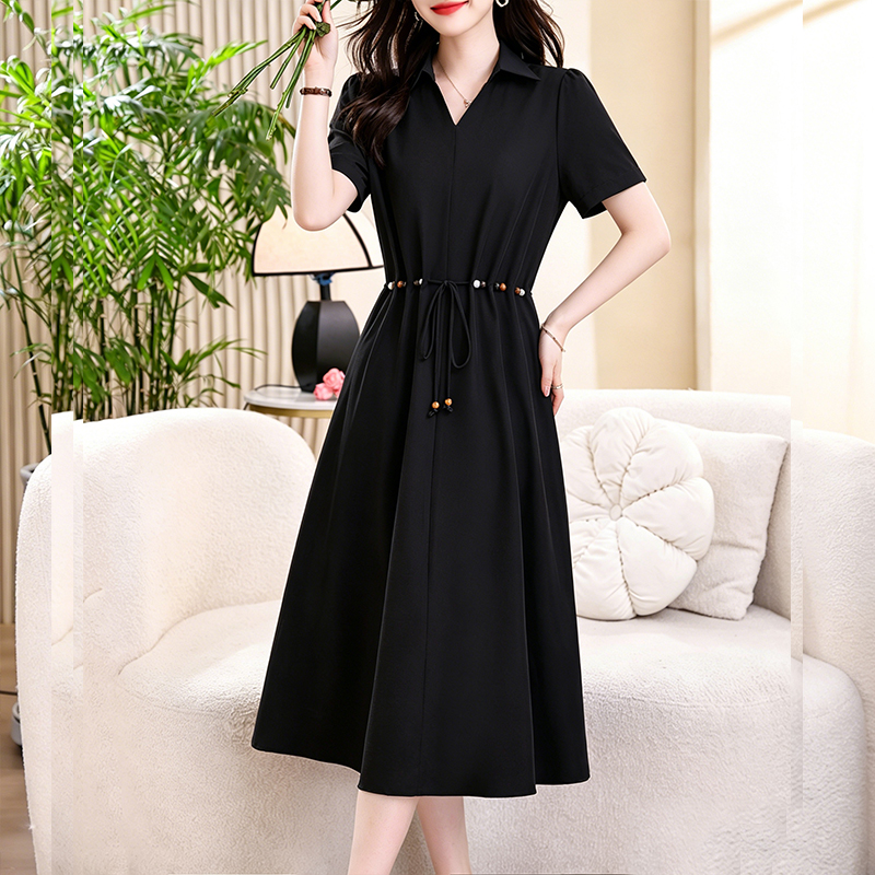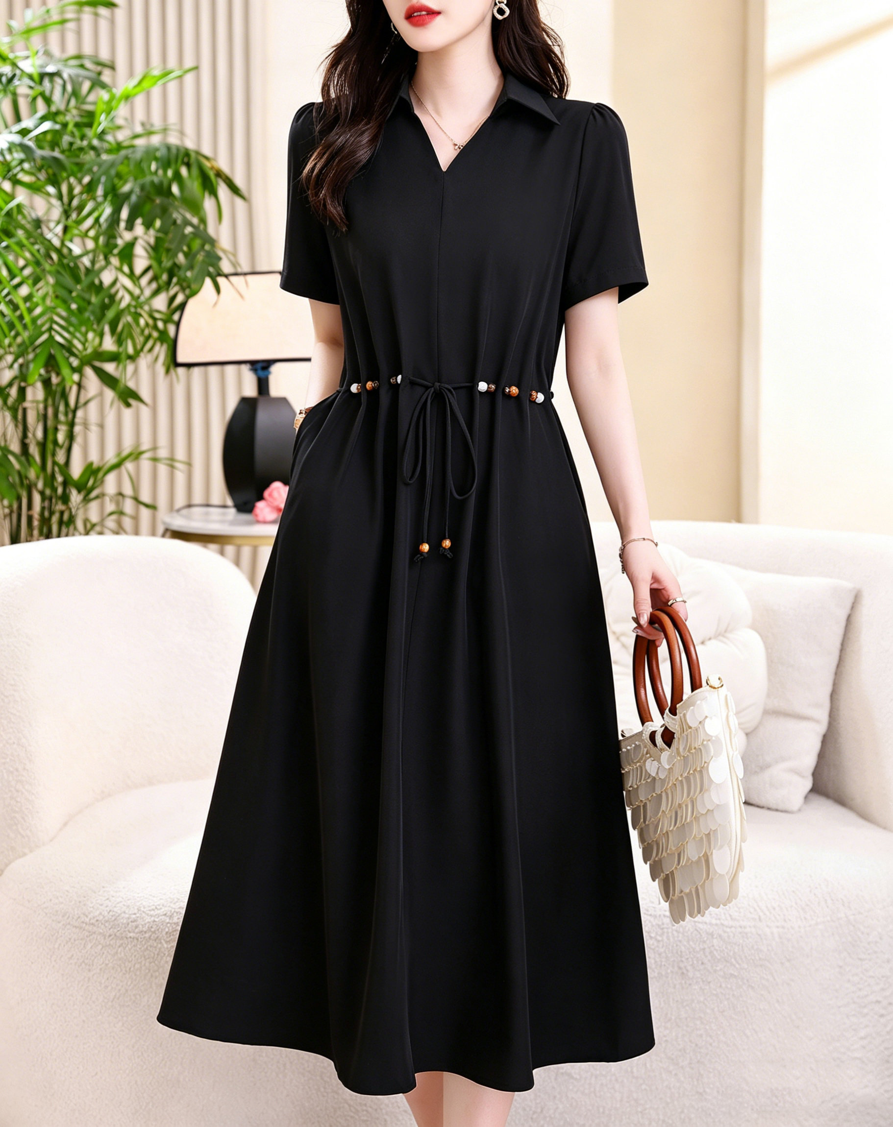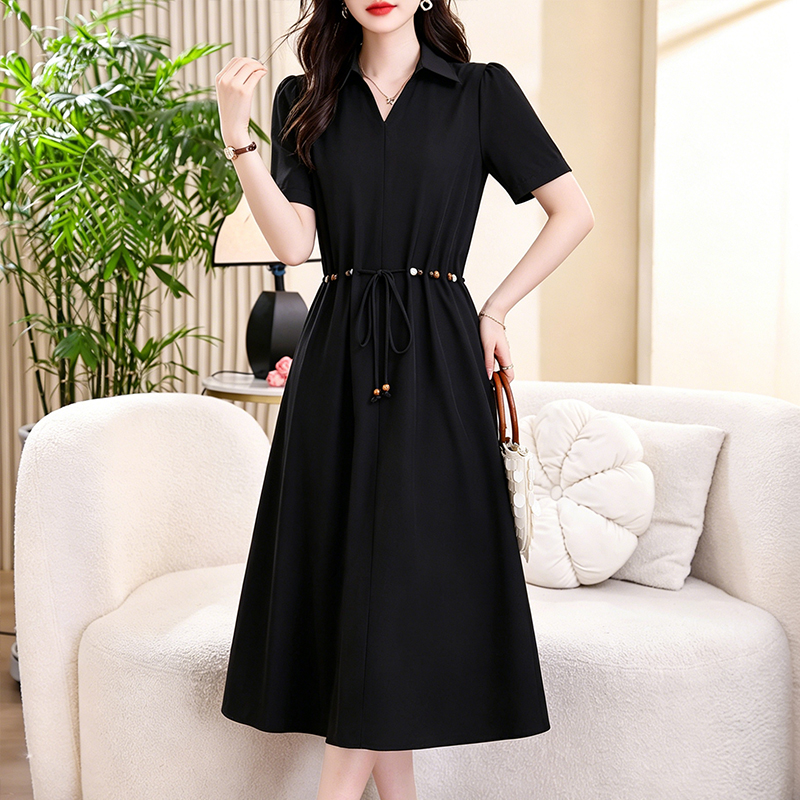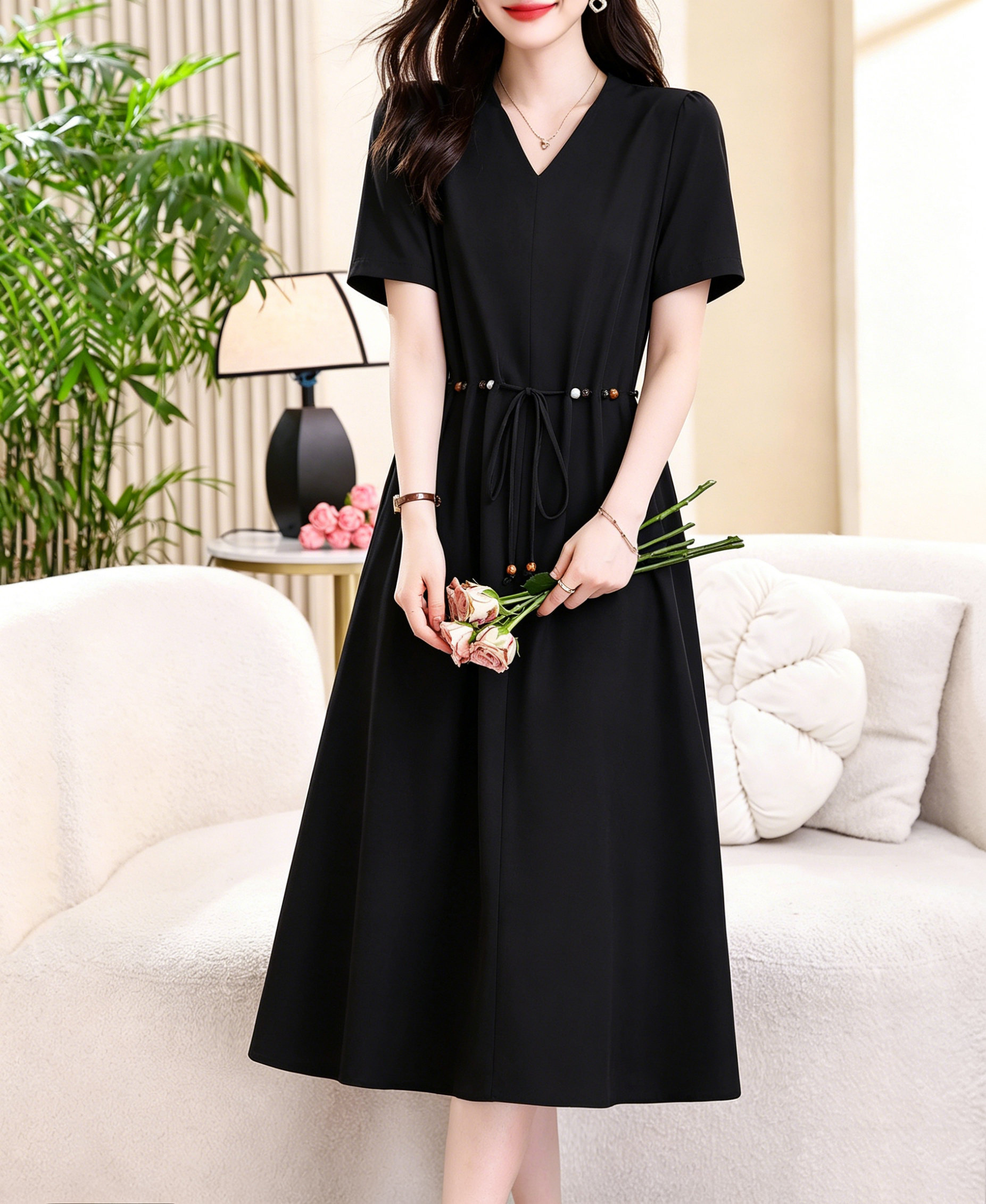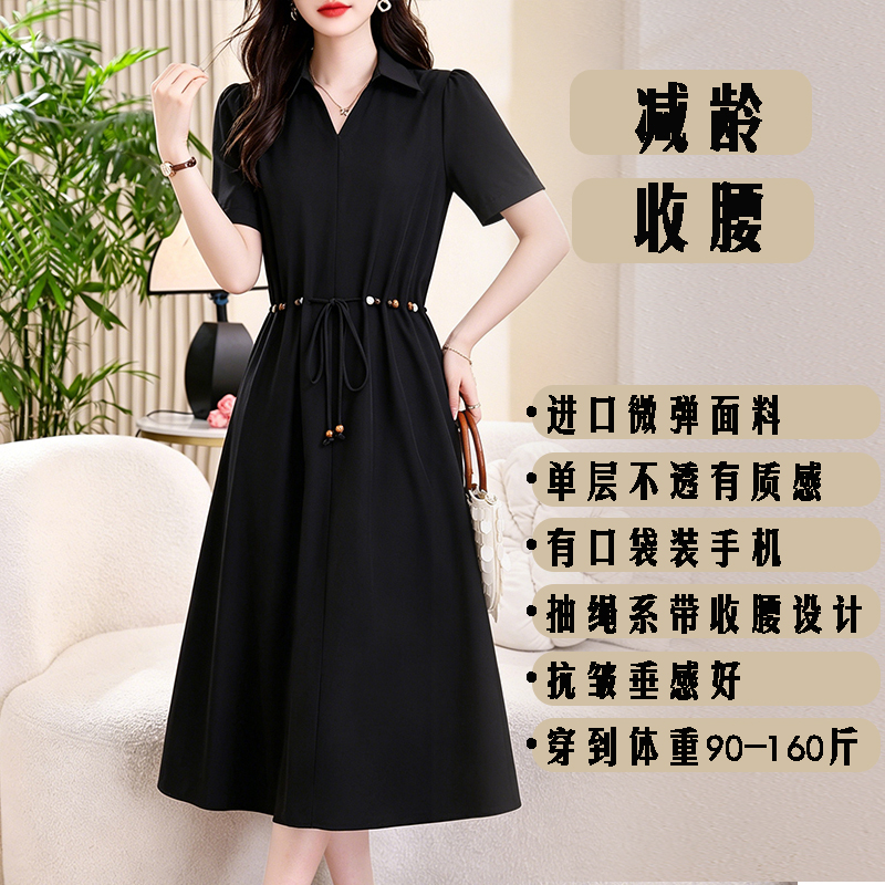 RY4159# 实拍2026夏季新款单层不透有拼接减龄透气V领花边系带短袖连衣裙