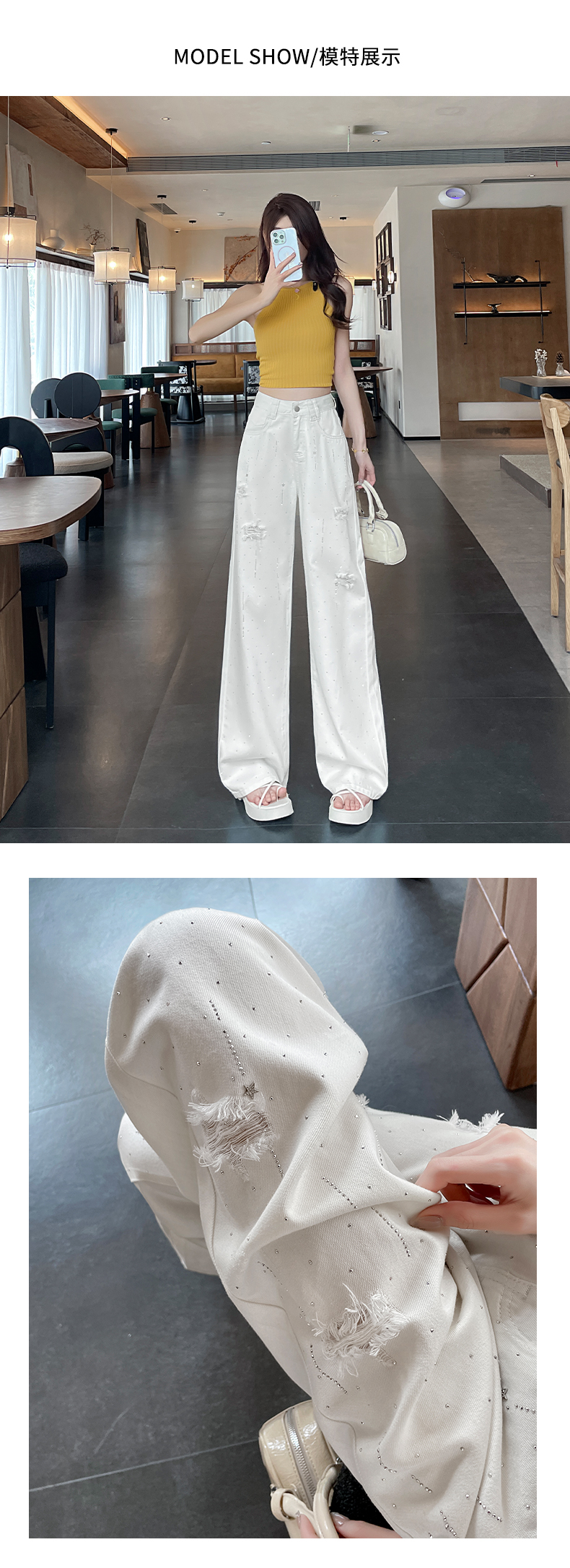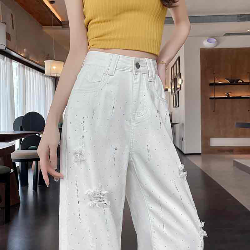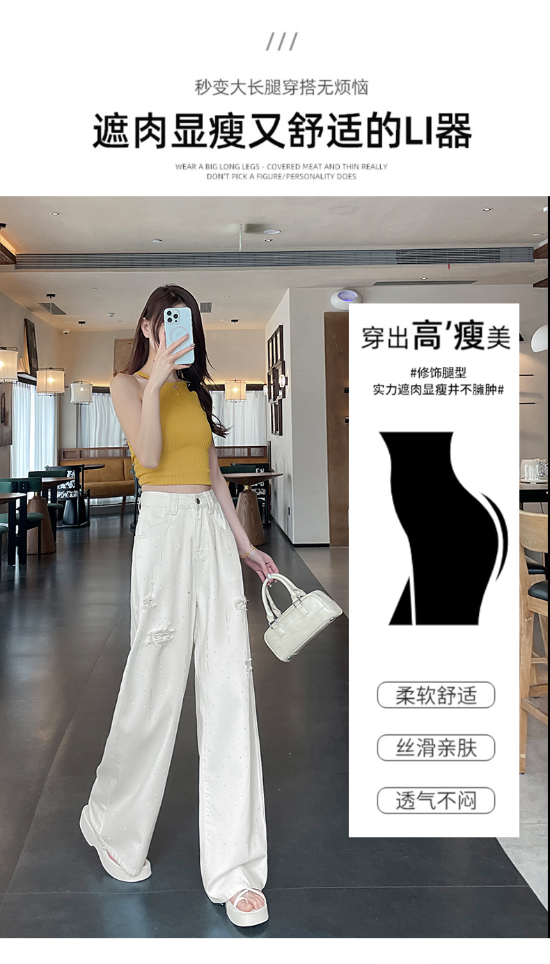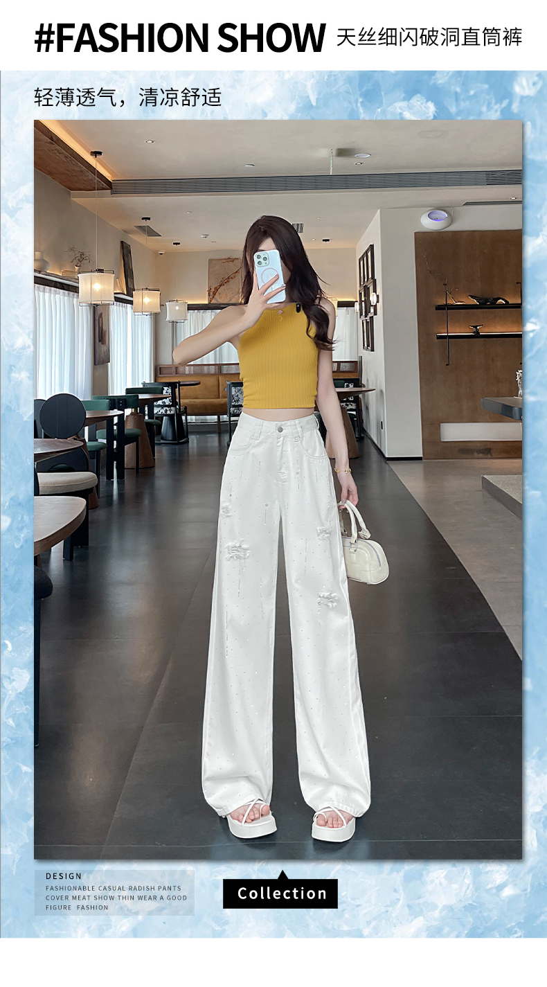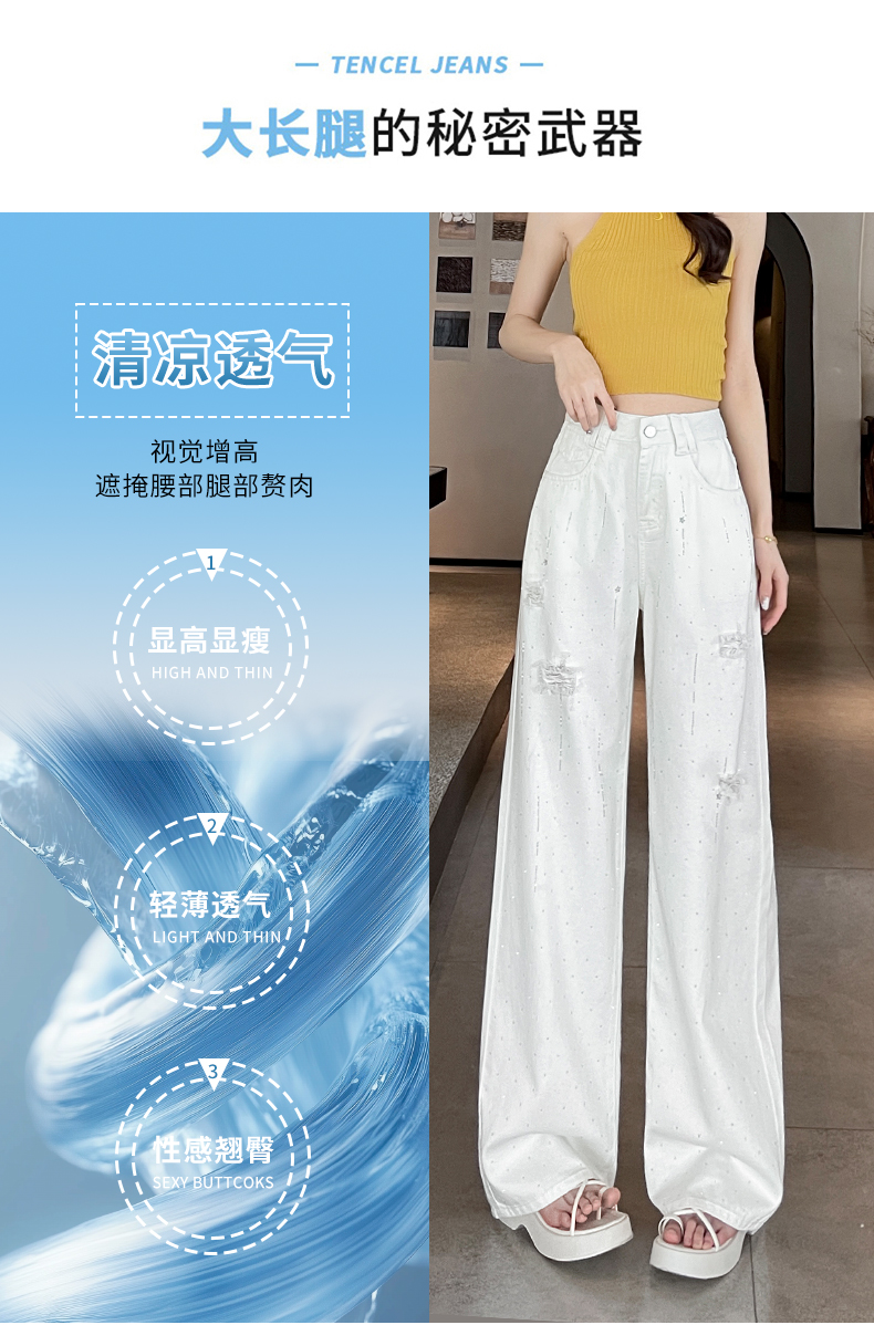 RY4164# 烫钻白色冰丝阔腿牛仔裤女2026夏高腰宽松破洞天丝垂感直筒拖地裤