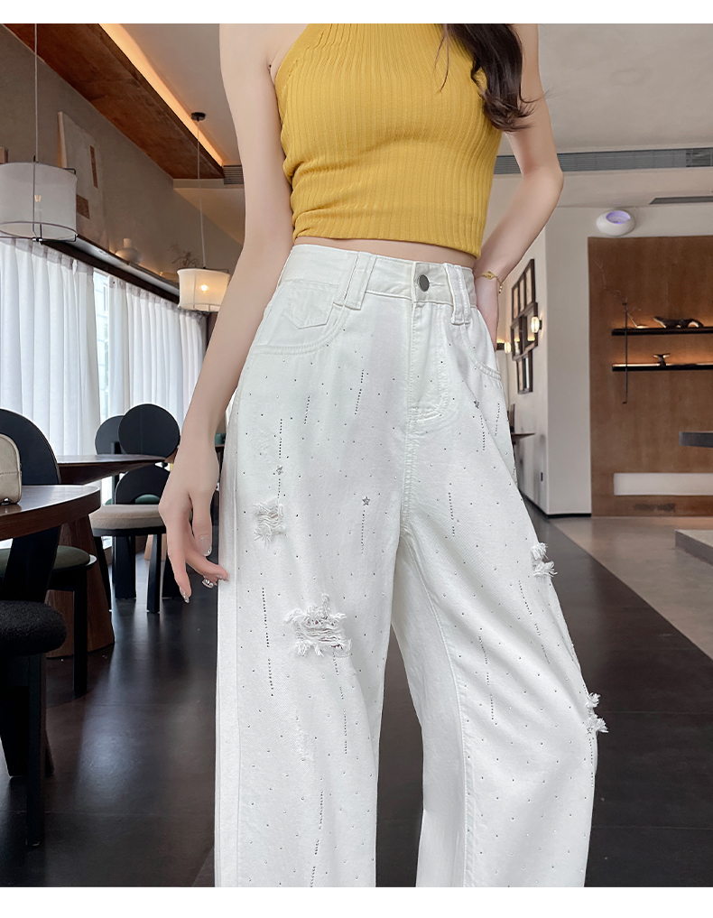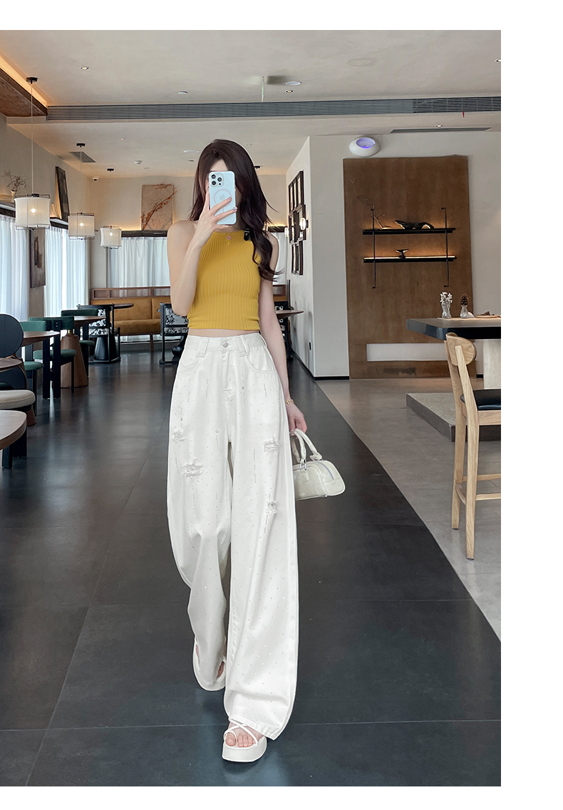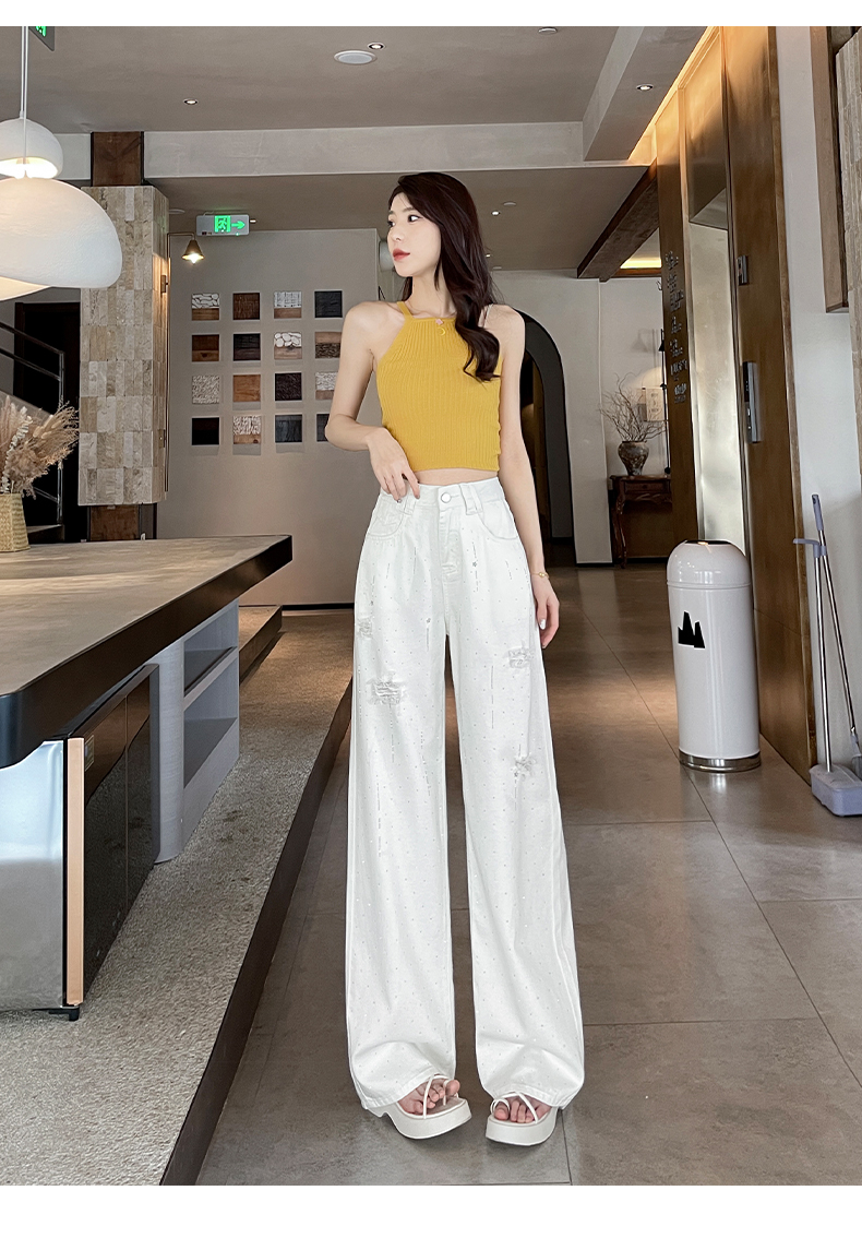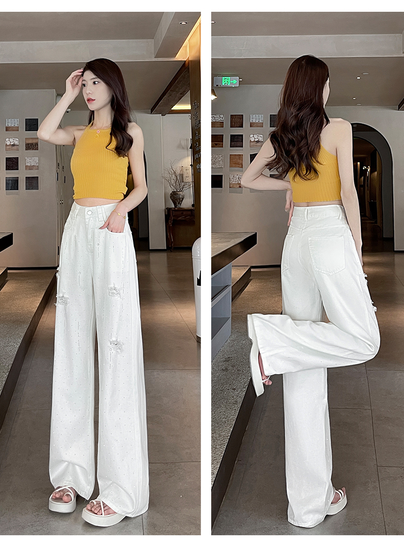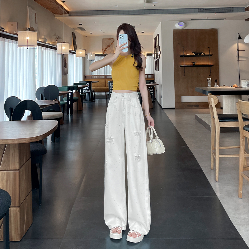 RY4164# 烫钻白色冰丝阔腿牛仔裤女2026夏高腰宽松破洞天丝垂感直筒拖地裤