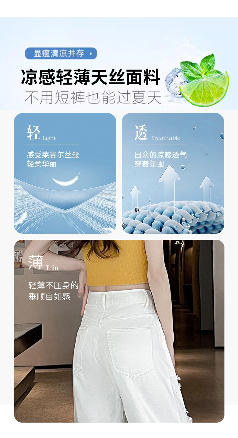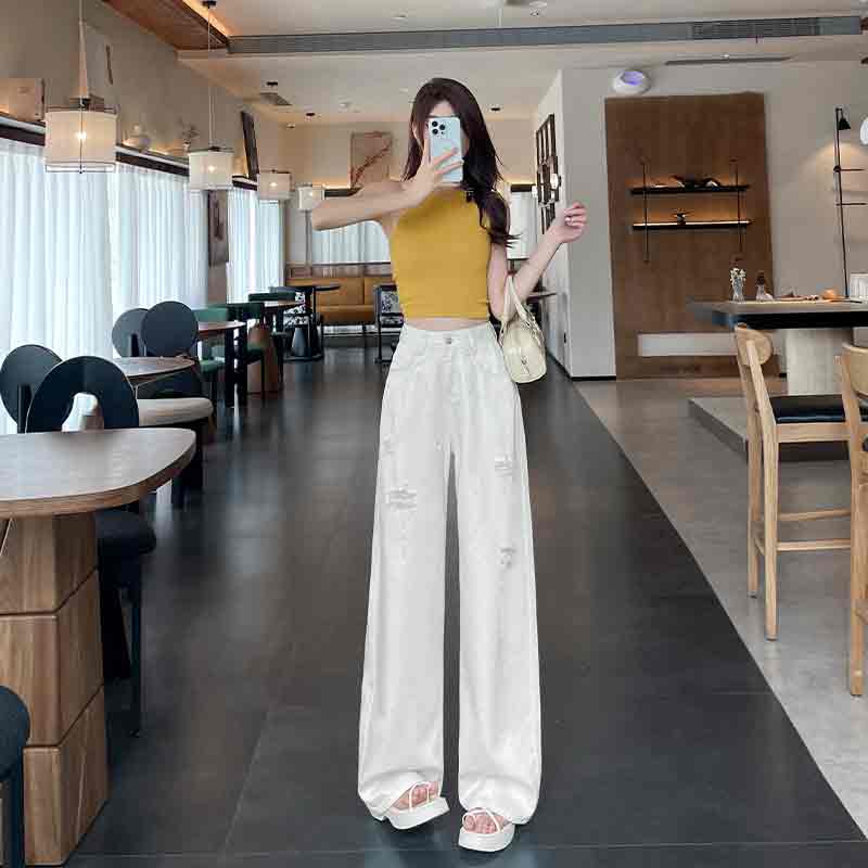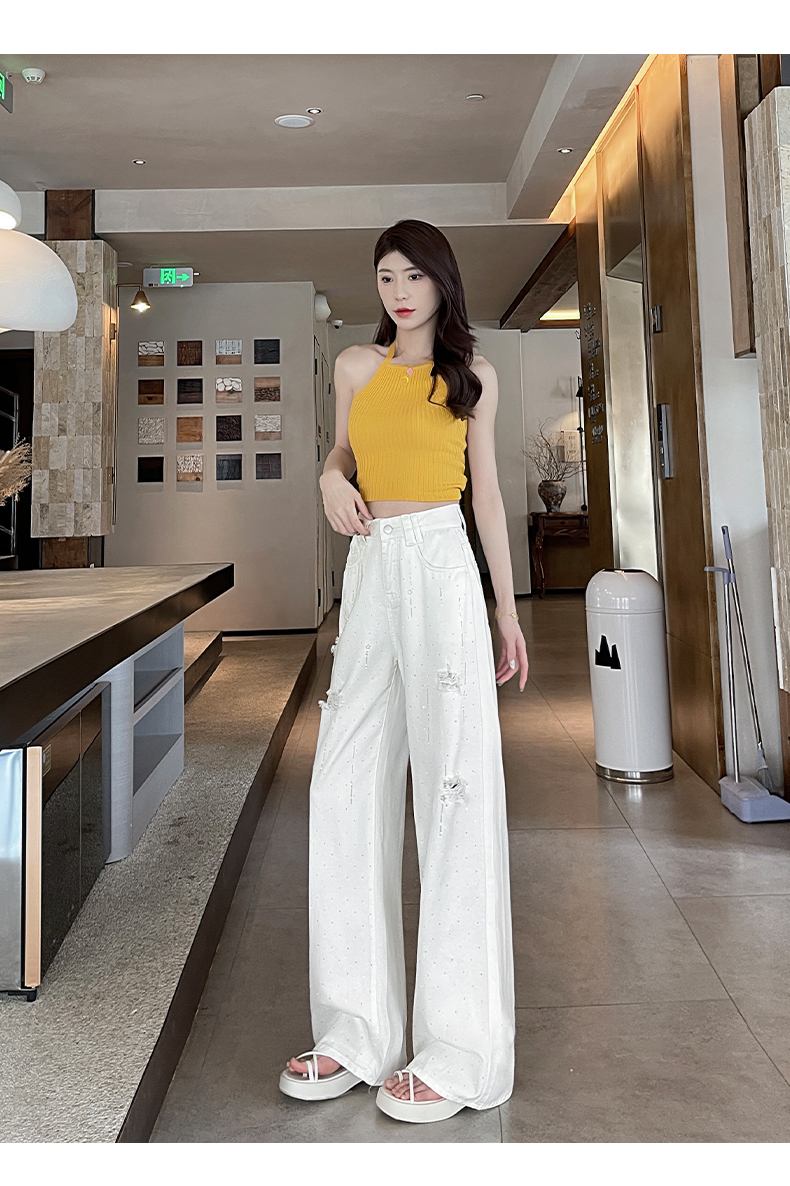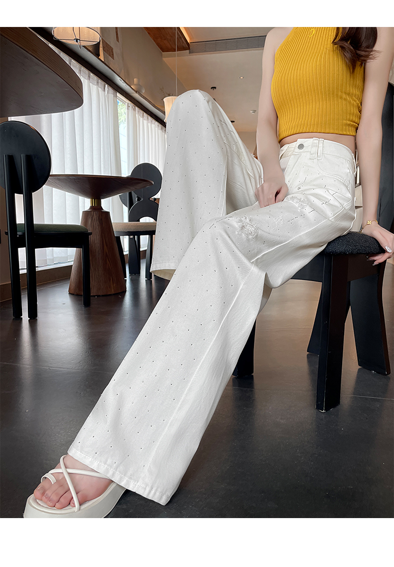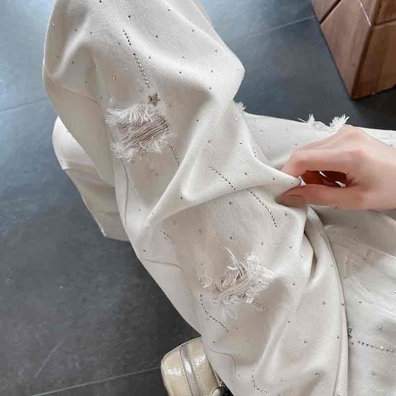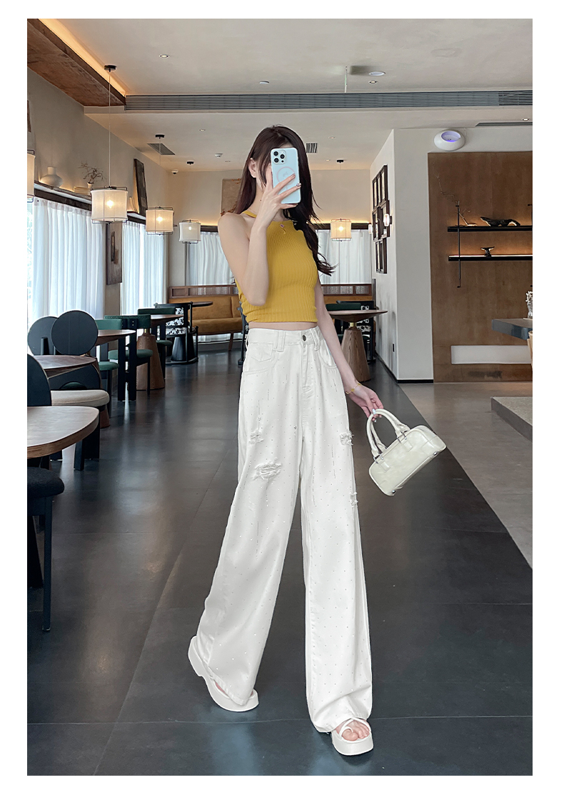 RY4164# 烫钻白色冰丝阔腿牛仔裤女2026夏高腰宽松破洞天丝垂感直筒拖地裤