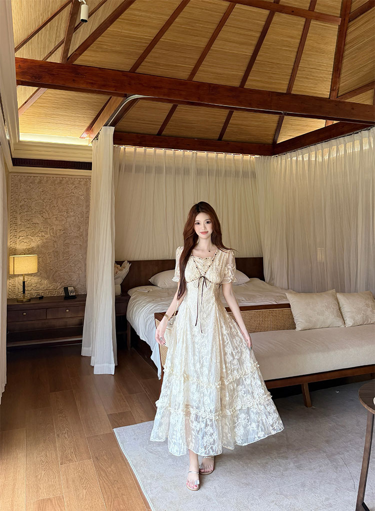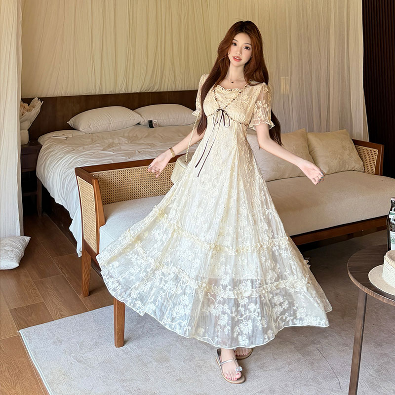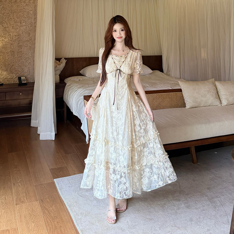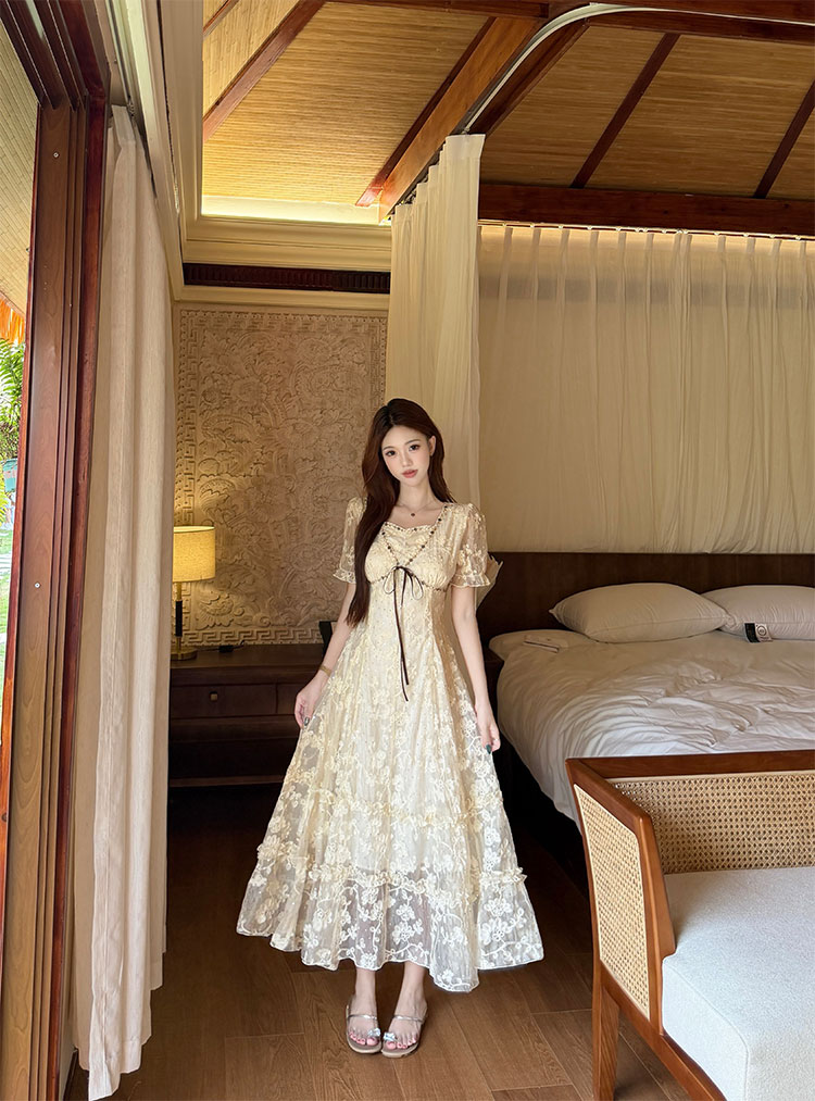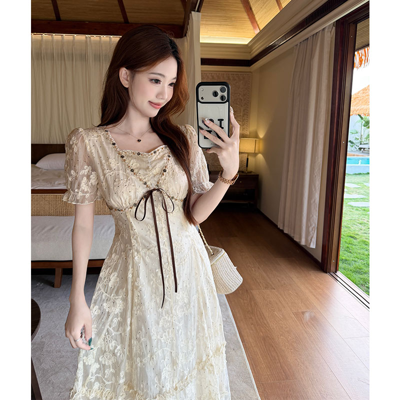 RY4173# 实拍~大码栗色花藤法式温柔风蕾丝连衣裙女泡泡袖收腰显瘦长裙子