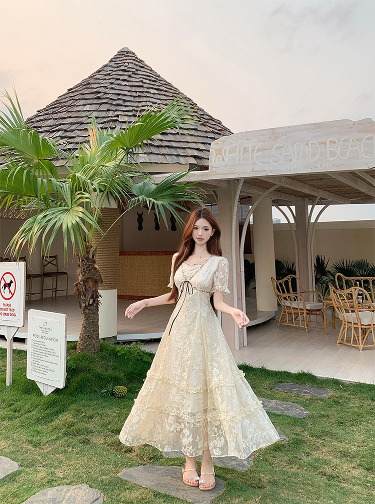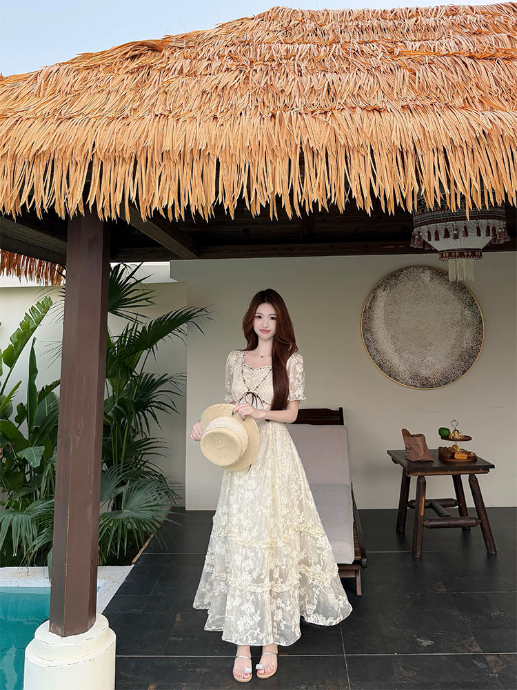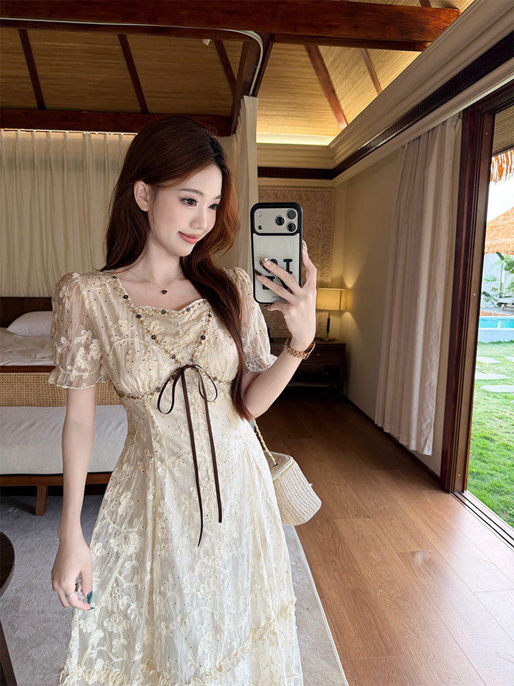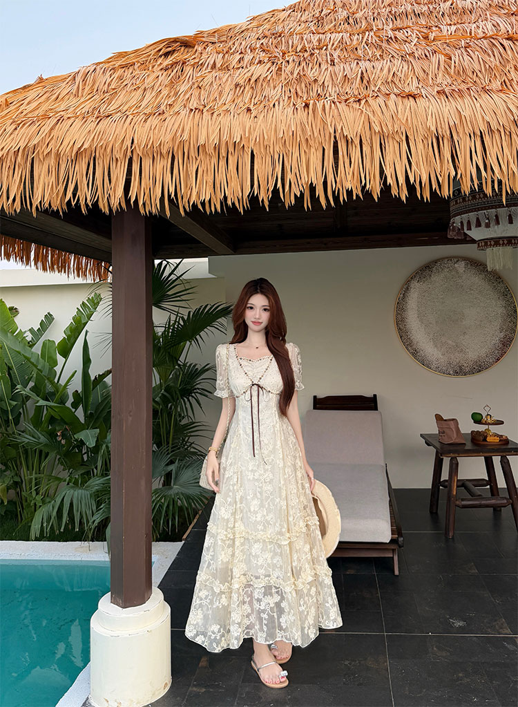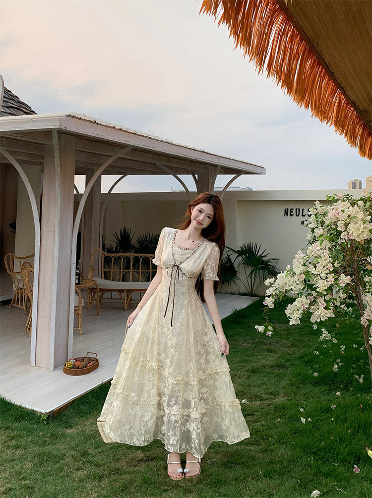RY4173# 实拍~大码栗色花藤法式温柔风蕾丝连衣裙女泡泡袖收腰显瘦长裙子