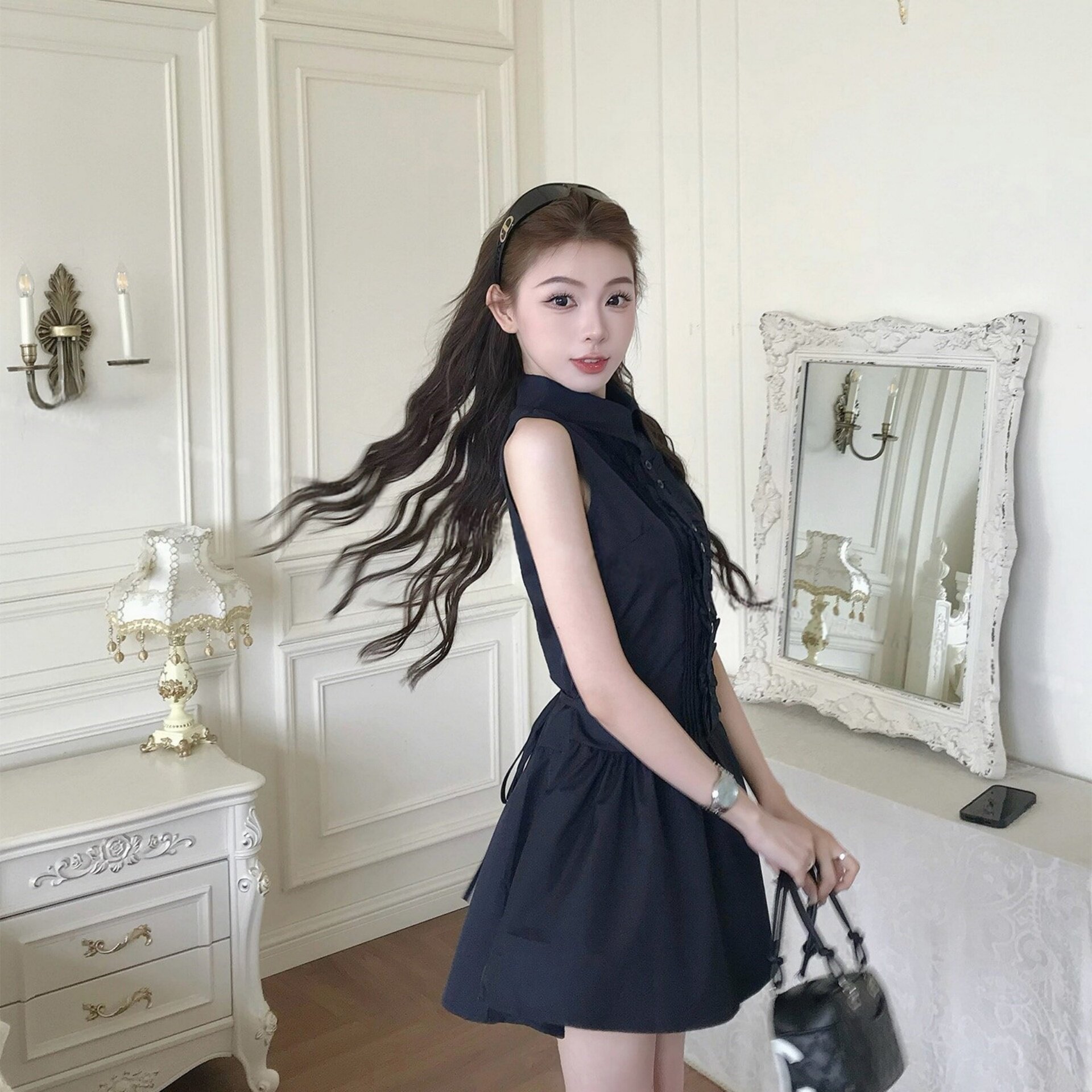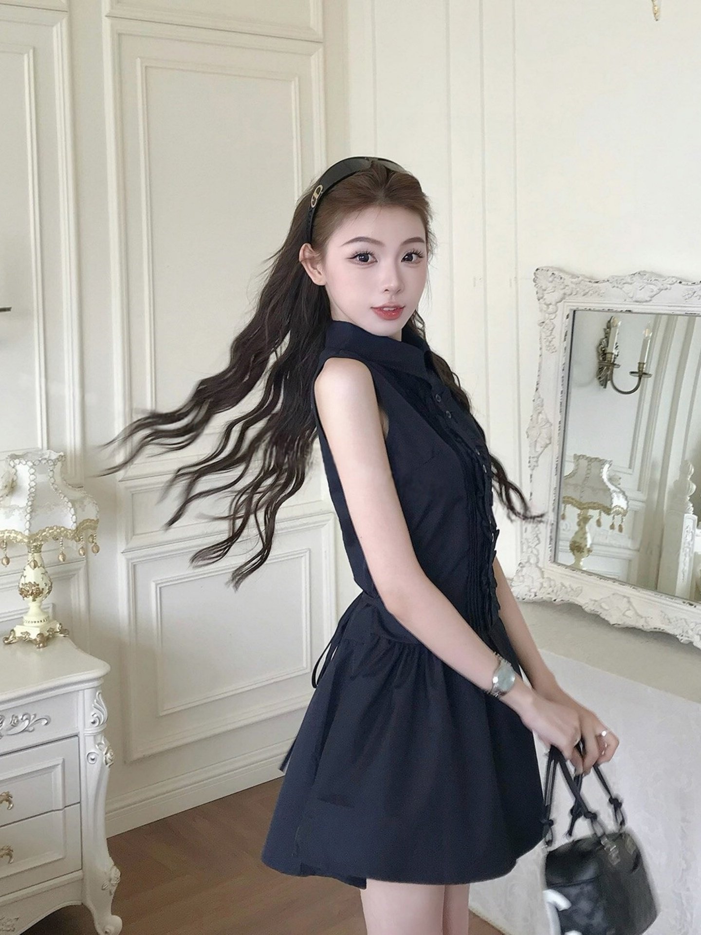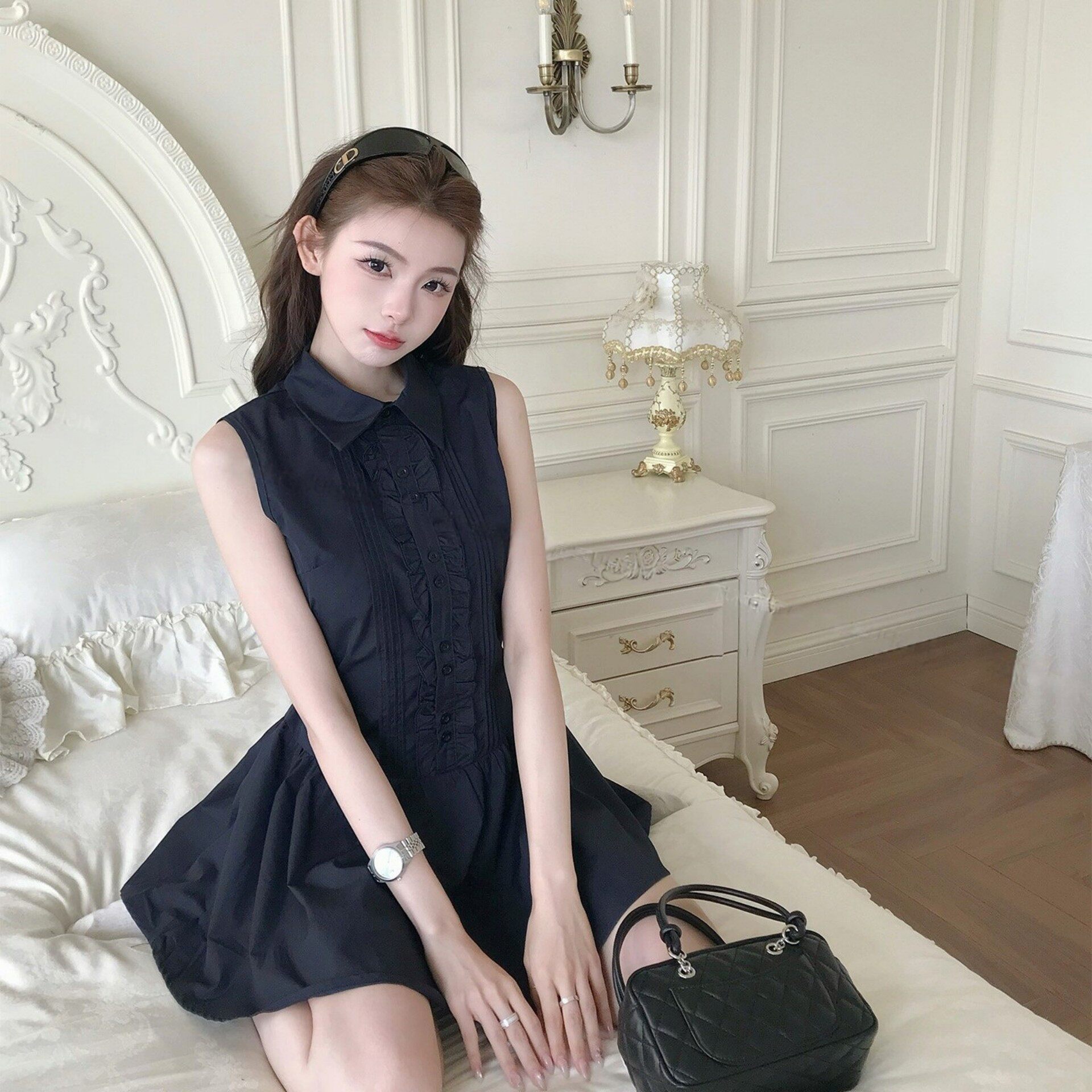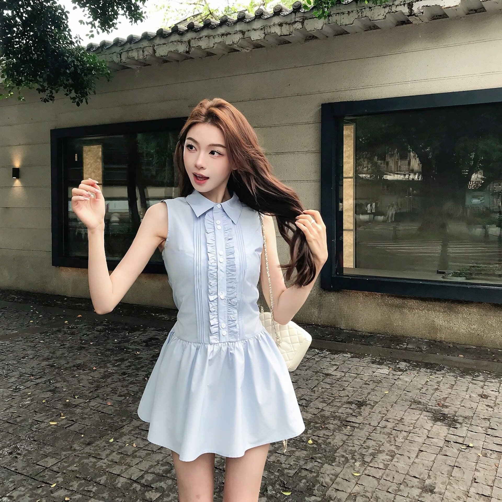 RY4181# 特别漂亮掐腰小裙子女夏小个子连衣裙polo领法式无袖背心娃娃短裙