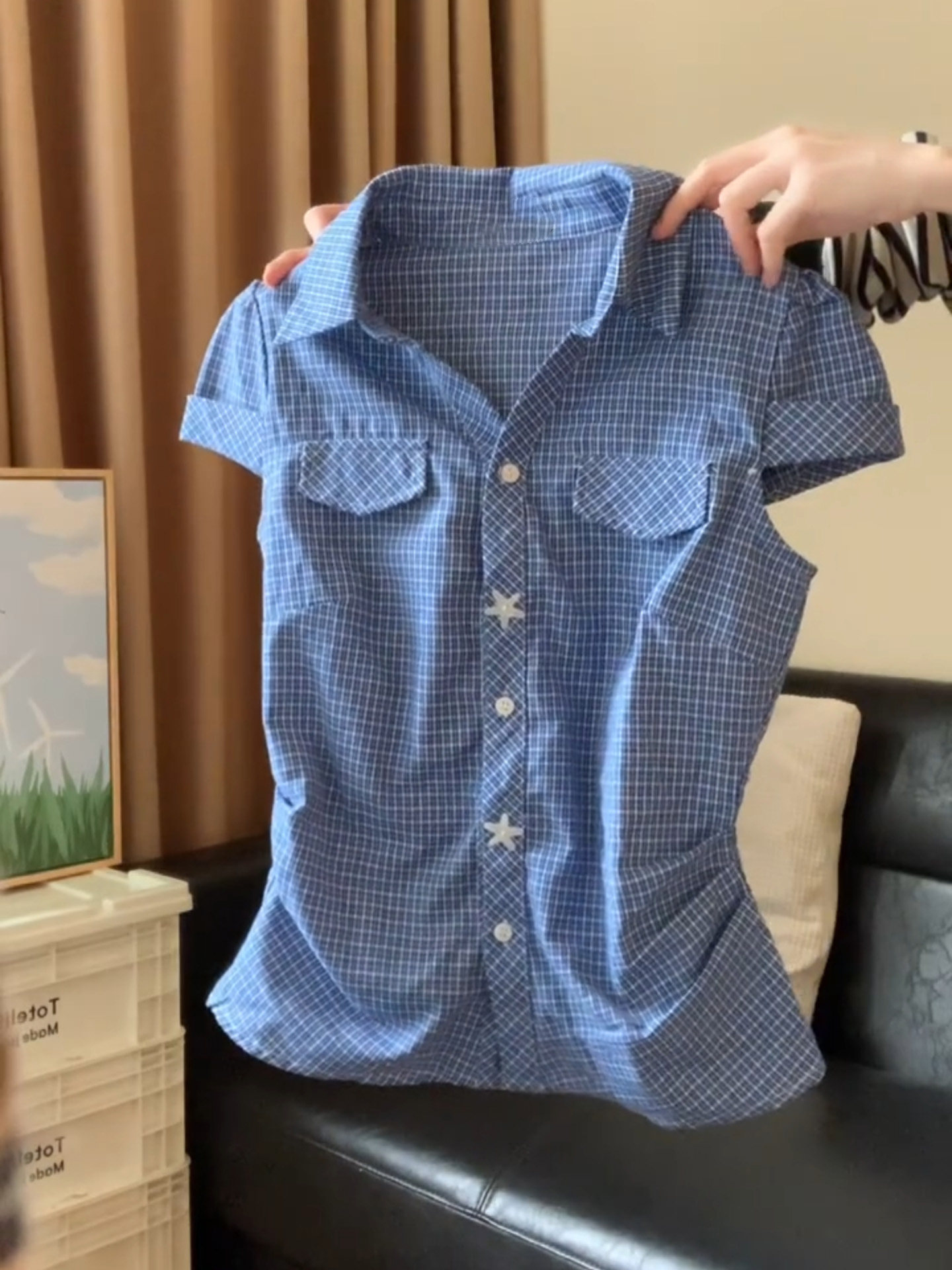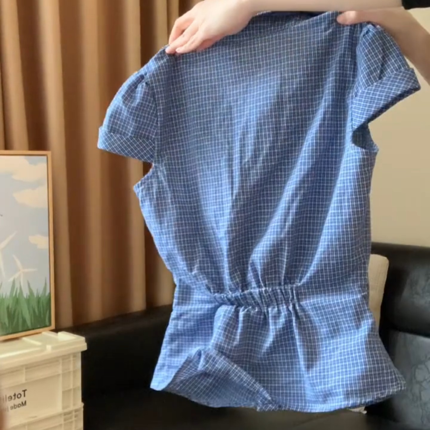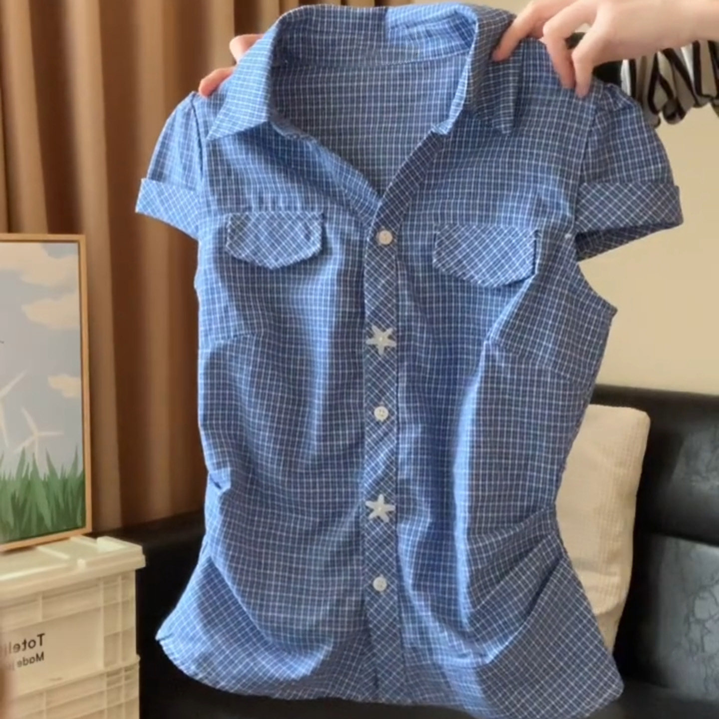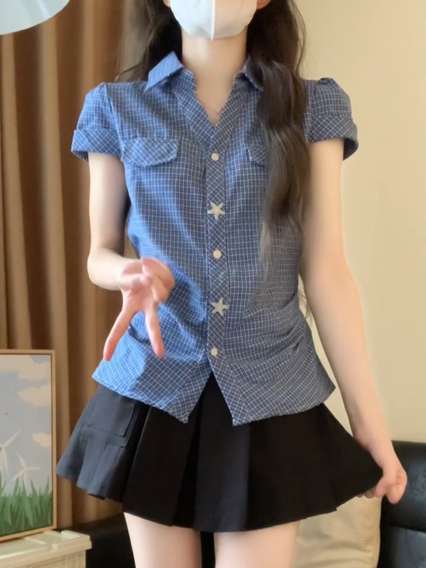 RY4182#美式复古掐腰修身显瘦格子短袖衬衫女夏季格纹衬衣甜辣风短款上衣