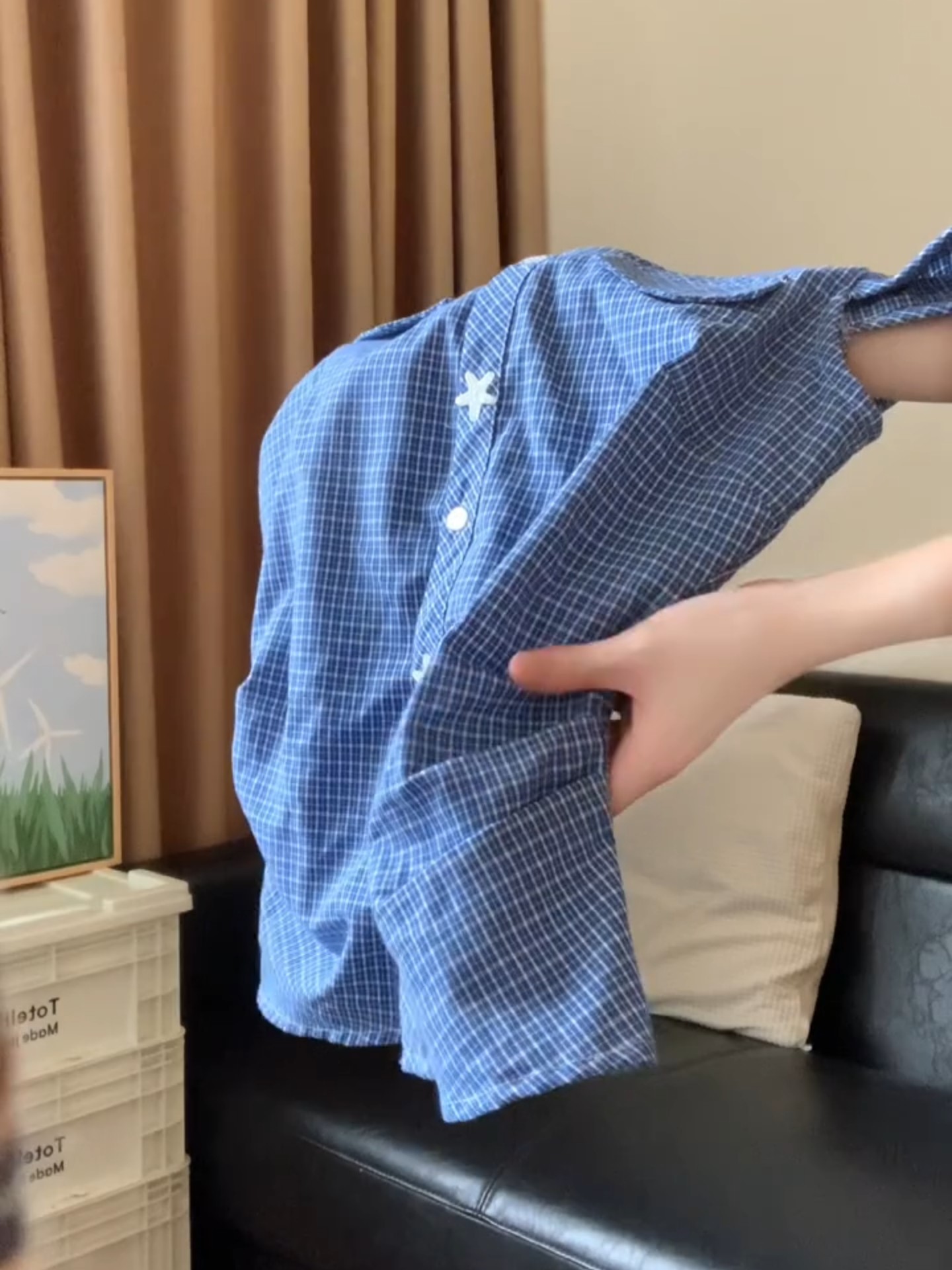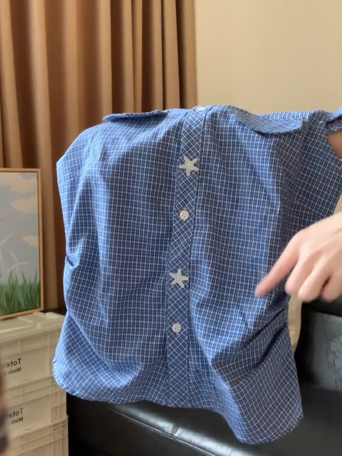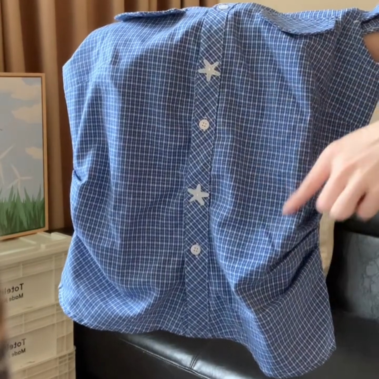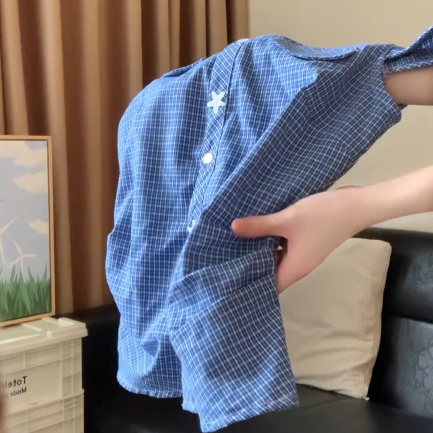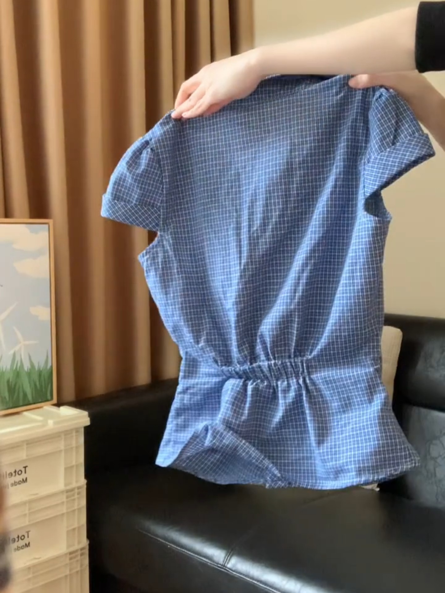 RY4182#美式复古掐腰修身显瘦格子短袖衬衫女夏季格纹衬衣甜辣风短款上衣