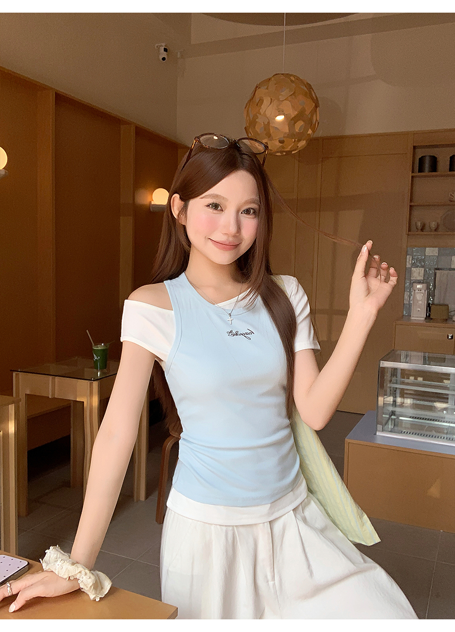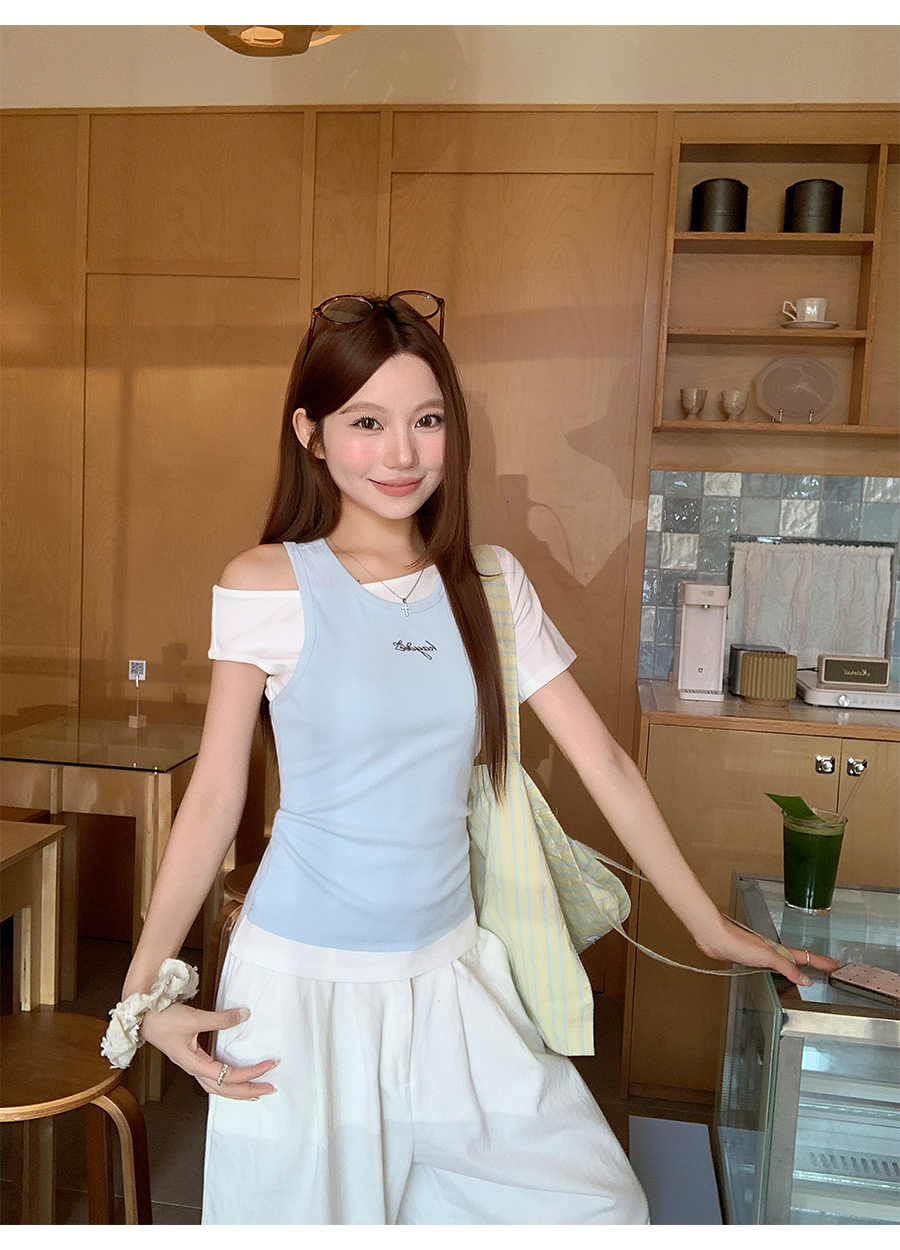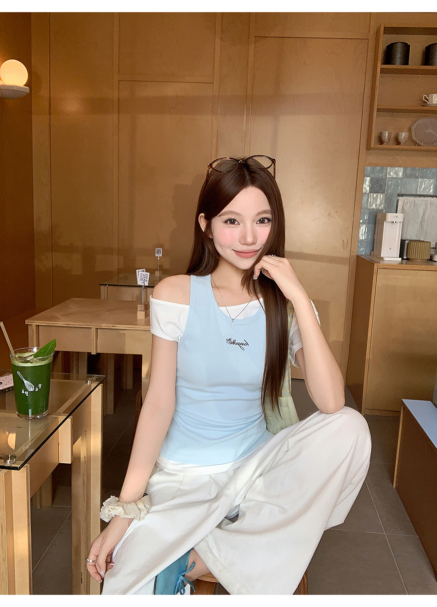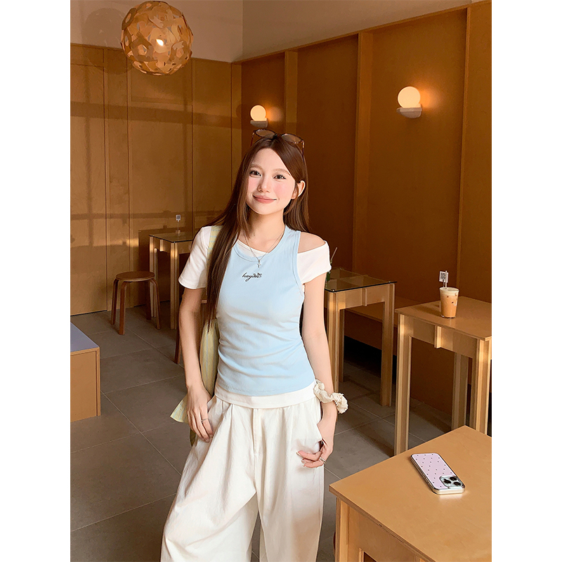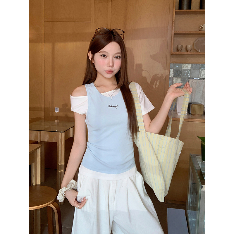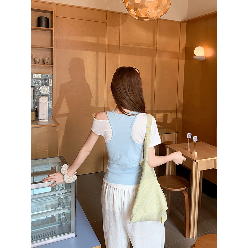 RY4268# 纯欲风真两件露肩t恤女夏季新款韩系修身显瘦辣妹短袖上衣两件套