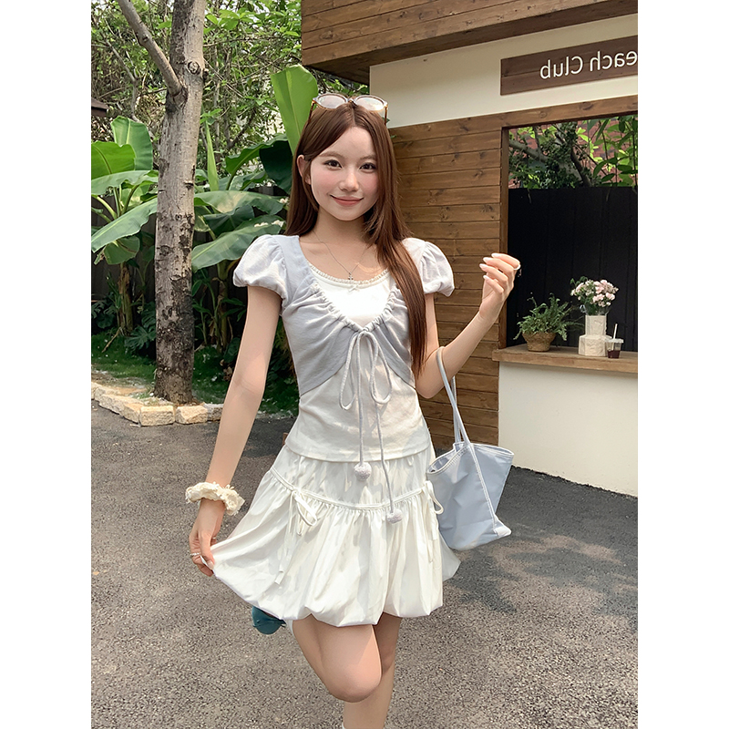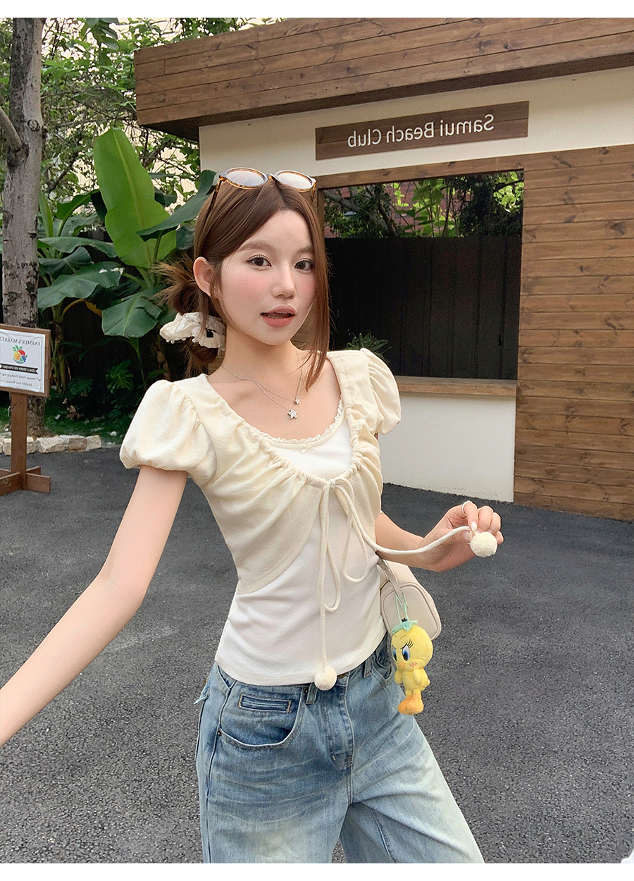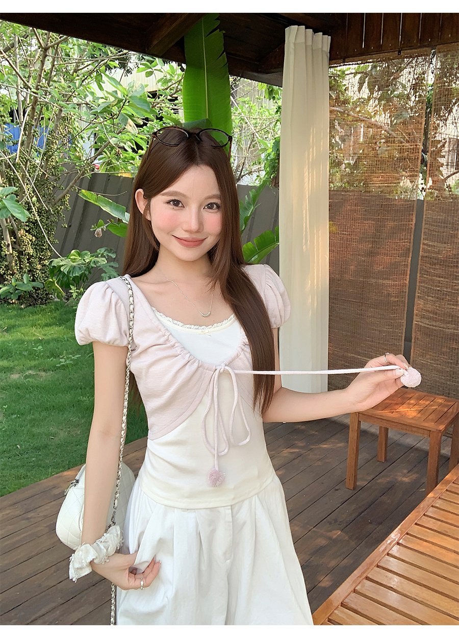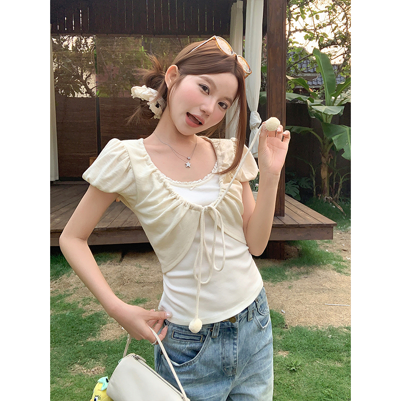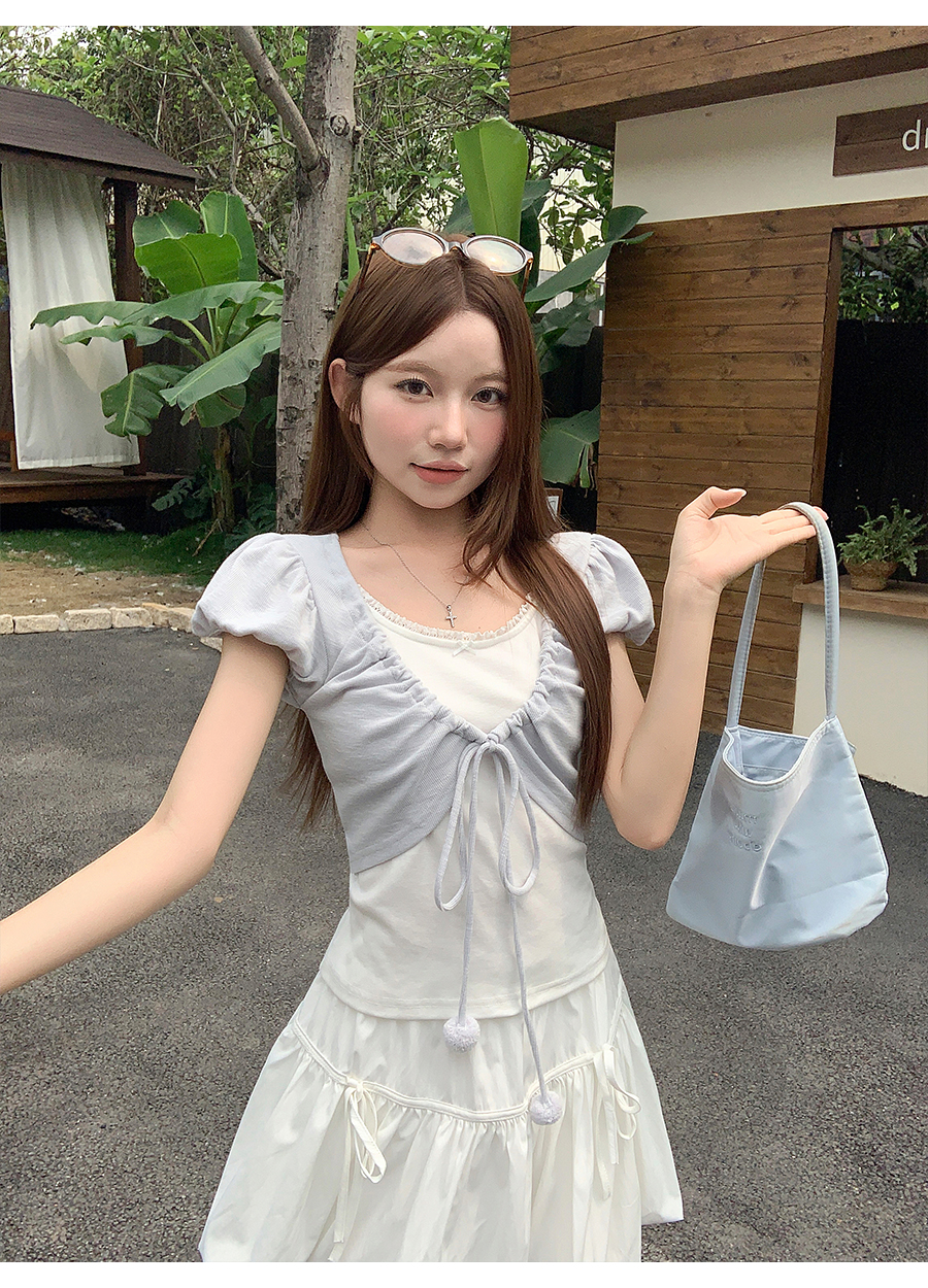 RY4270# 韩系温柔风假两件短袖t恤女夏季新款系带设计感小众修身显瘦上衣