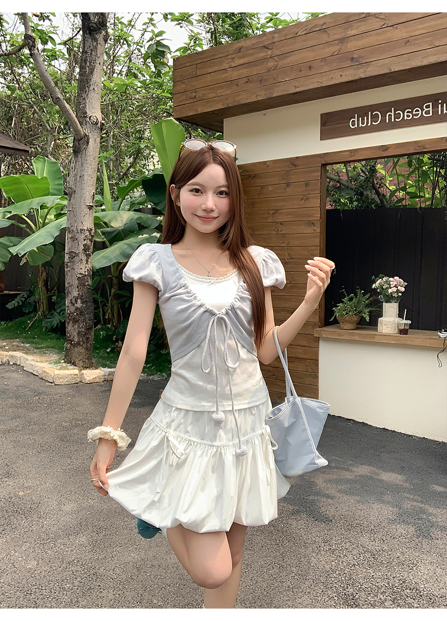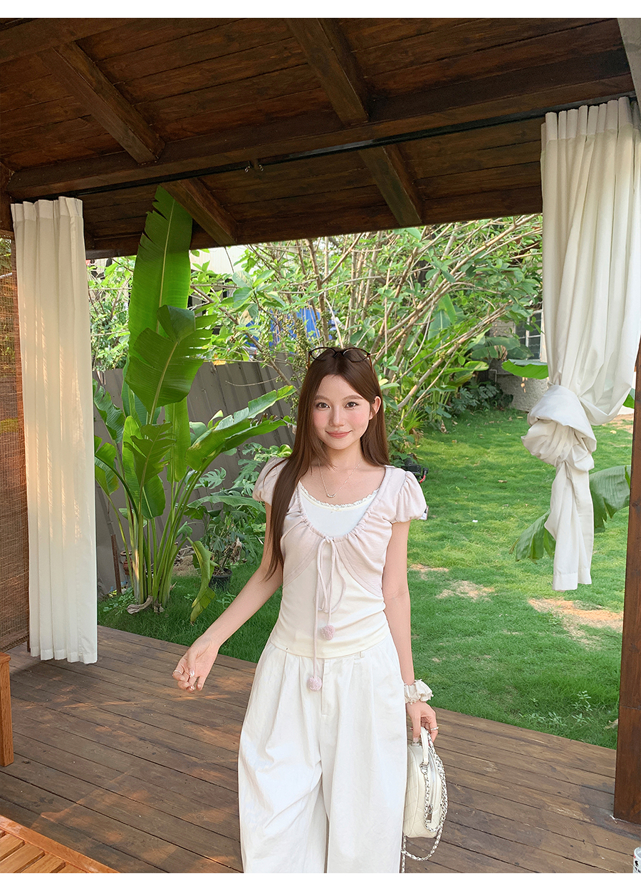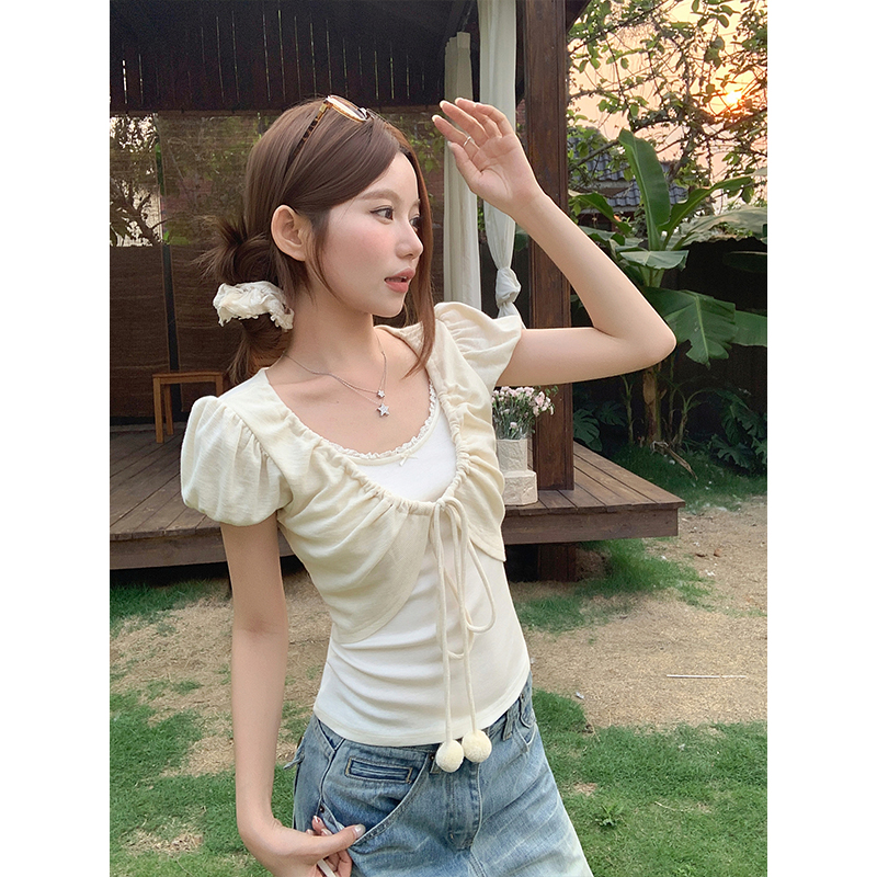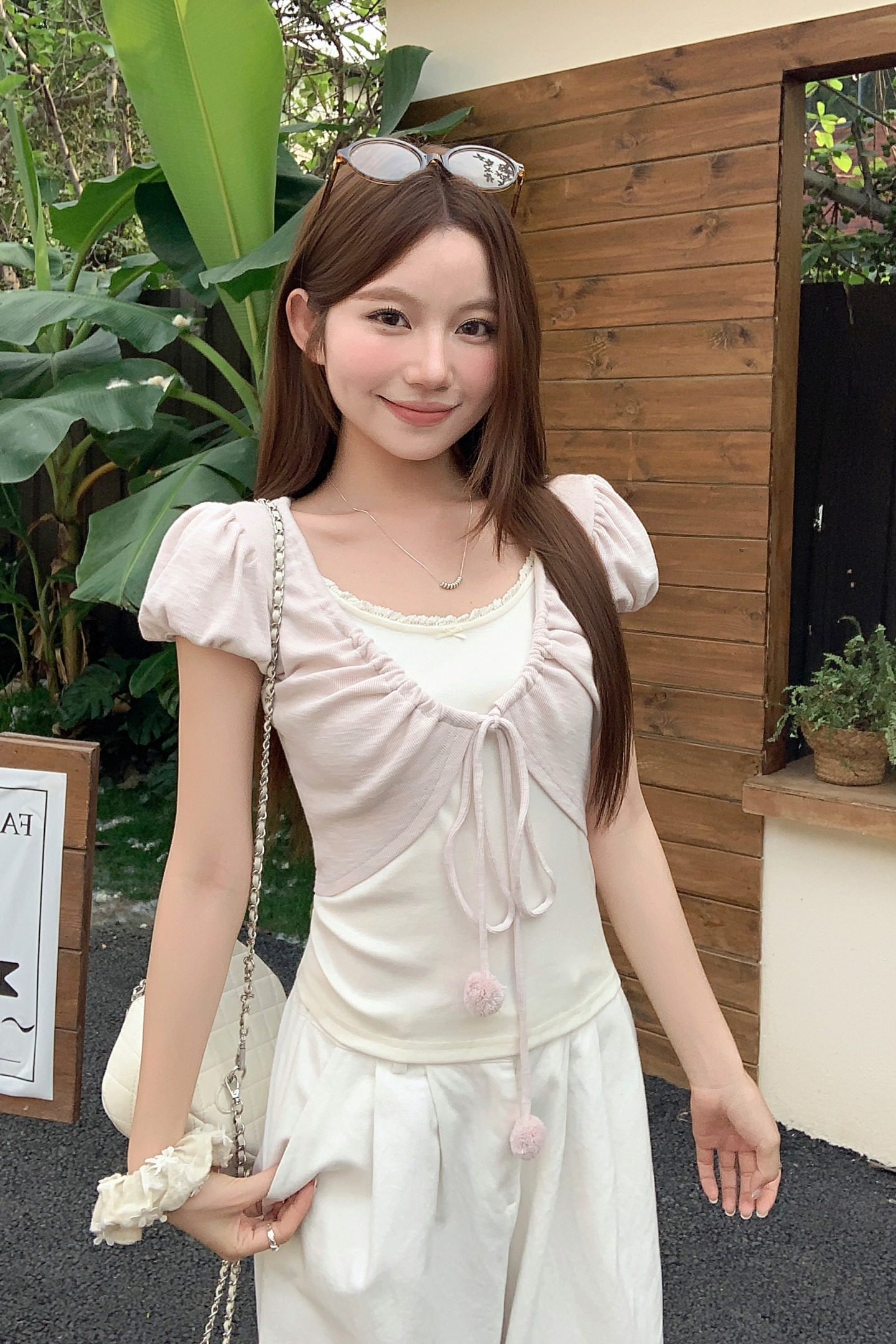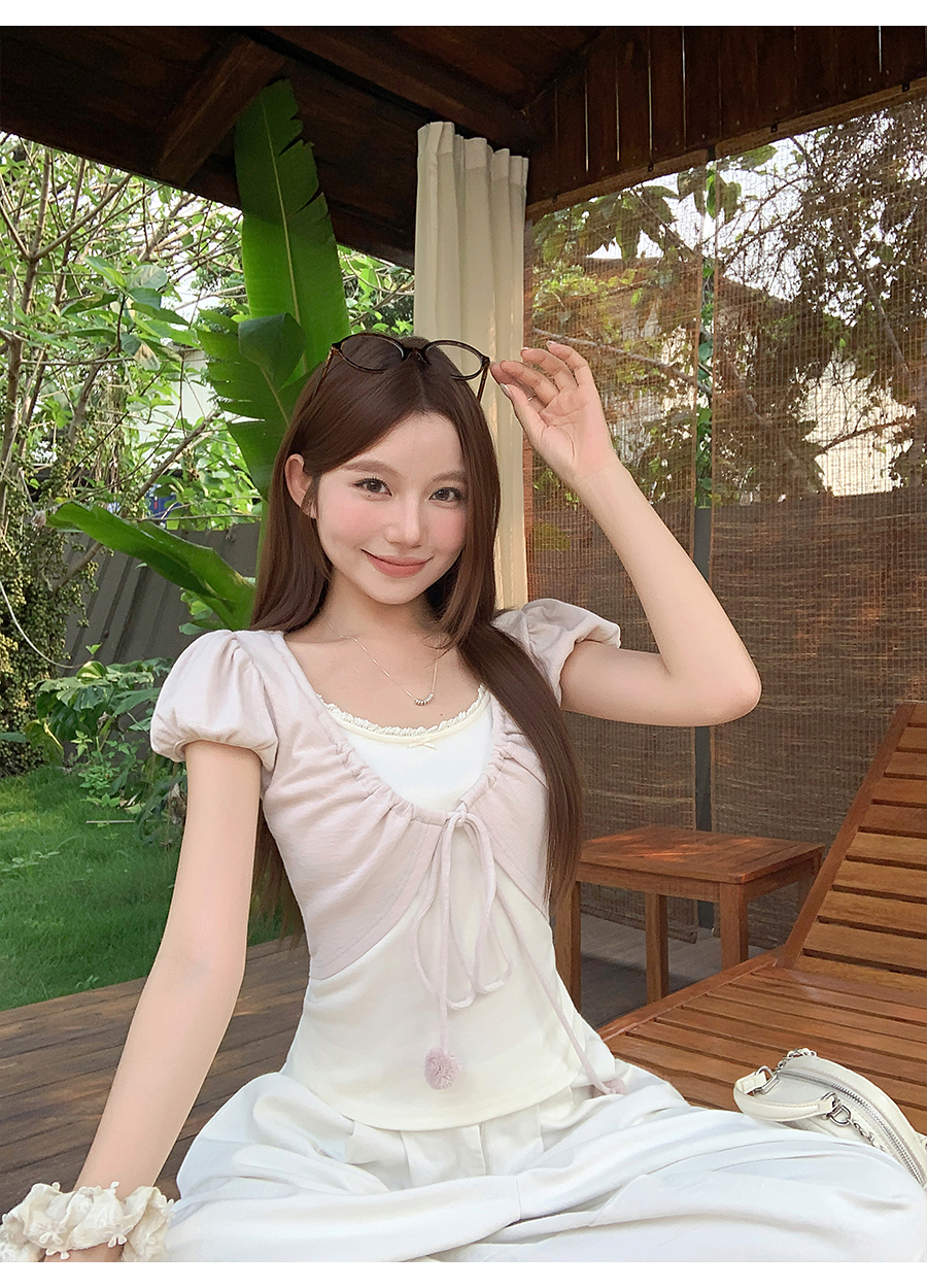 RY4270# 韩系温柔风假两件短袖t恤女夏季新款系带设计感小众修身显瘦上衣