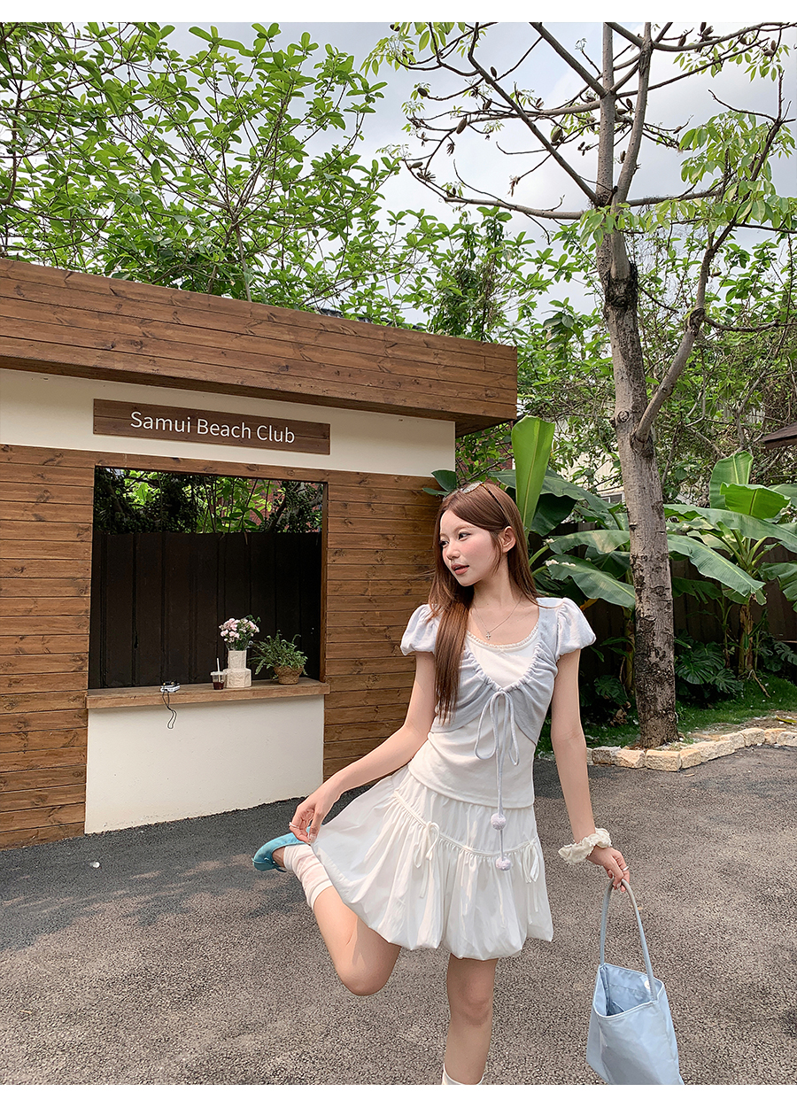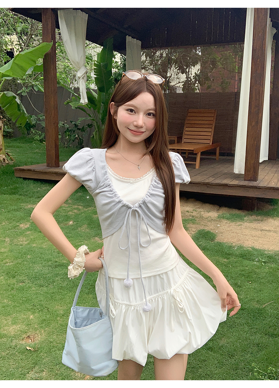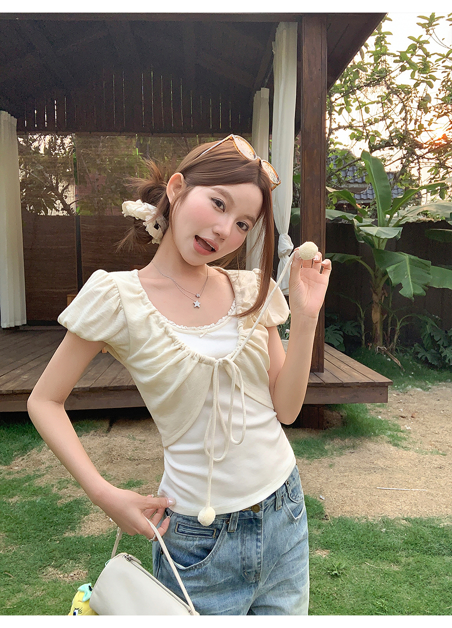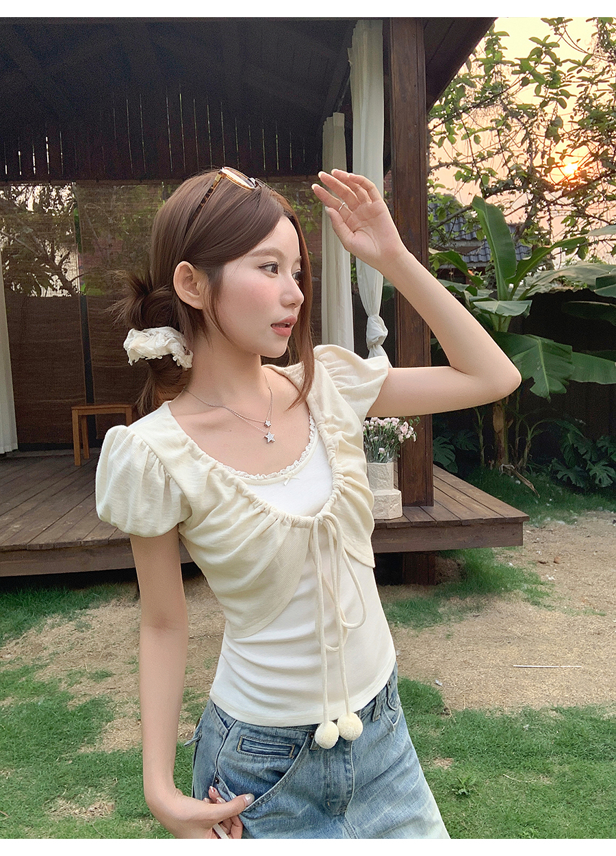 RY4270# 韩系温柔风假两件短袖t恤女夏季新款系带设计感小众修身显瘦上衣
