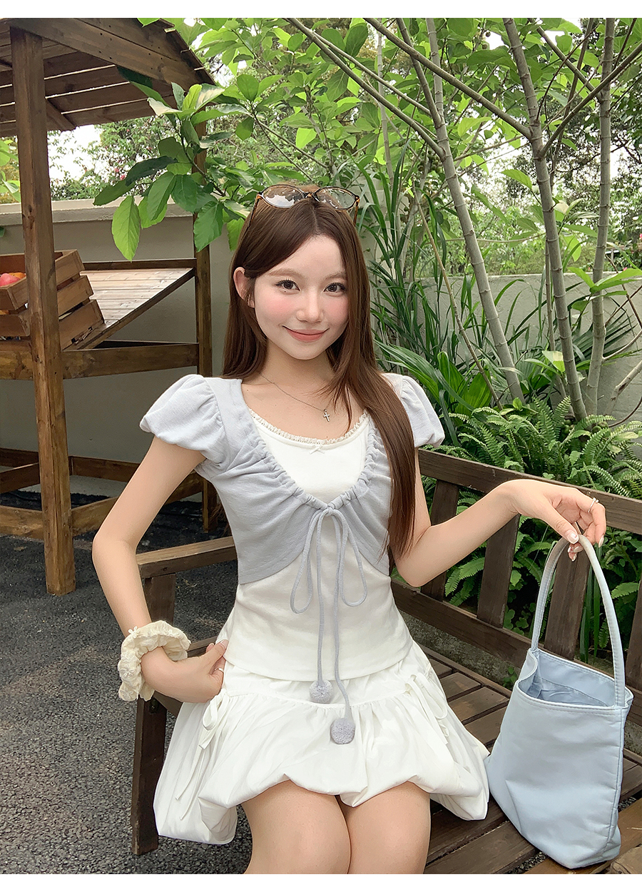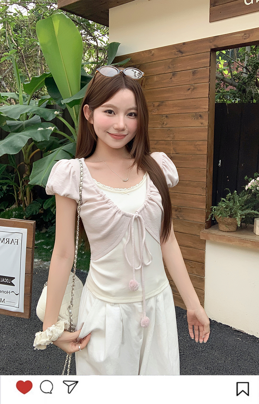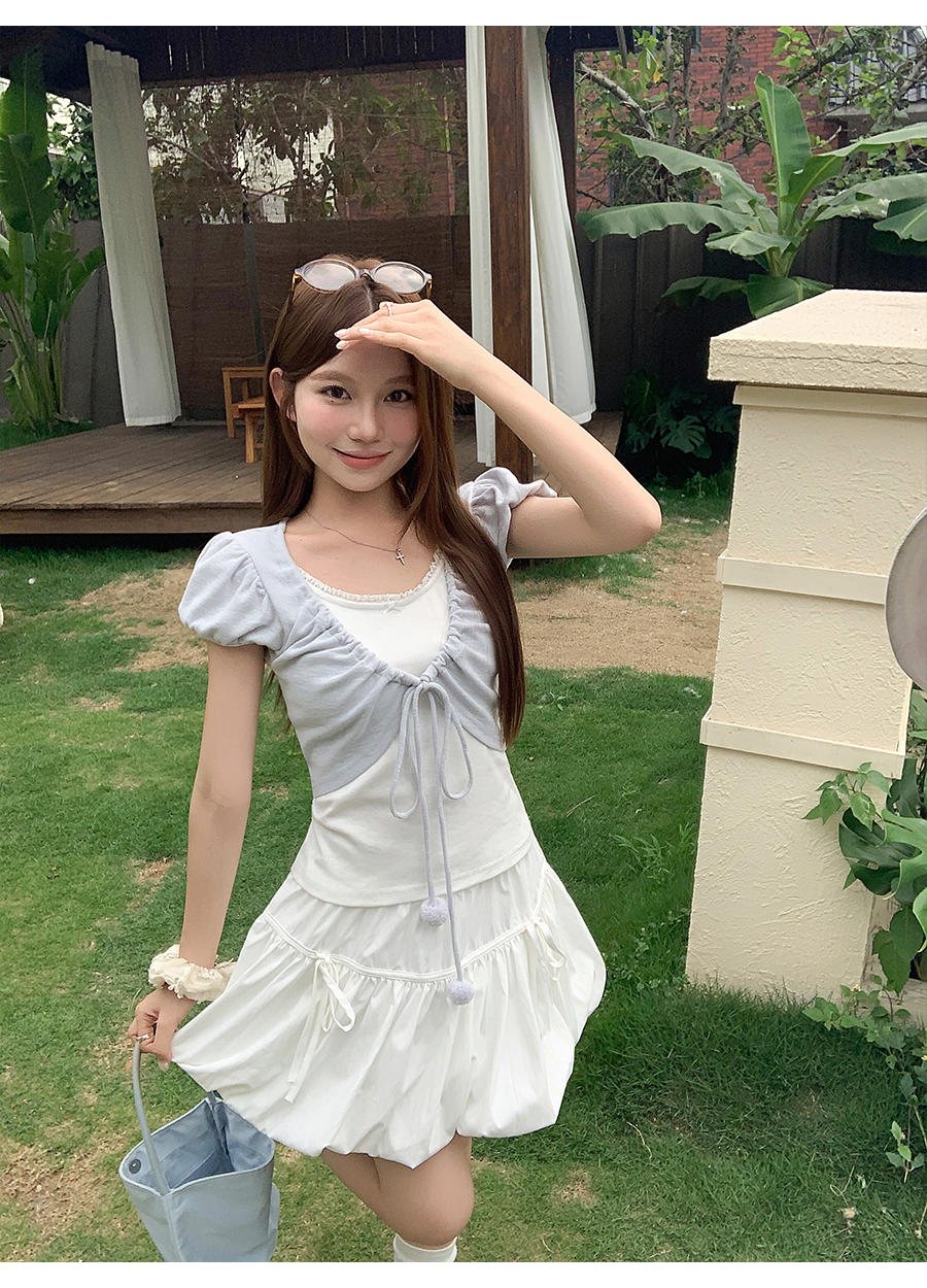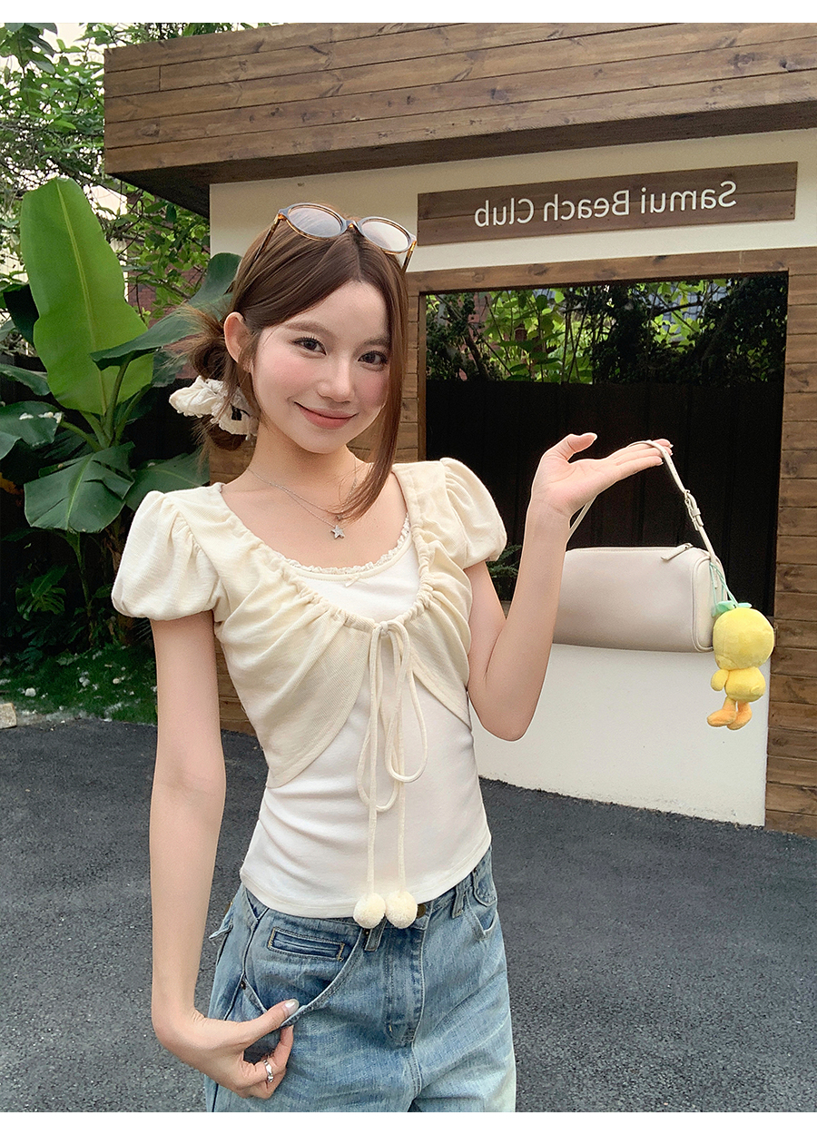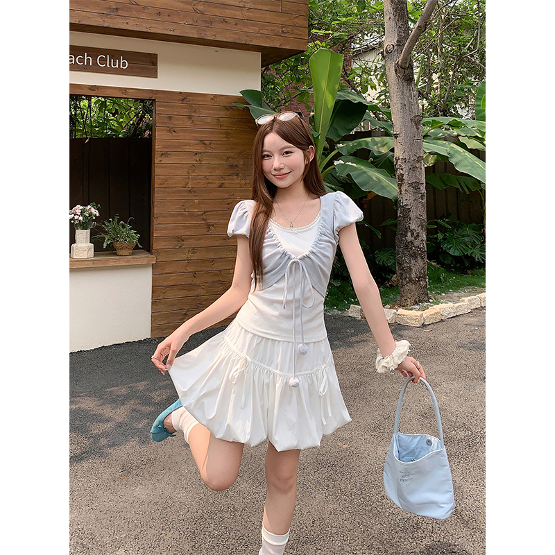 RY4270# 韩系温柔风假两件短袖t恤女夏季新款系带设计感小众修身显瘦上衣