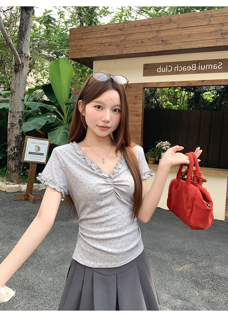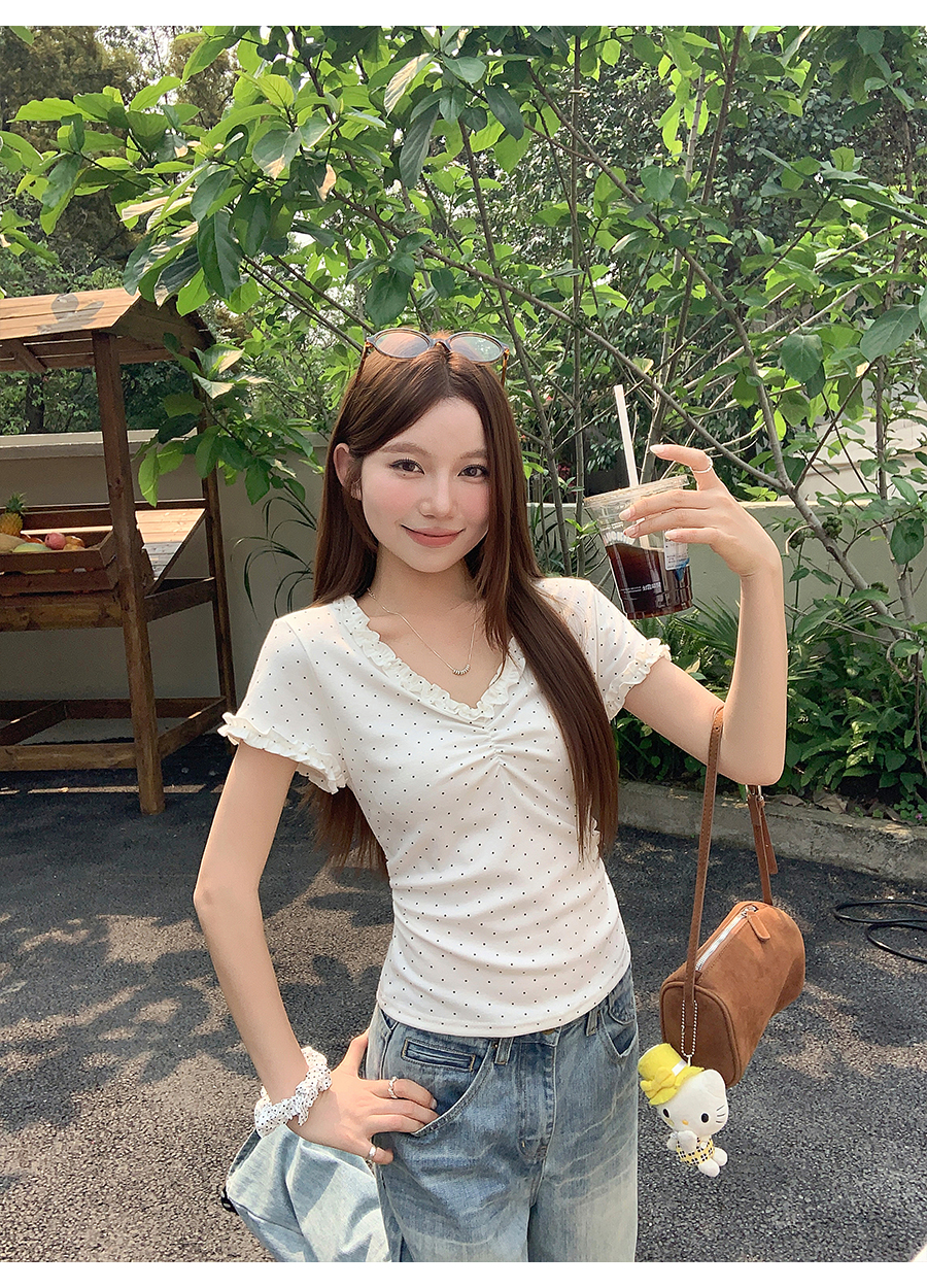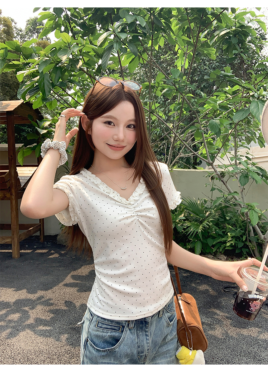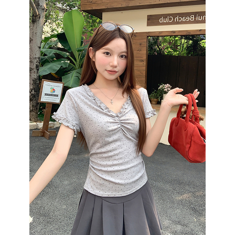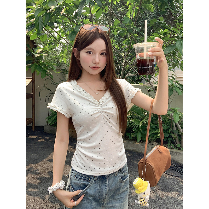 RY4272# 韩系温柔风波点短袖t恤女夏季新款褶皱设计感小众辣妹打底衫上衣