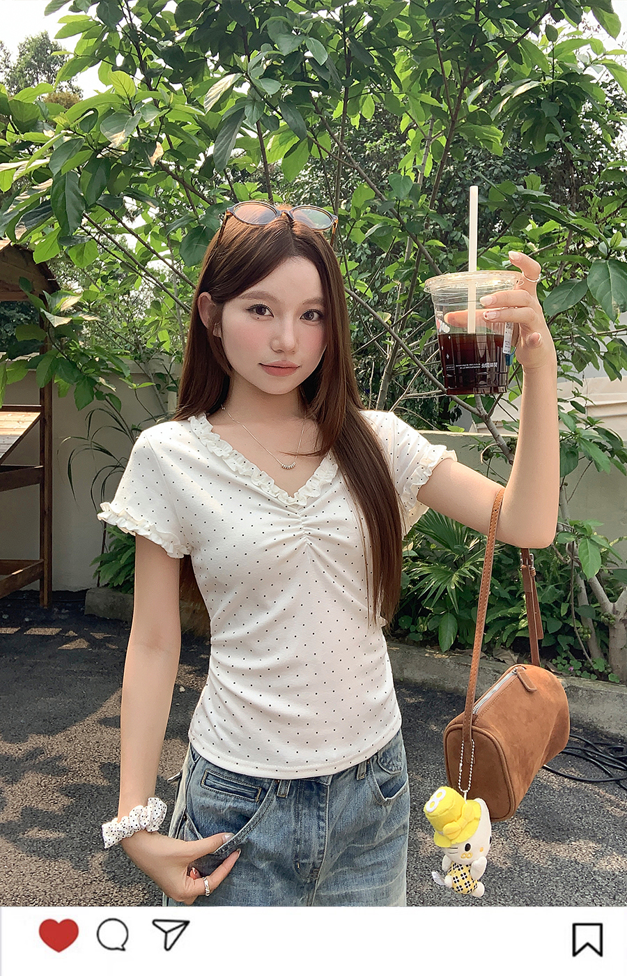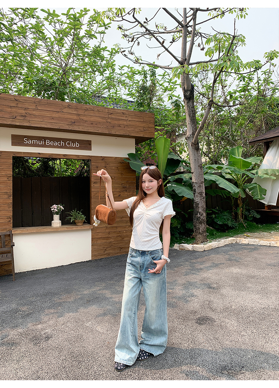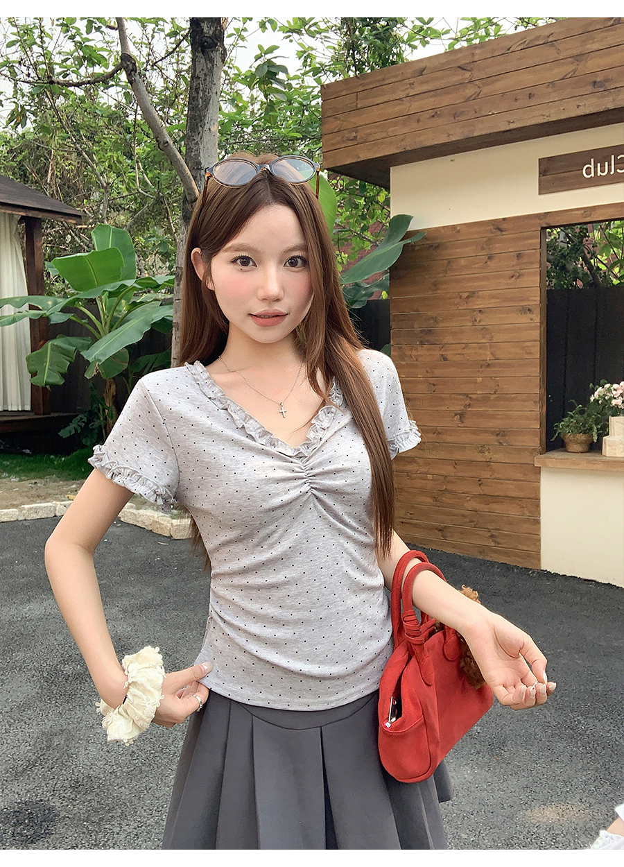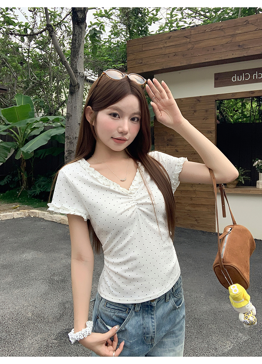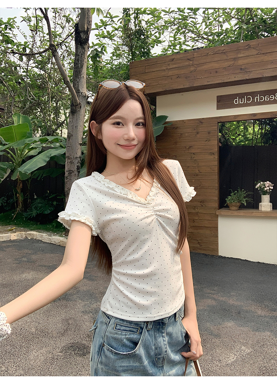 RY4272# 韩系温柔风波点短袖t恤女夏季新款褶皱设计感小众辣妹打底衫上衣