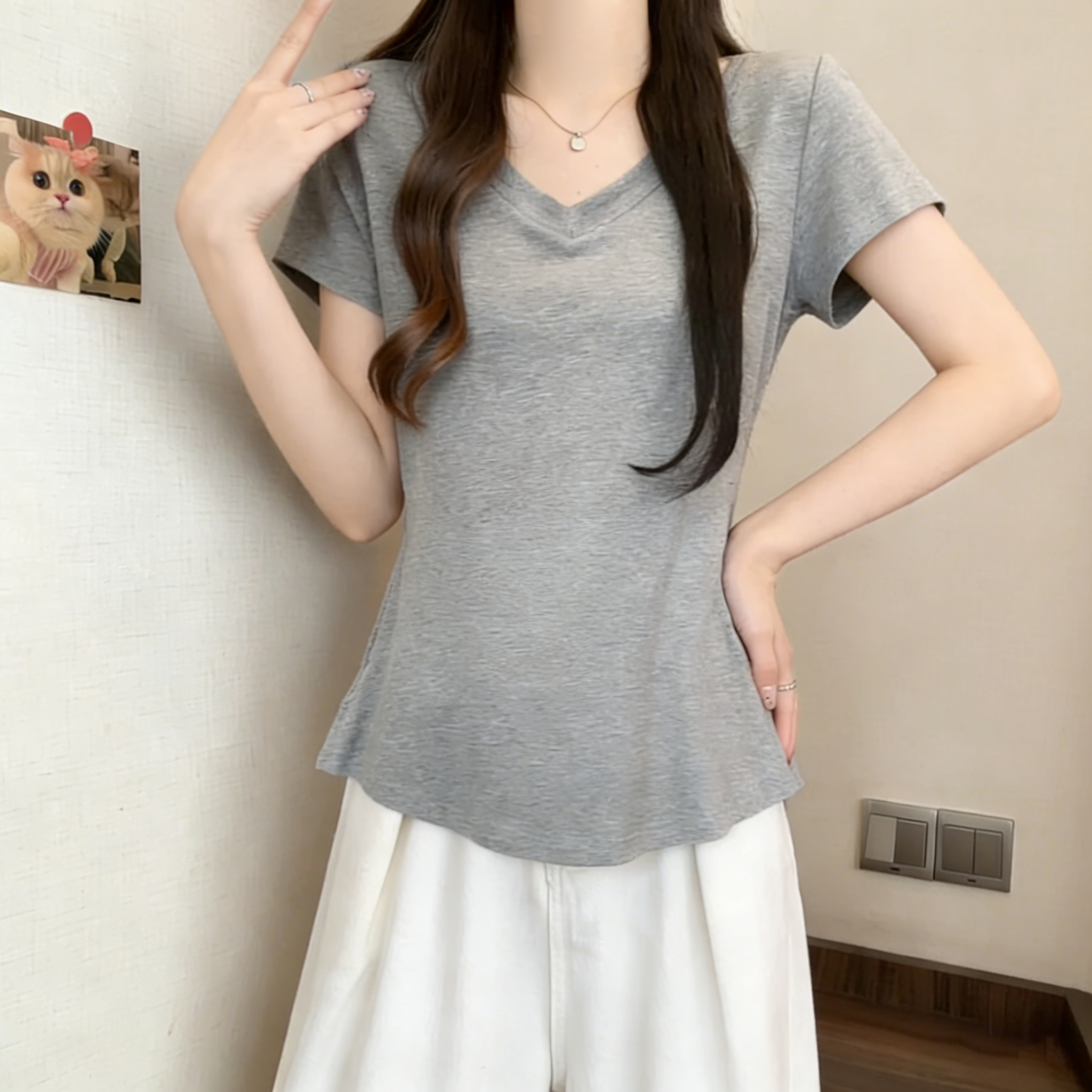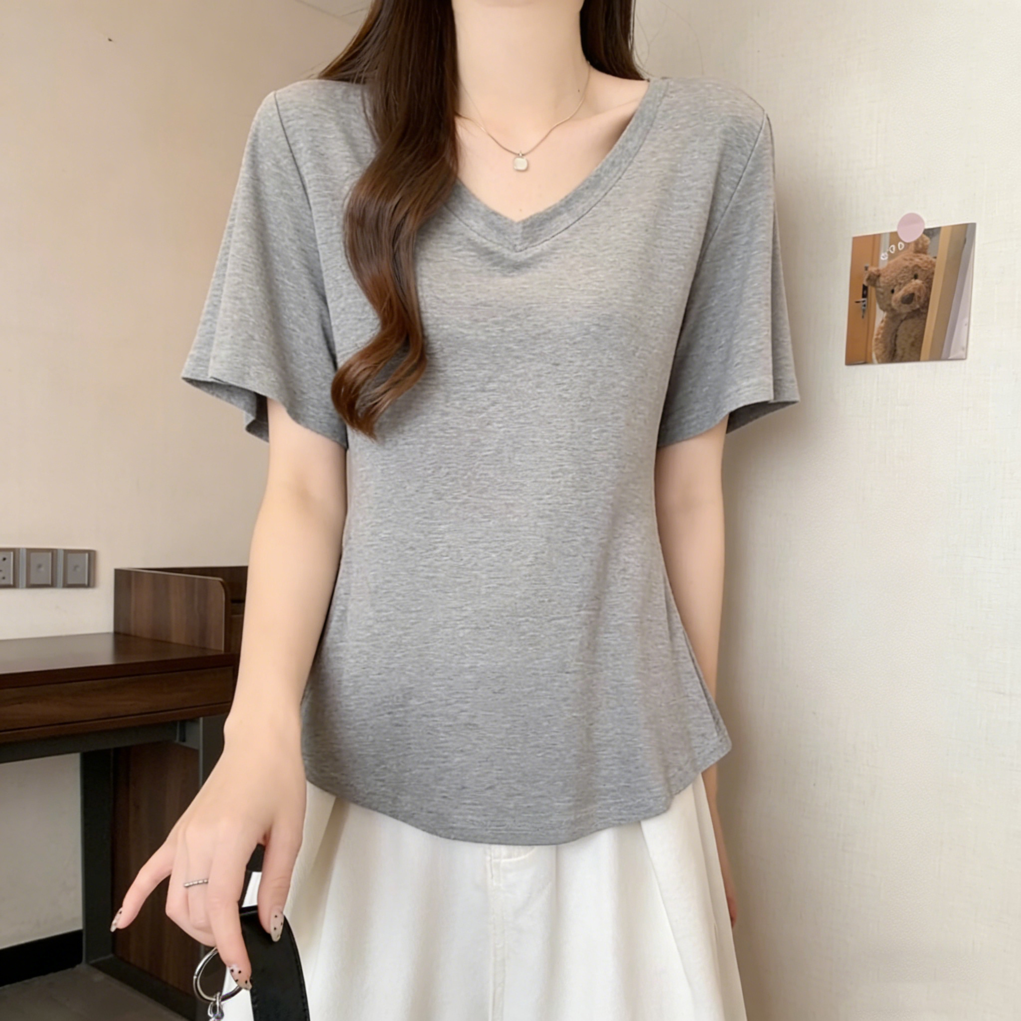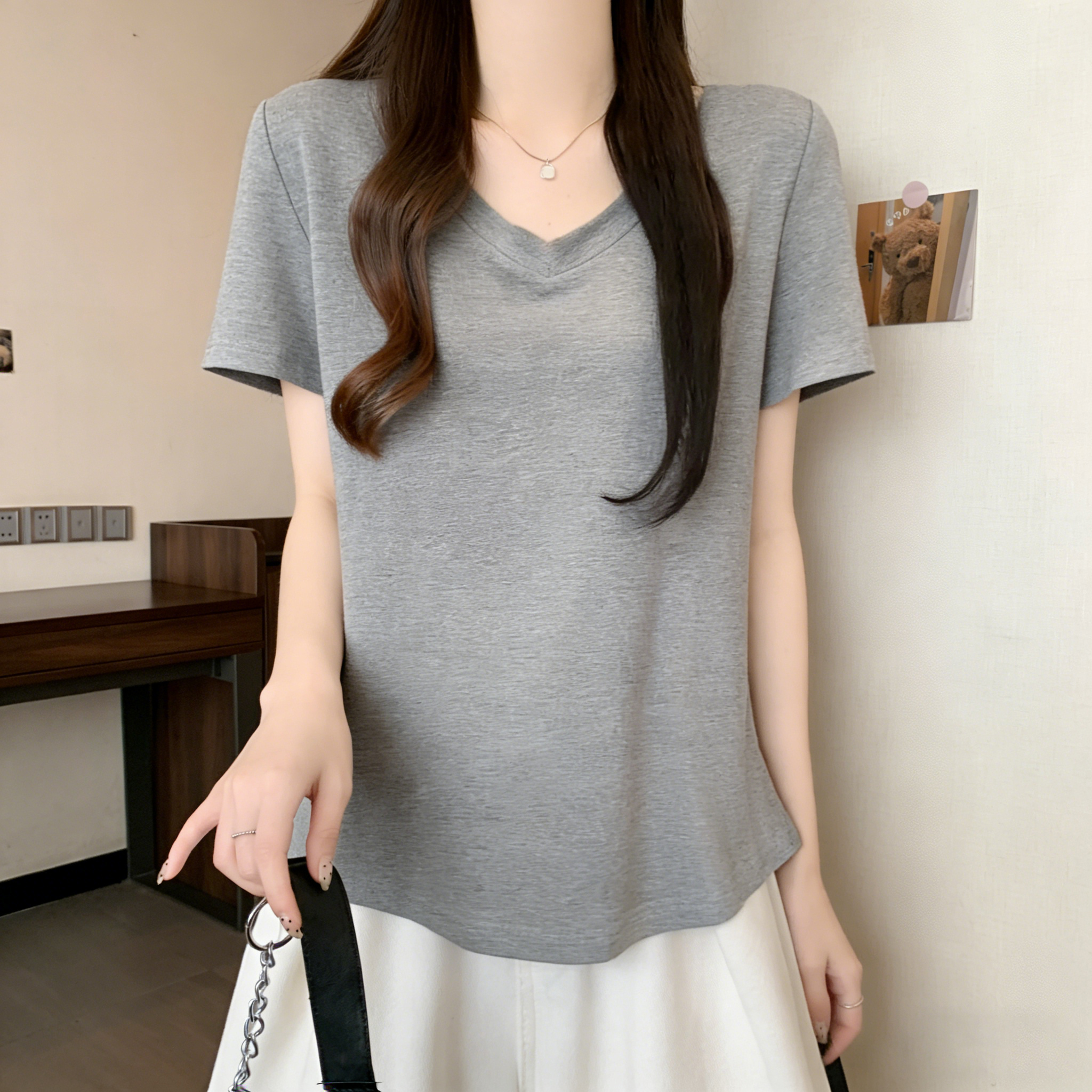 RY3071# 实拍~ 大码纯欲风V领纯棉短袖T恤女夏季胖mm显瘦宽松慵懒遮肉上衣