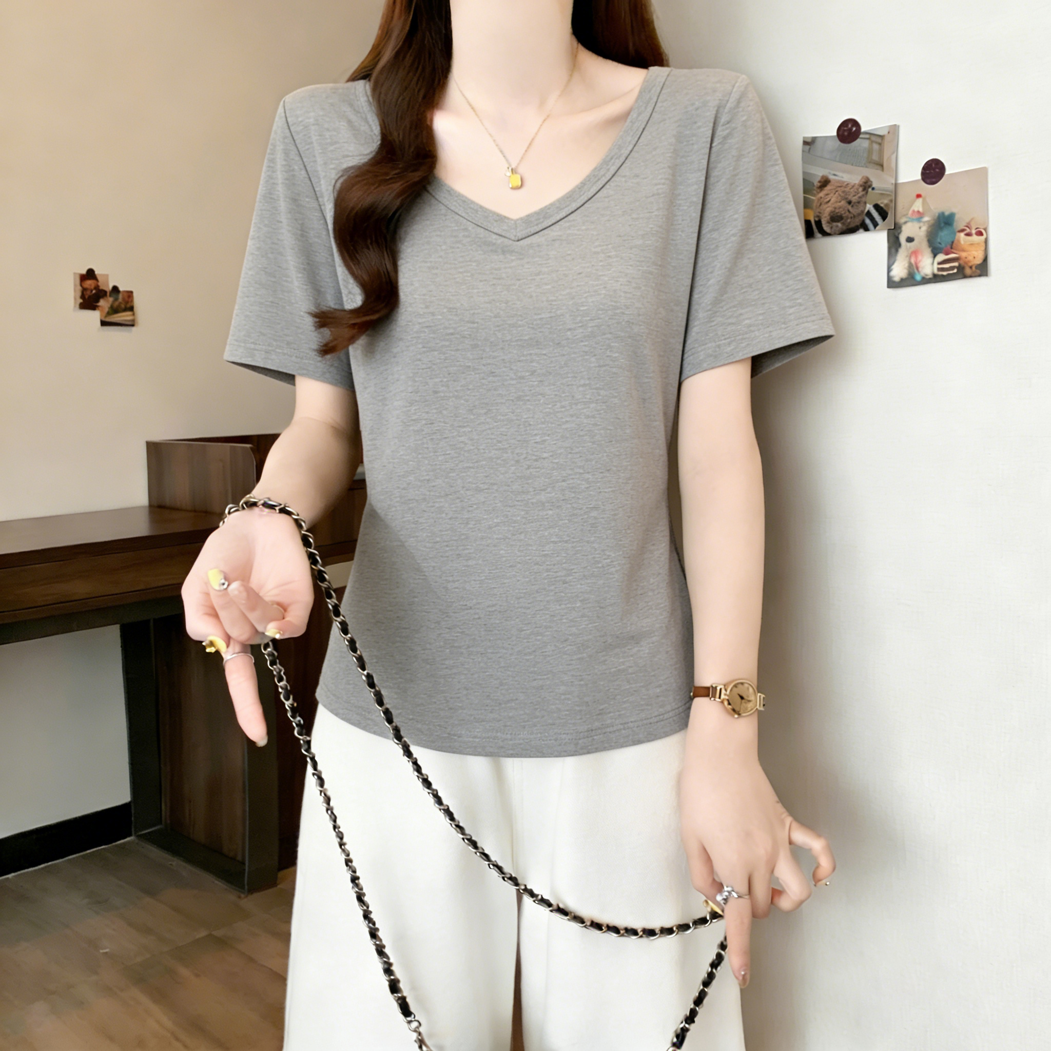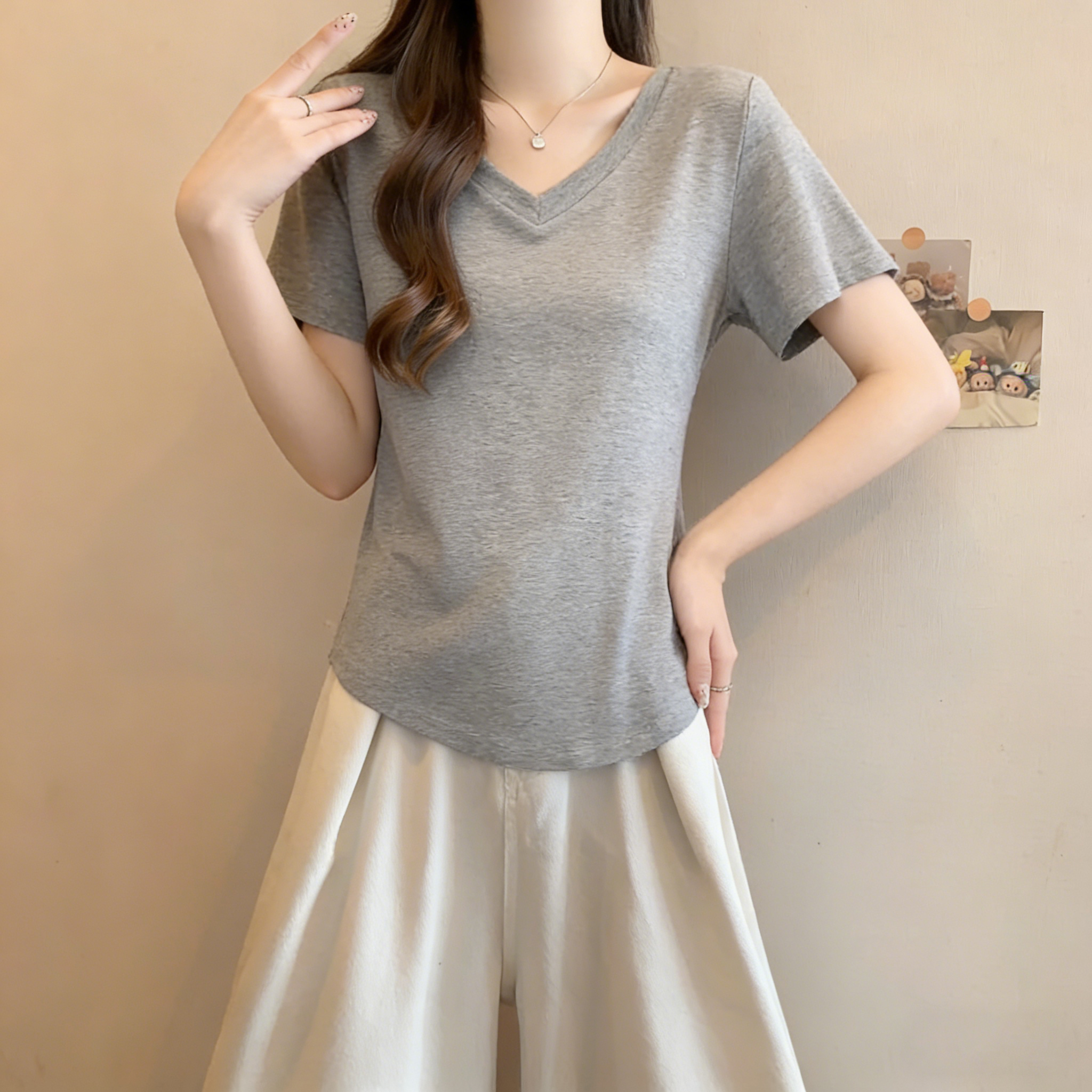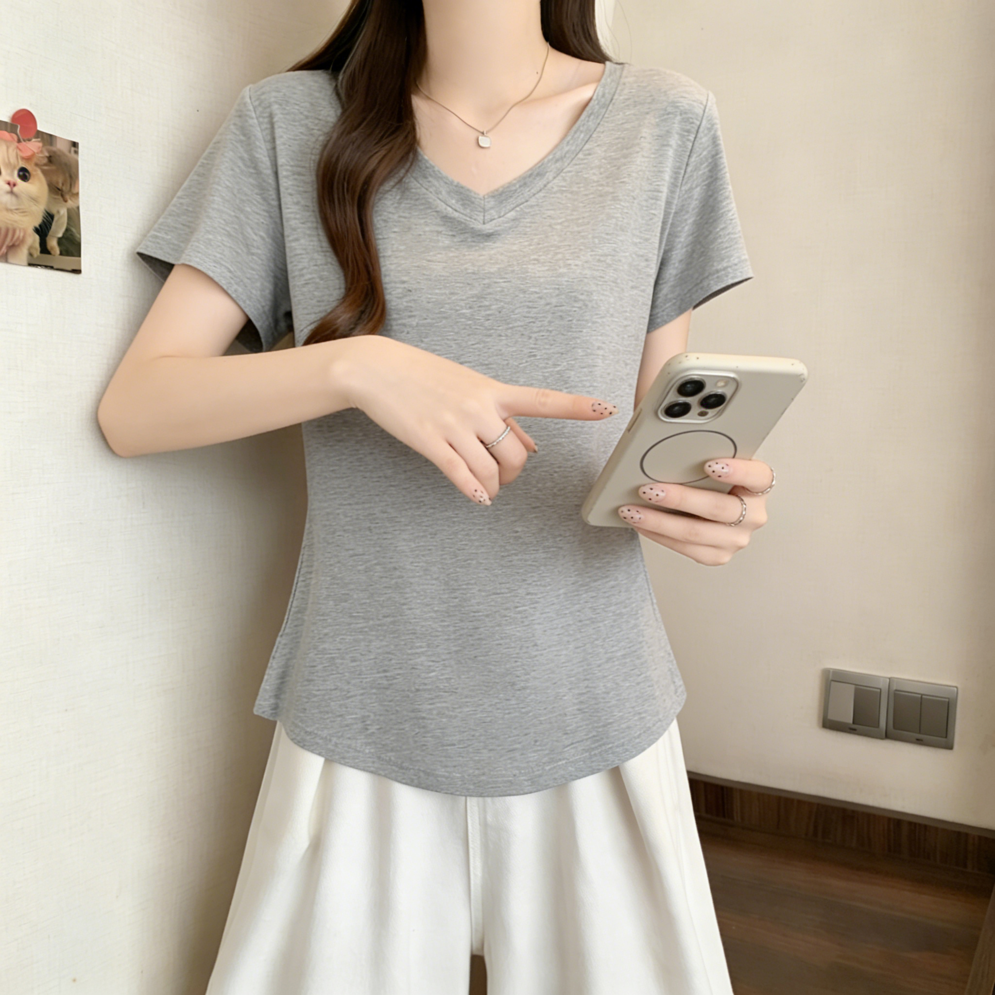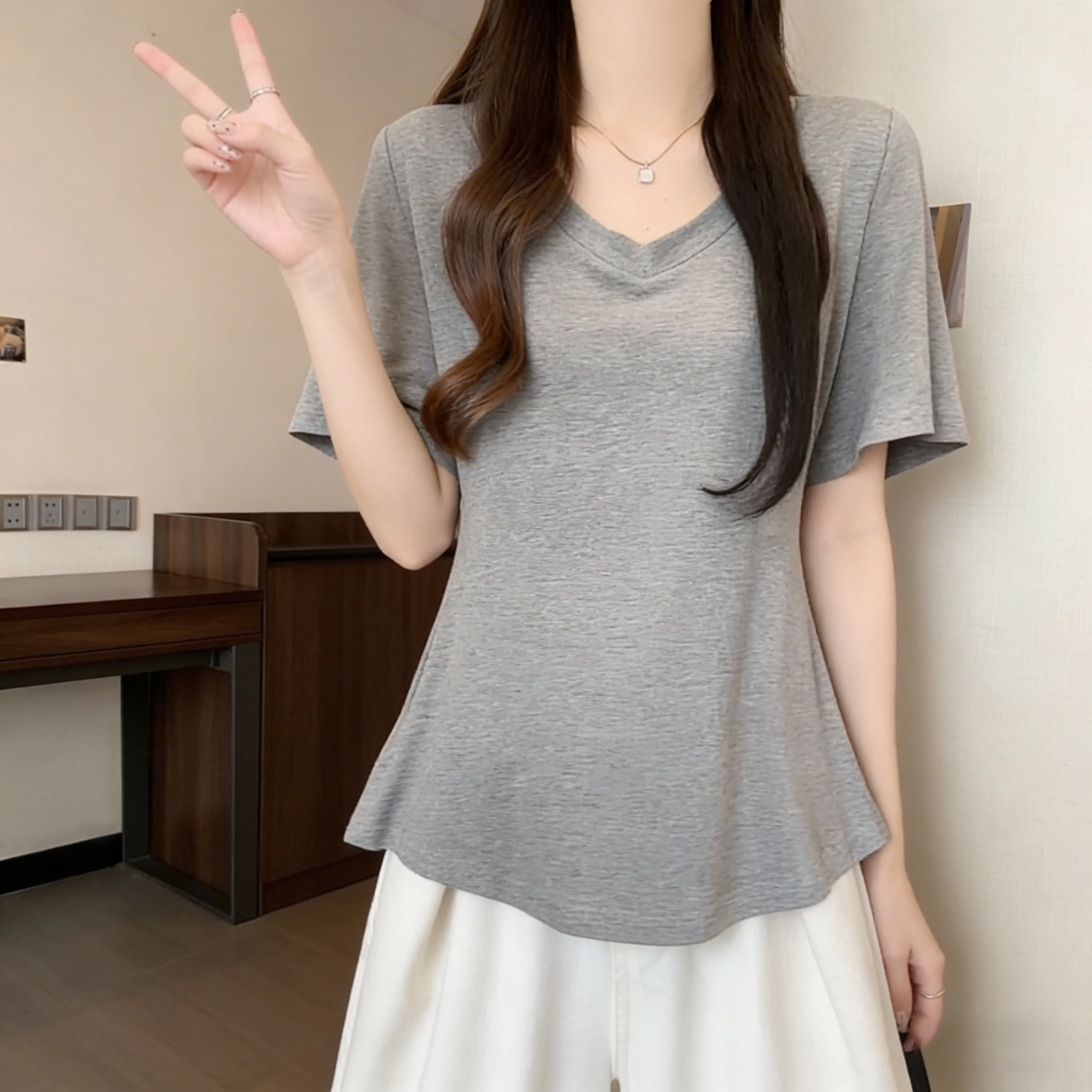 RY3071# 实拍~ 大码纯欲风V领纯棉短袖T恤女夏季胖mm显瘦宽松慵懒遮肉上衣