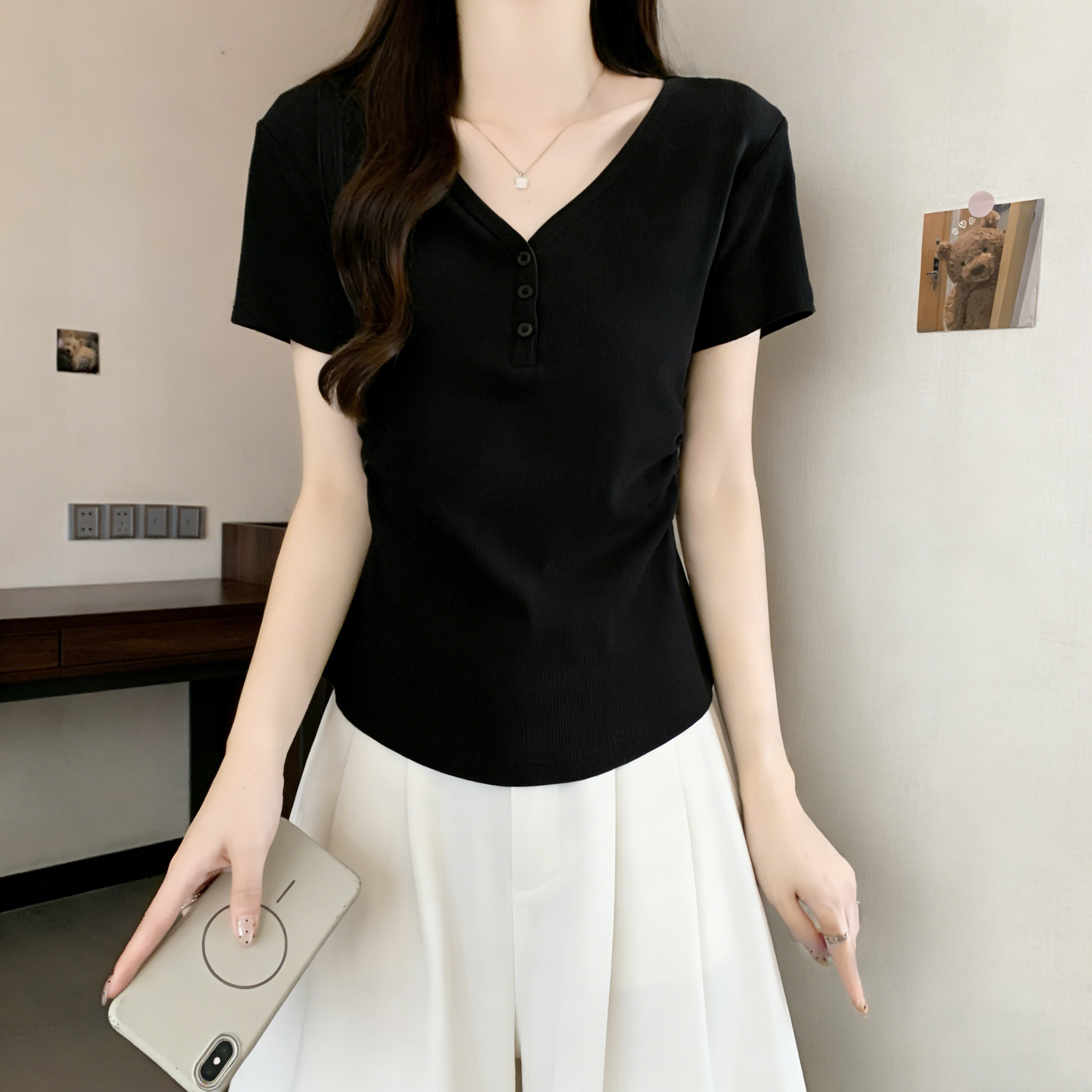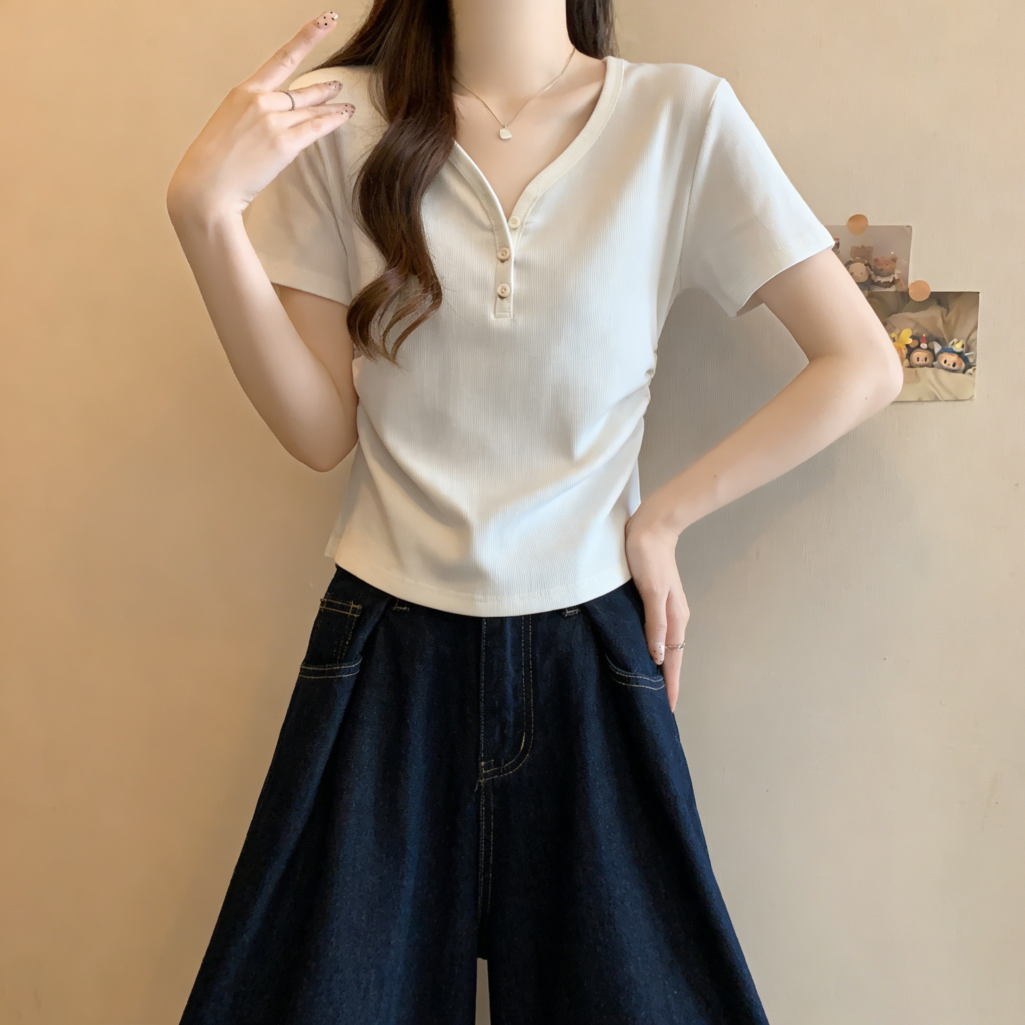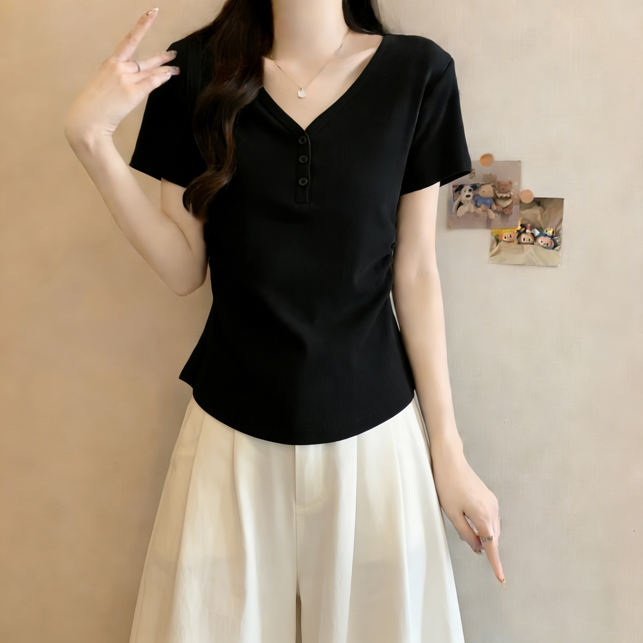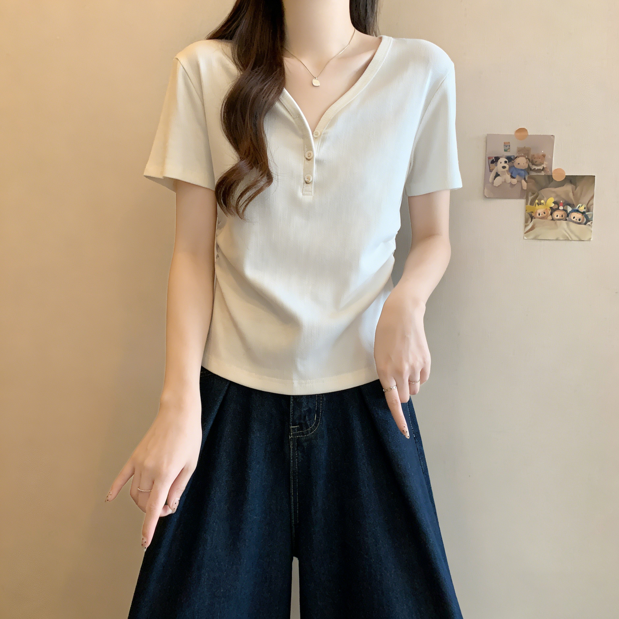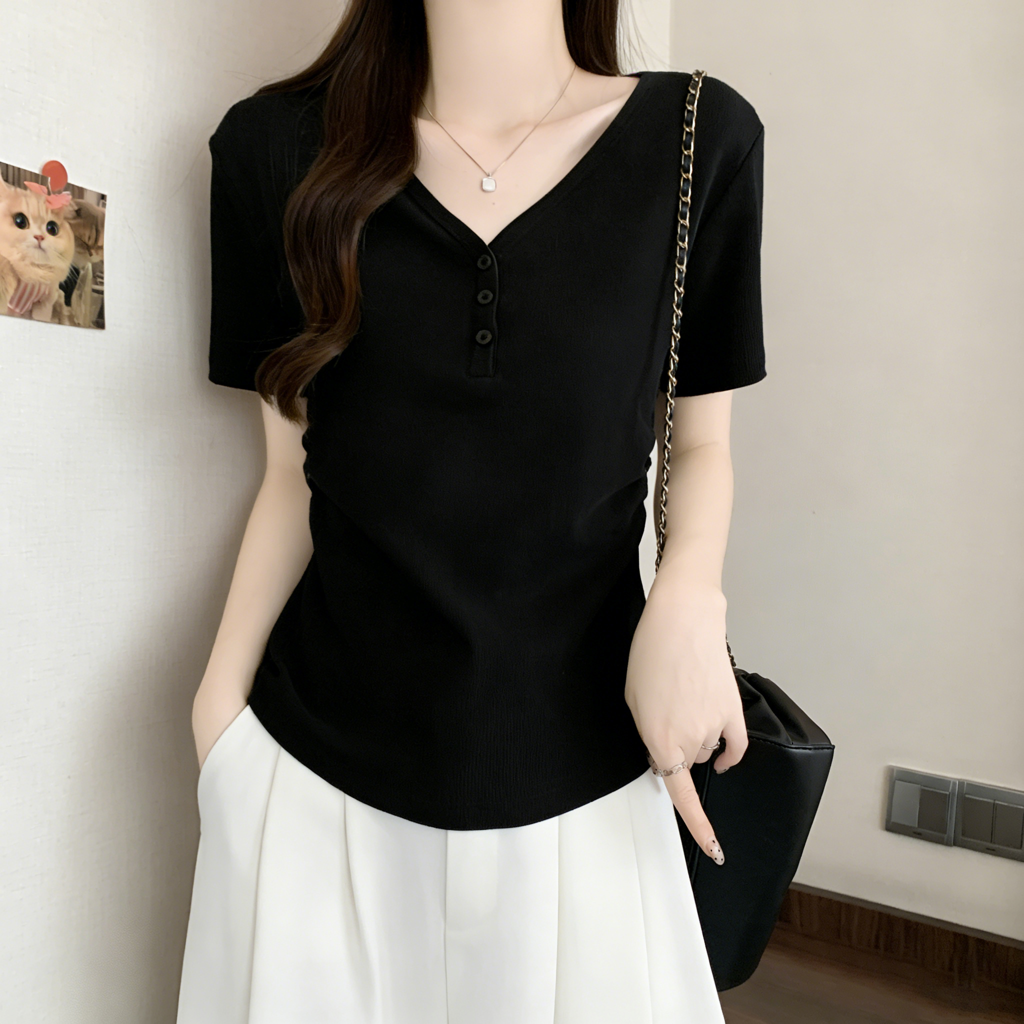 RY3072# 实拍~ 正肩v领修身显瘦短袖t恤女夏季大码胖MM纽扣褶皱显瘦上衣