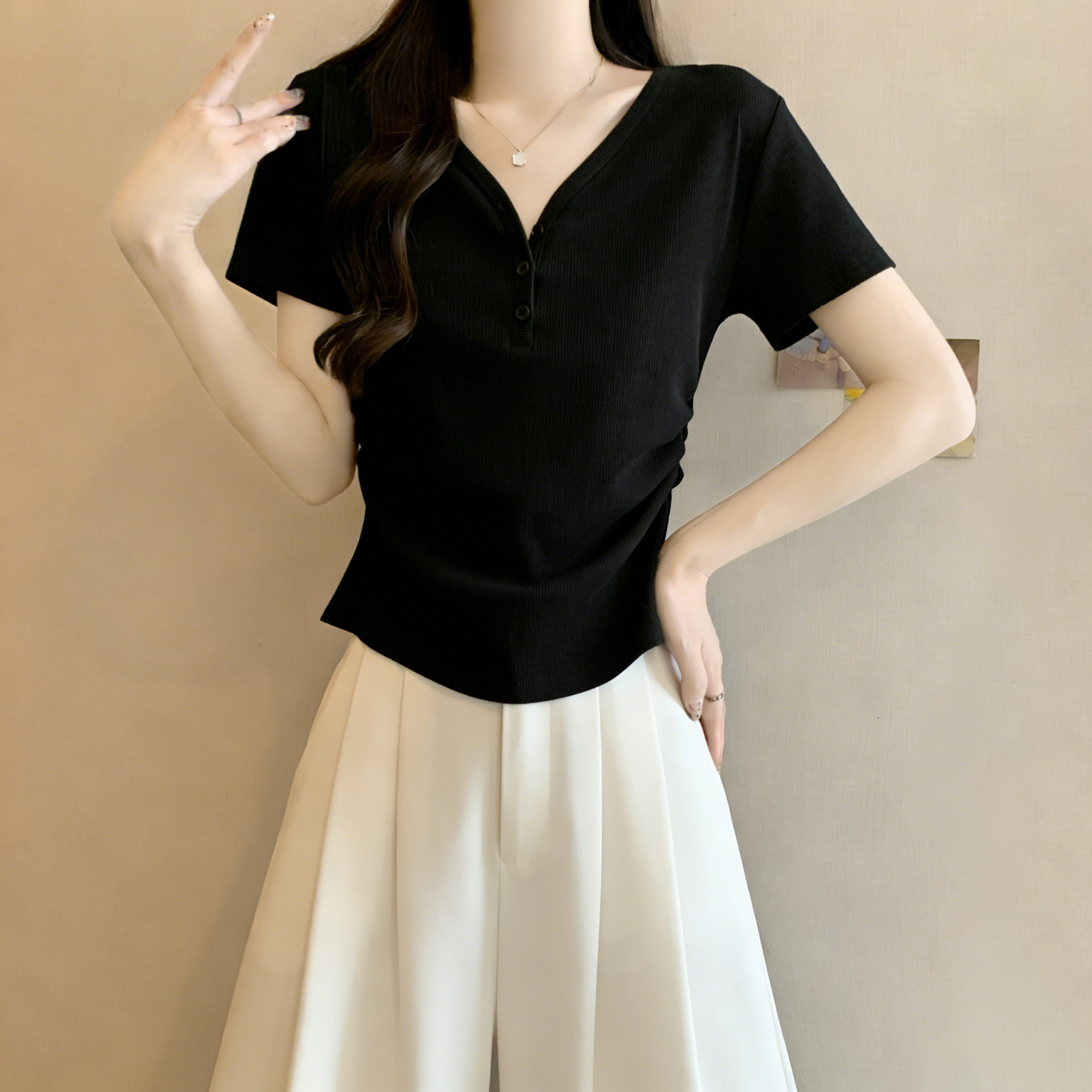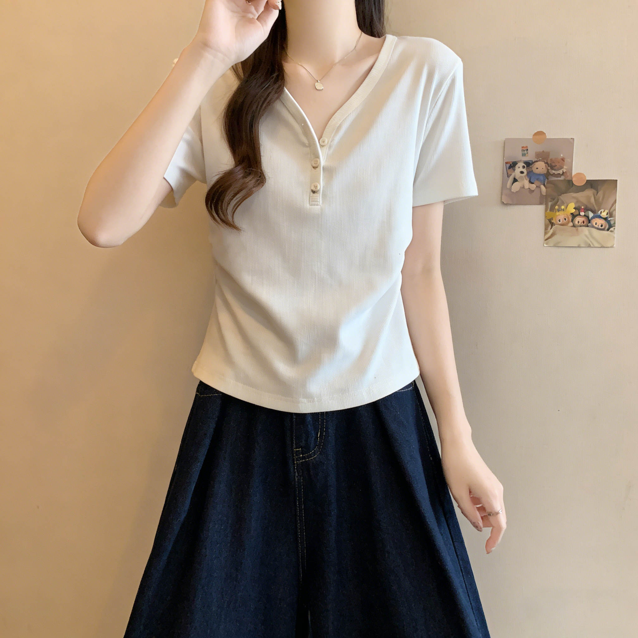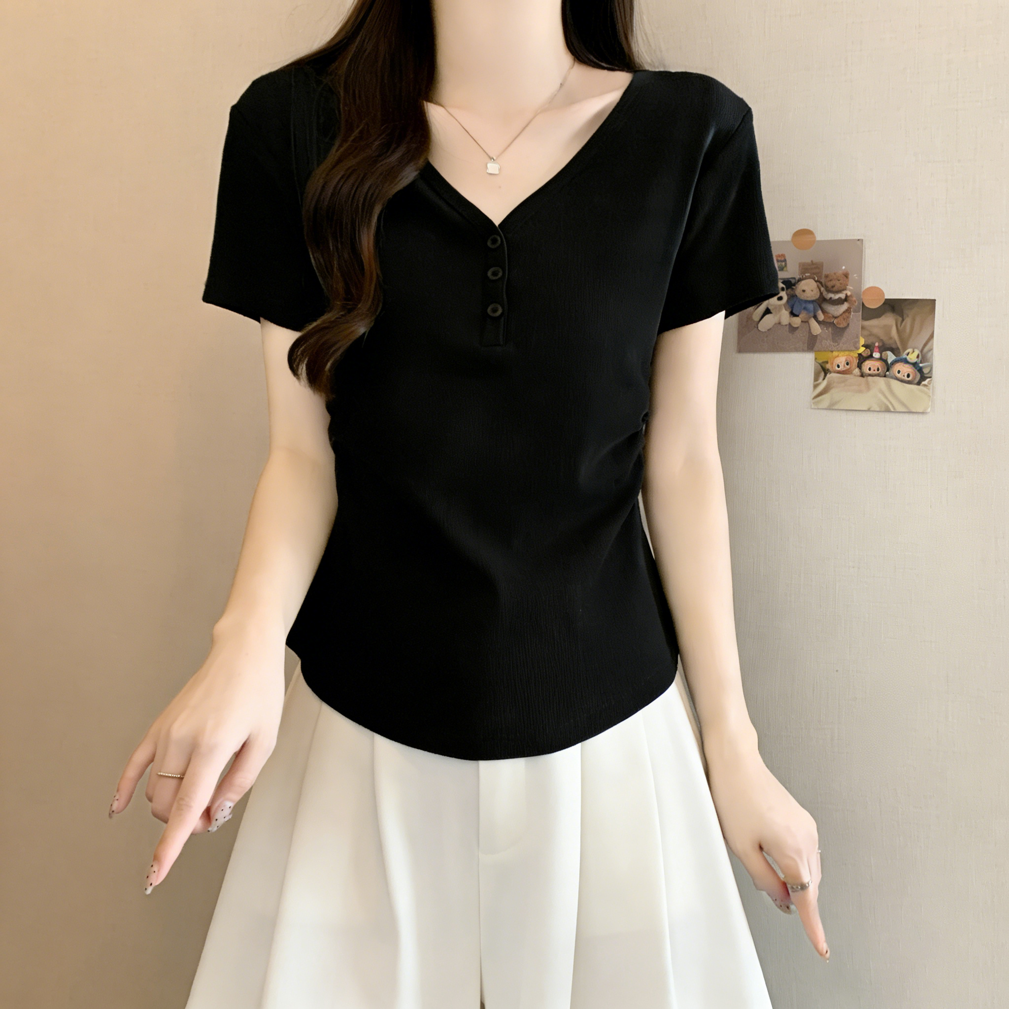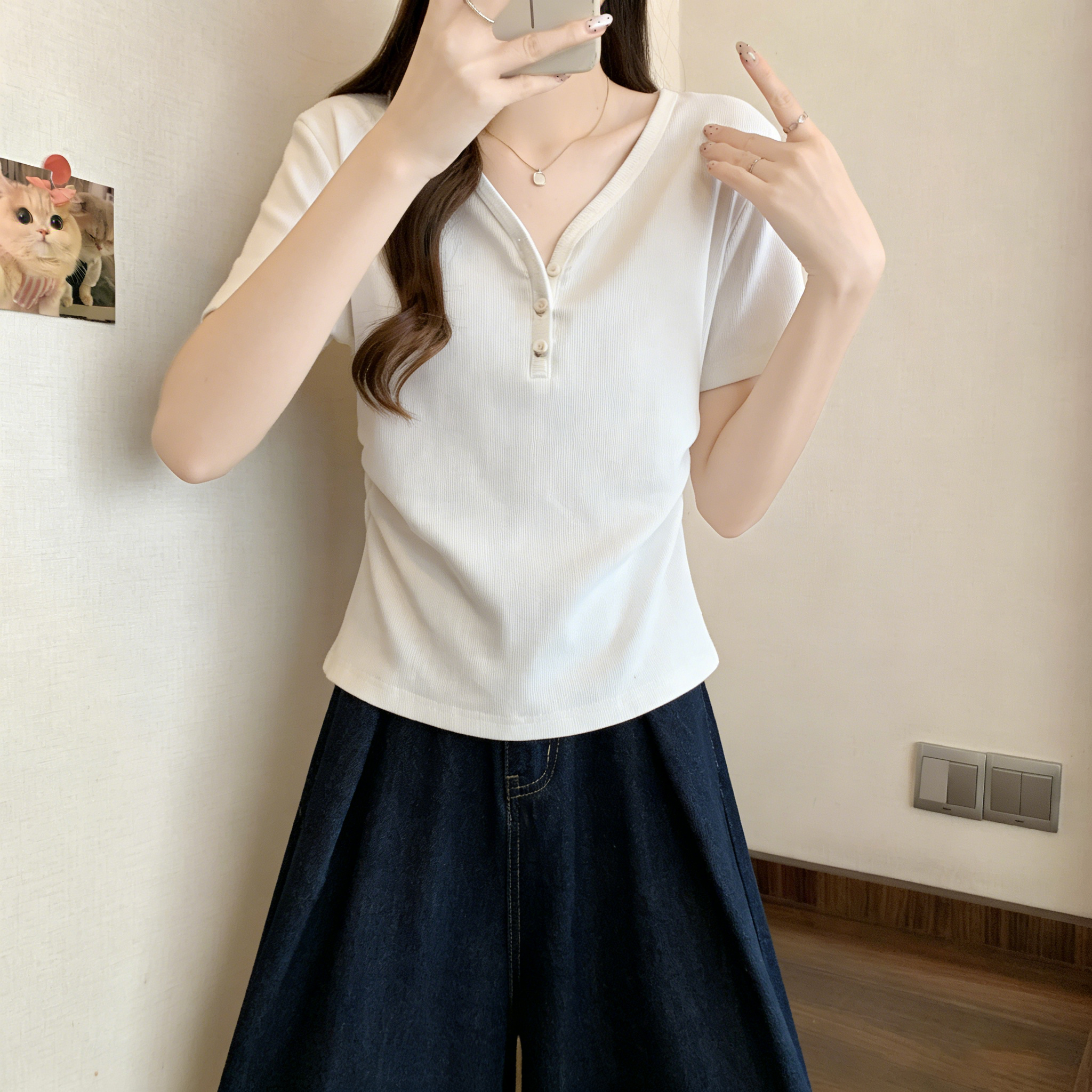 RY3072# 实拍~ 正肩v领修身显瘦短袖t恤女夏季大码胖MM纽扣褶皱显瘦上衣