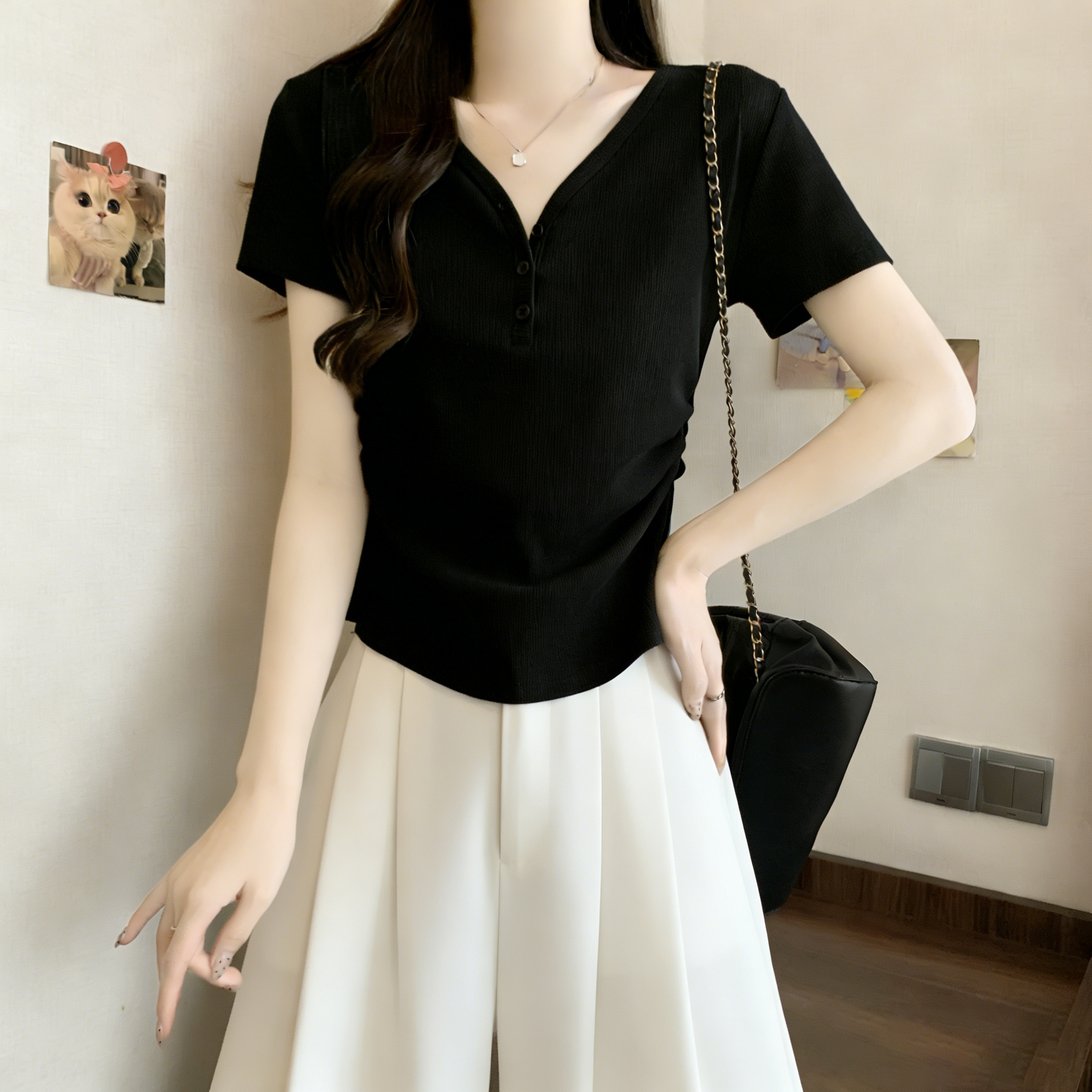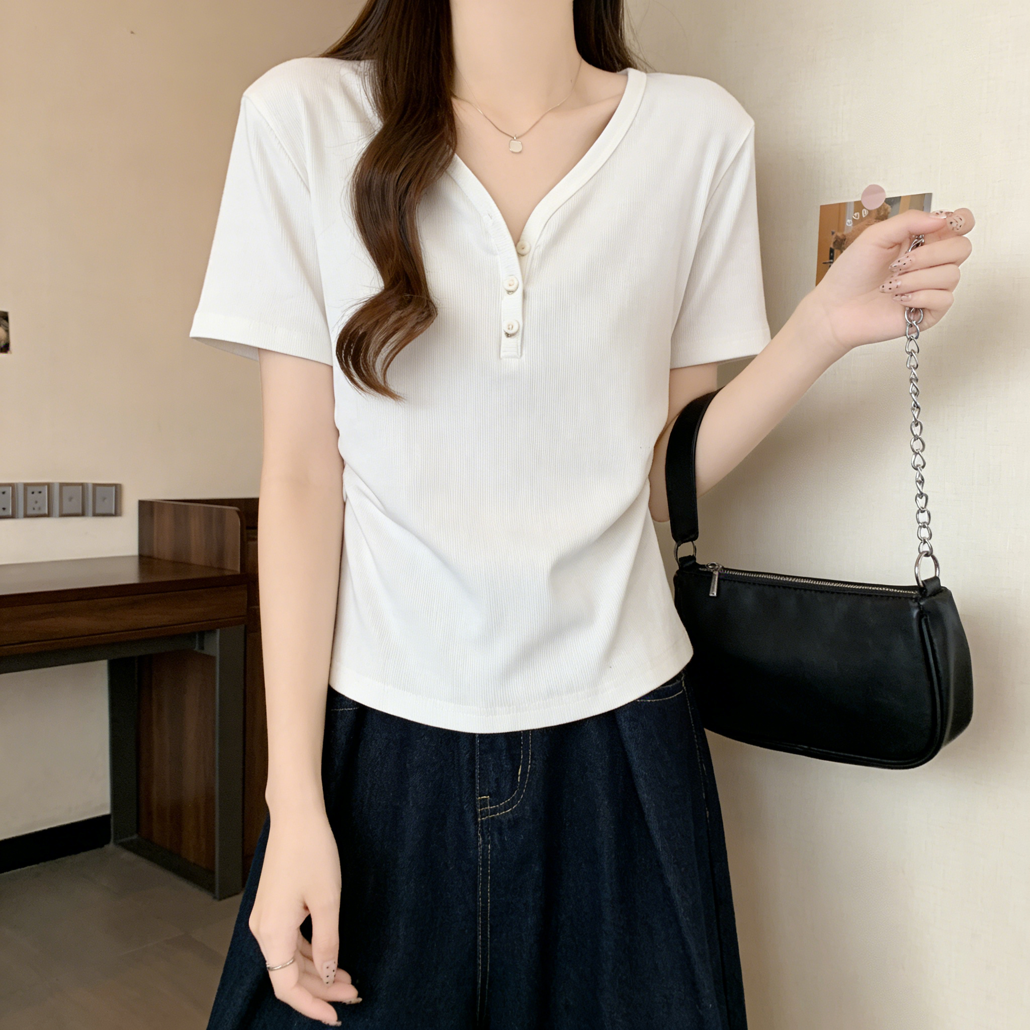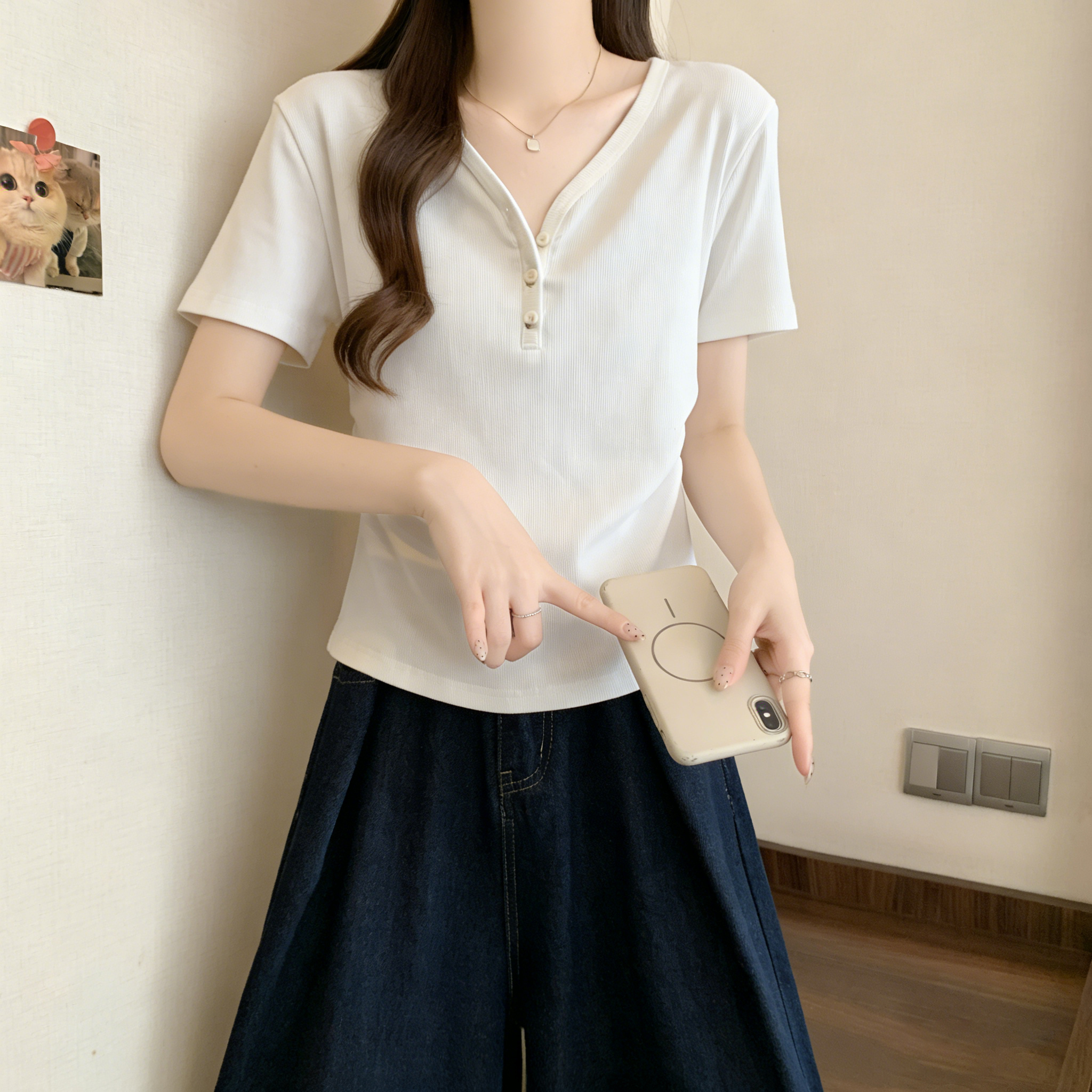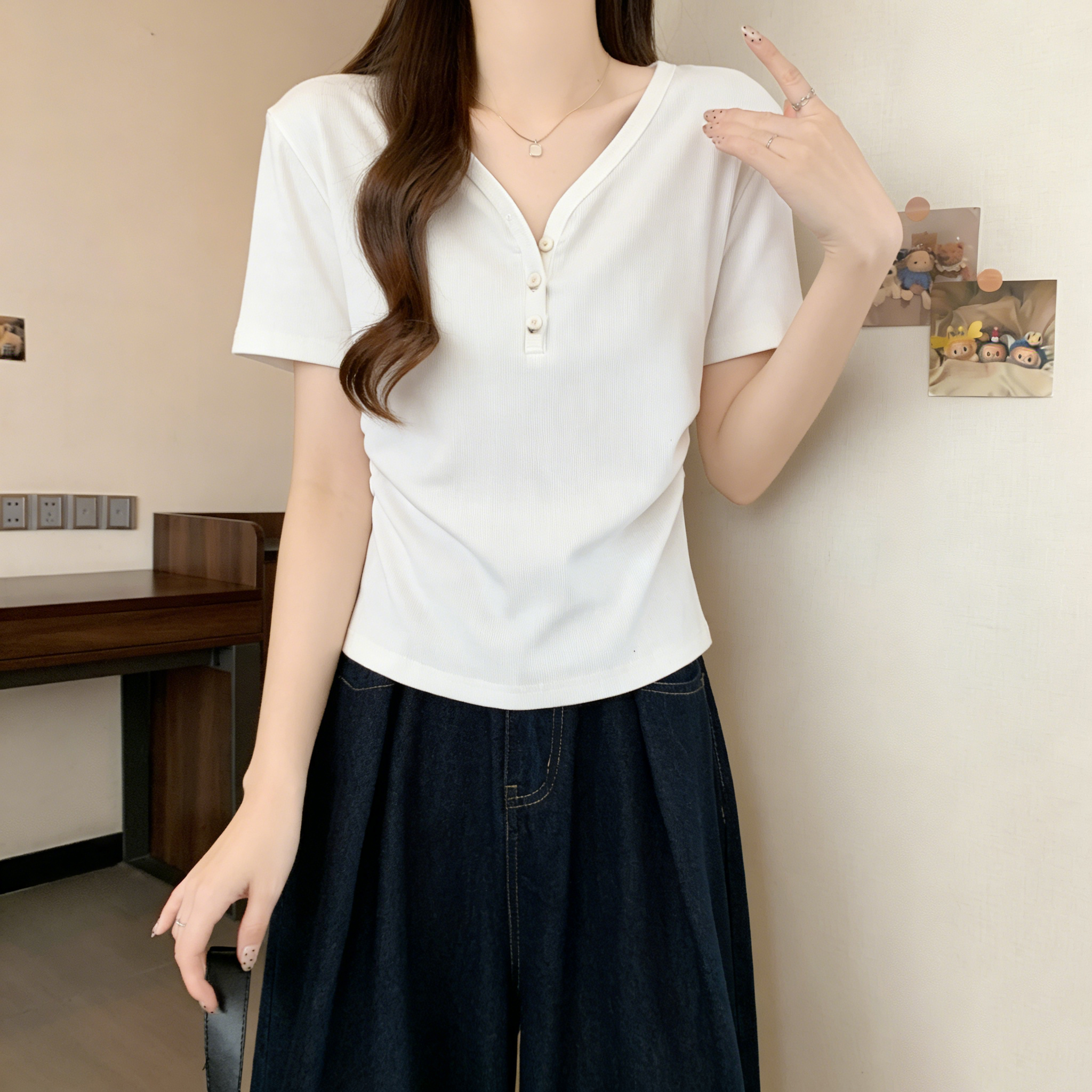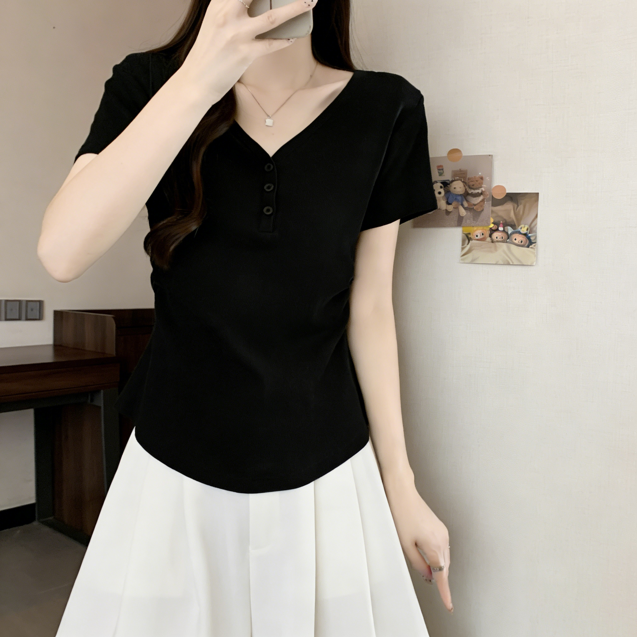 RY3072# 实拍~ 正肩v领修身显瘦短袖t恤女夏季大码胖MM纽扣褶皱显瘦上衣