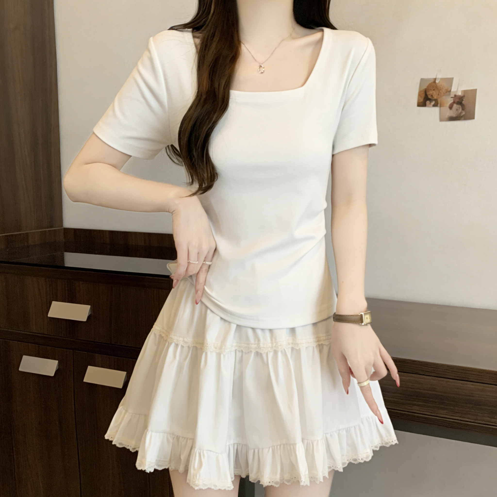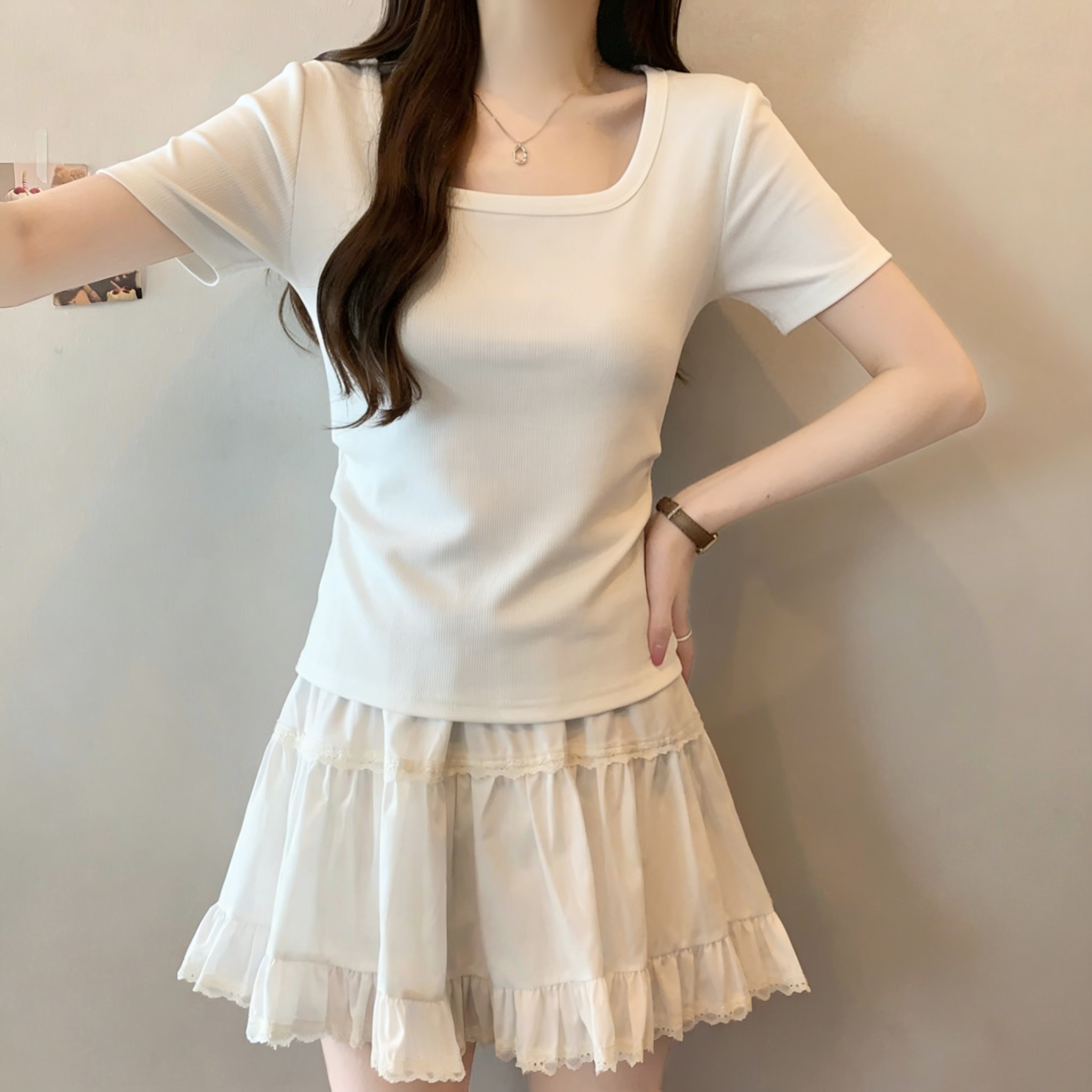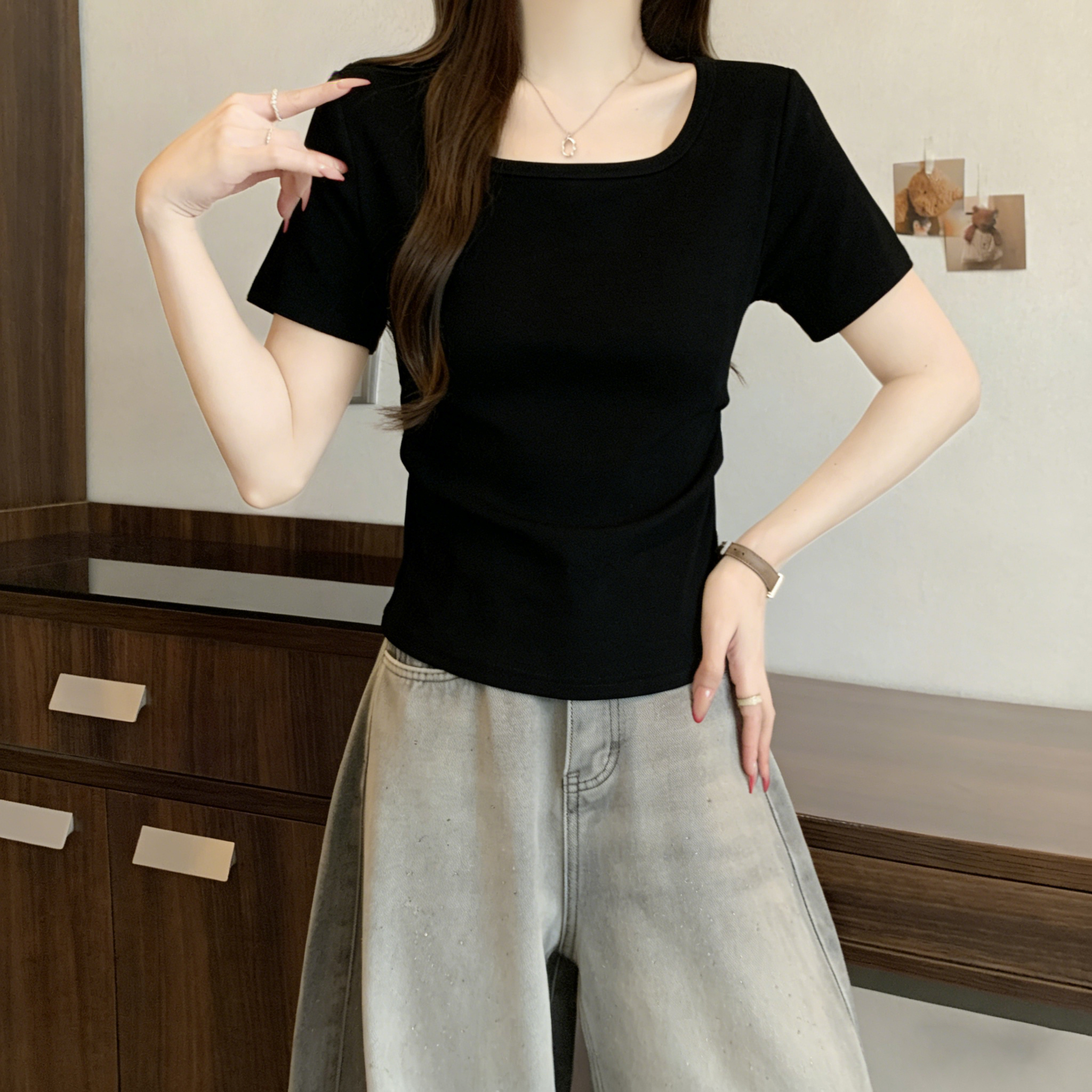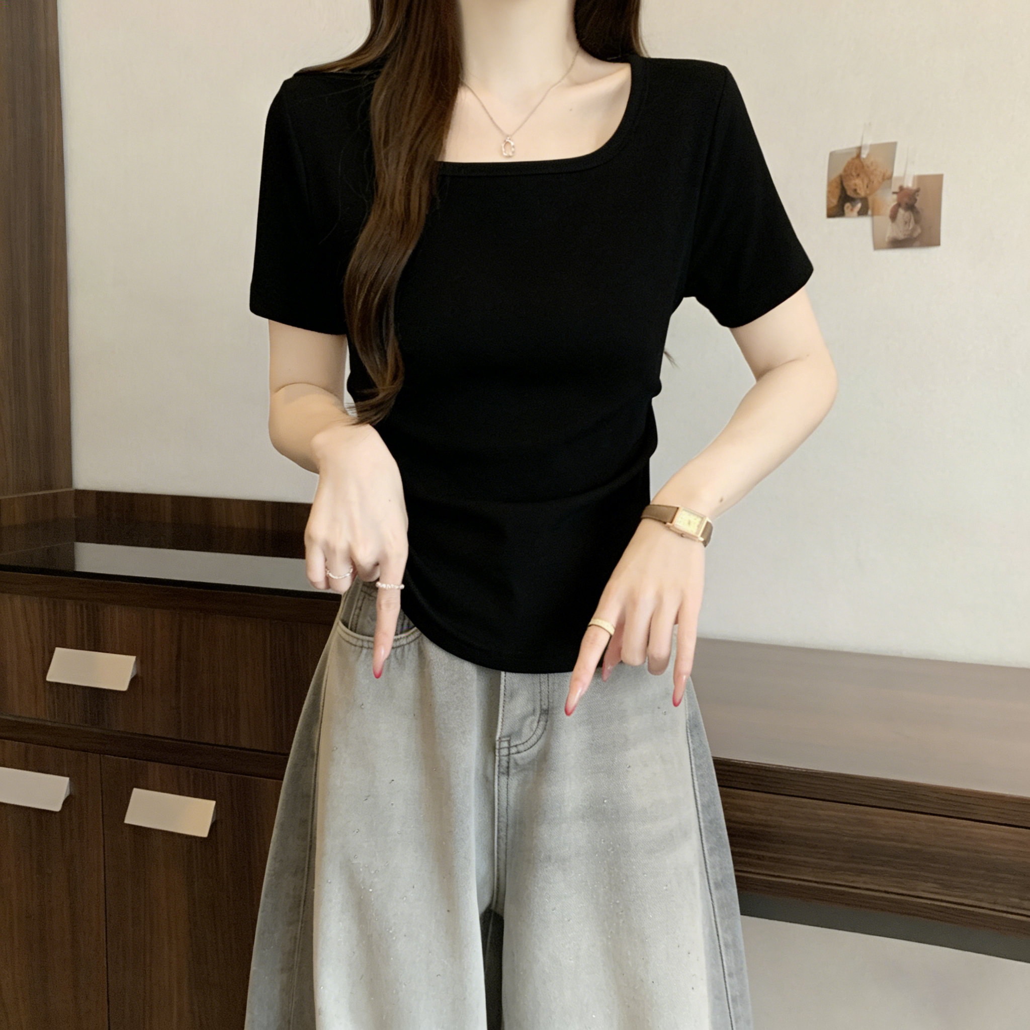 RY3073# 实拍~白色u领正肩短袖女t恤夏季2025新款胖mm遮肚子巨显瘦上衣