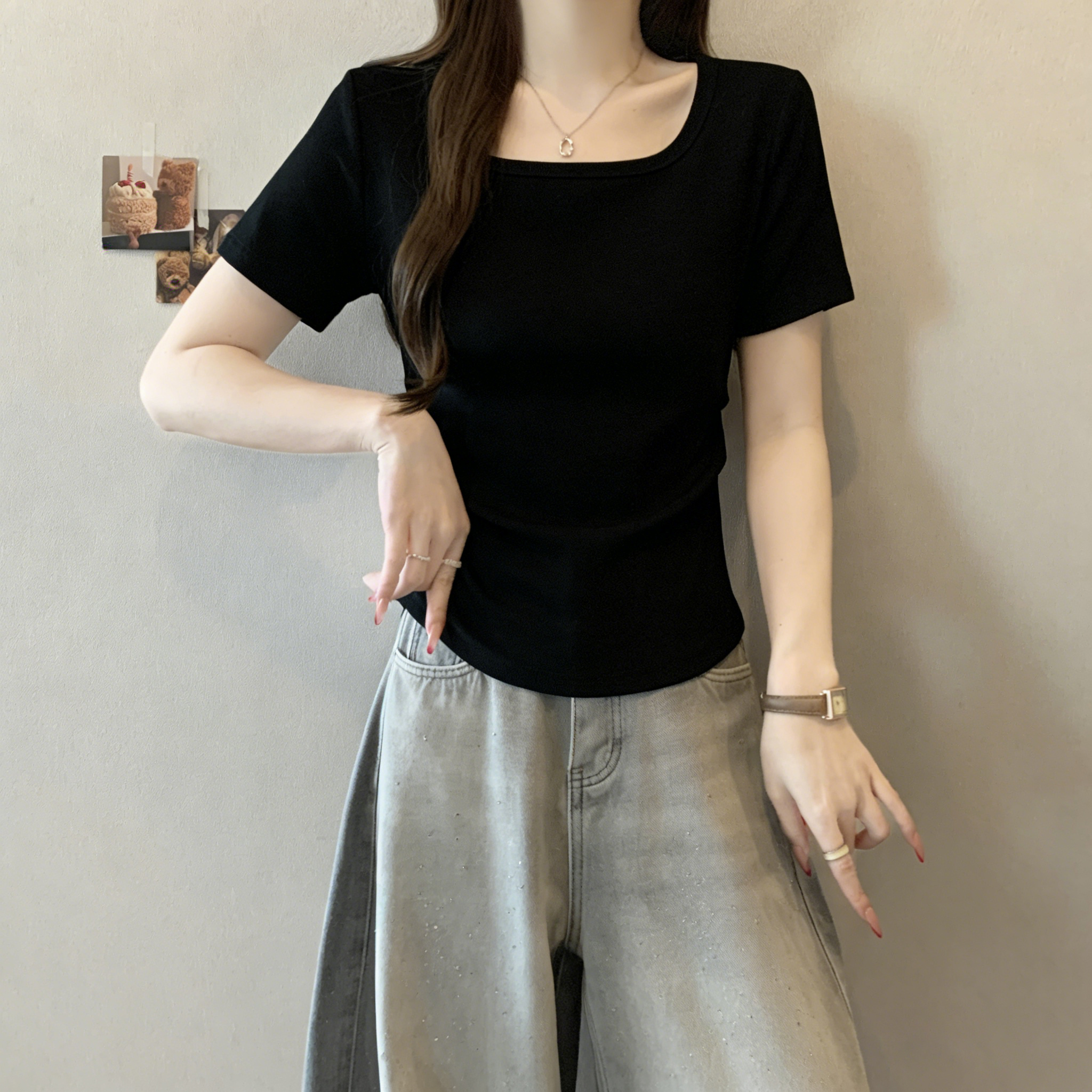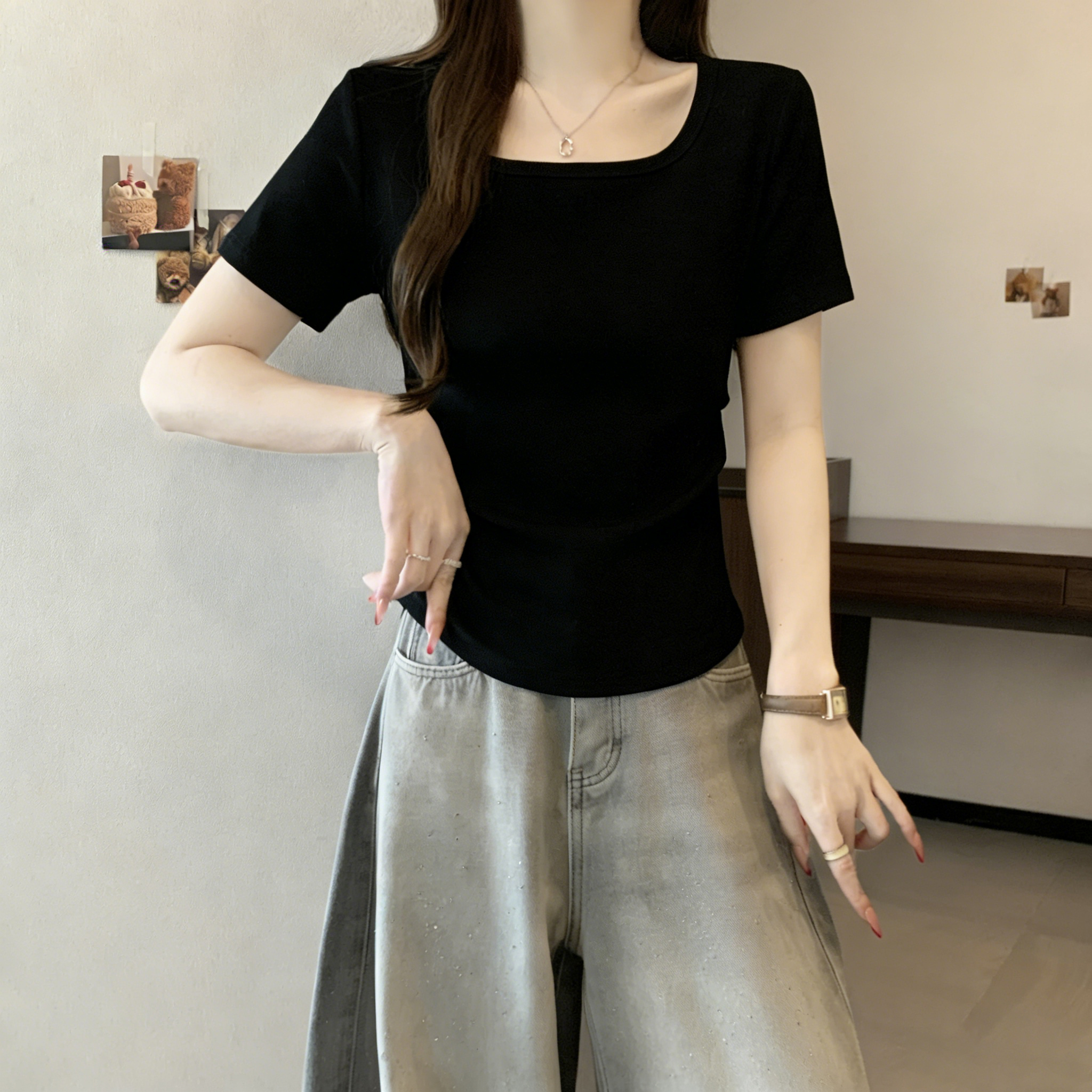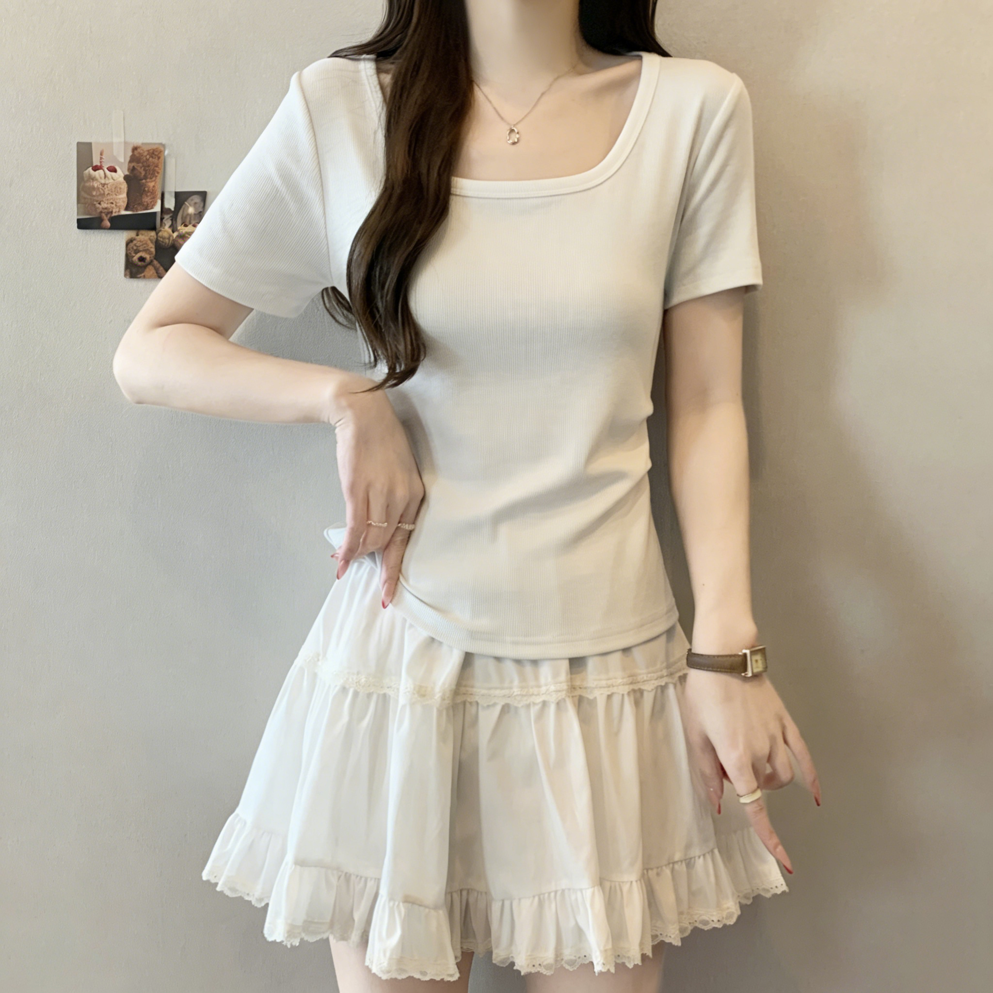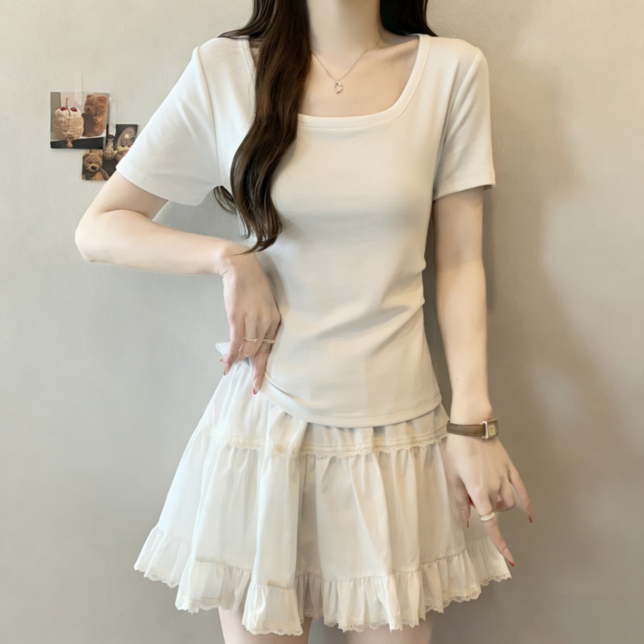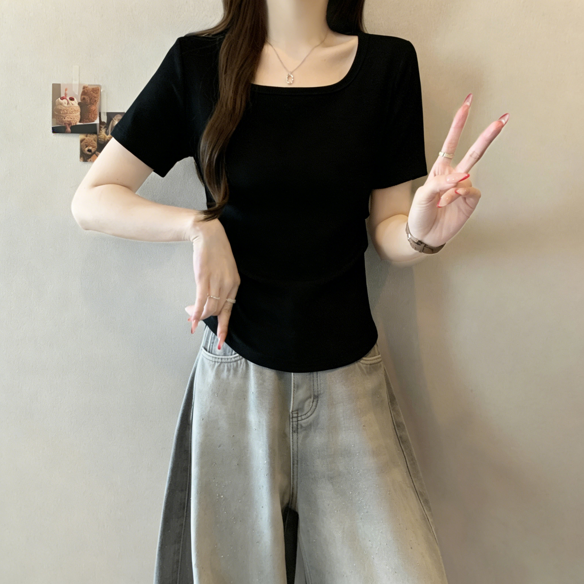 RY3073# 实拍~白色u领正肩短袖女t恤夏季2025新款胖mm遮肚子巨显瘦上衣