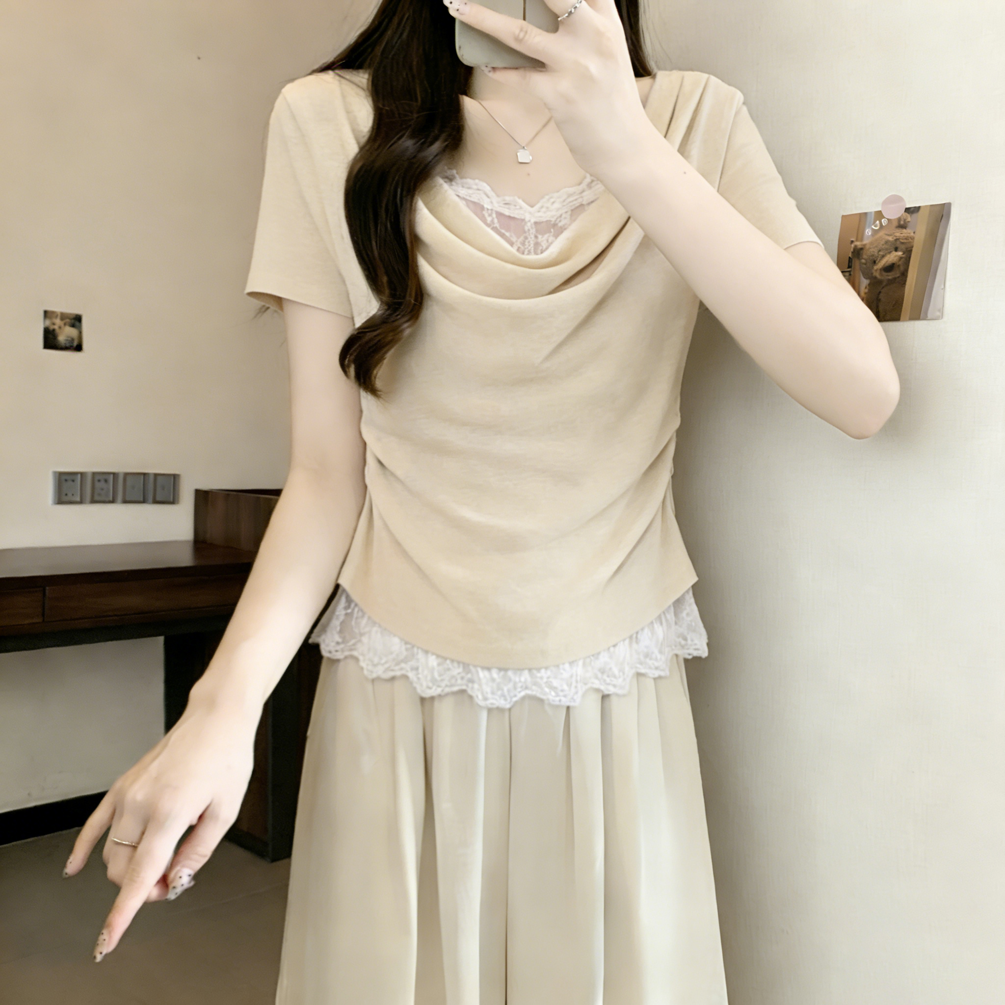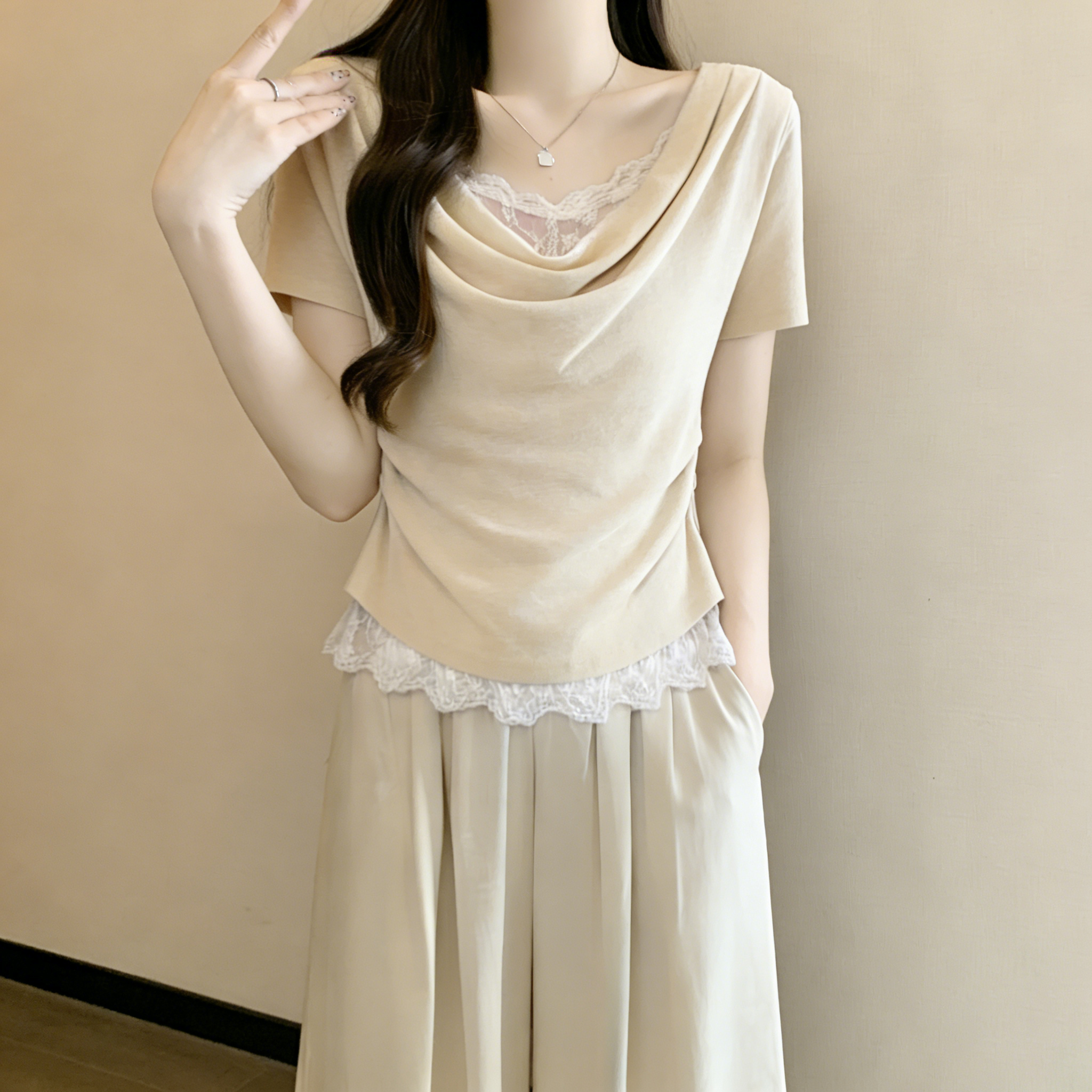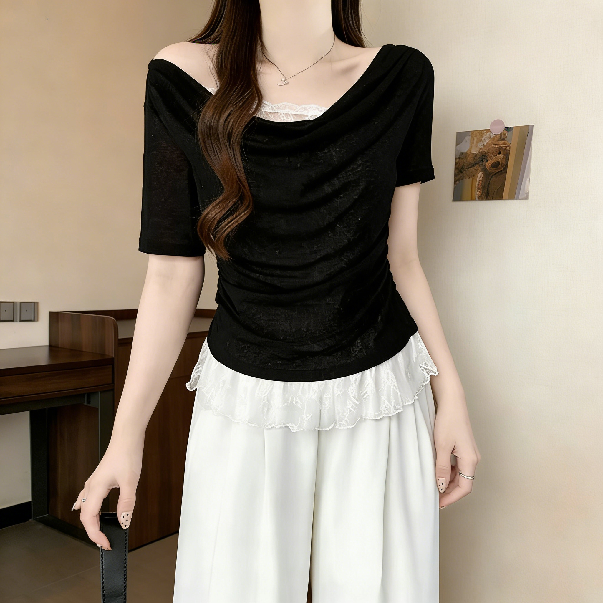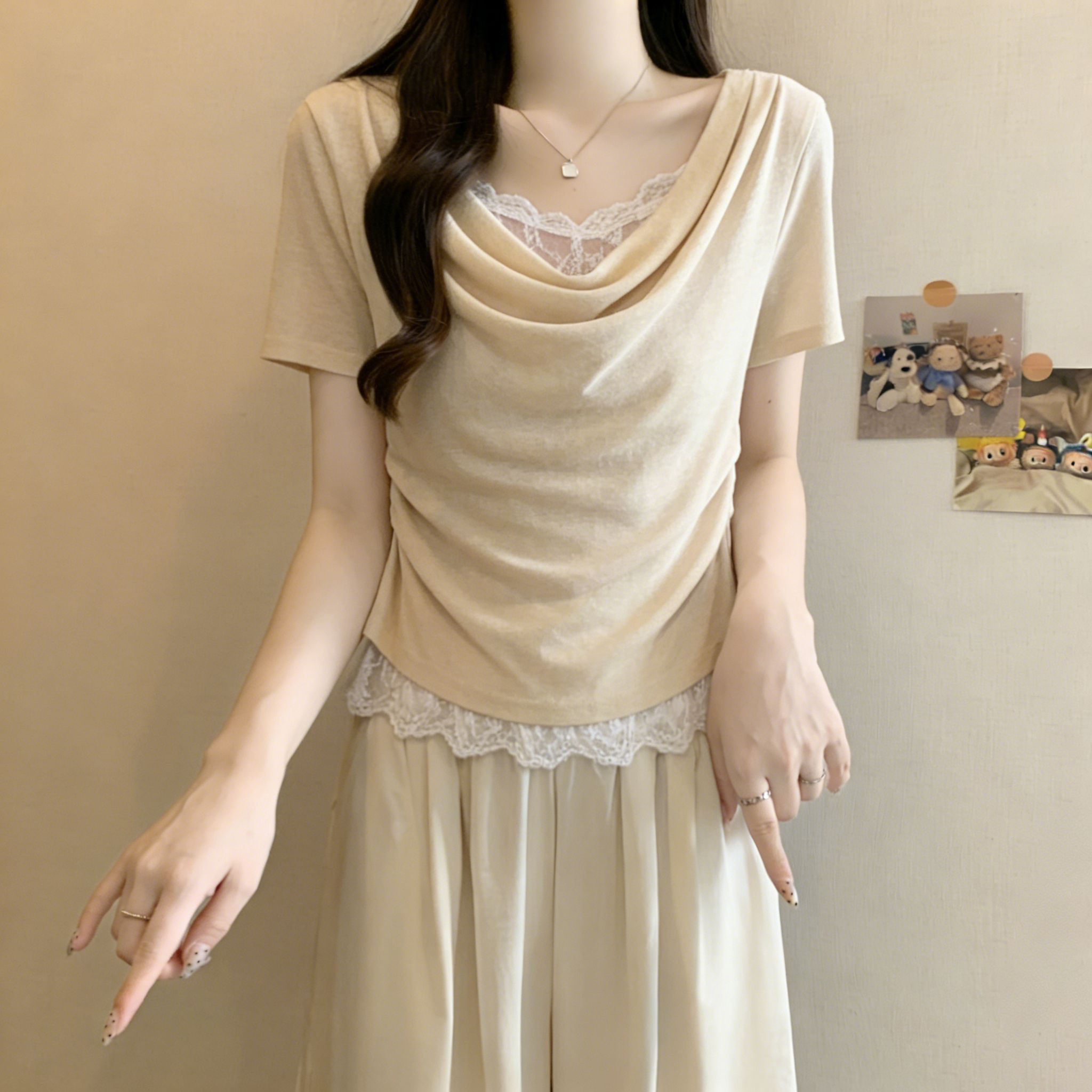 RY3075# 实拍~荡领短袖t恤女2026夏季新款别致胖MM纯欲蕾丝拼接上衣