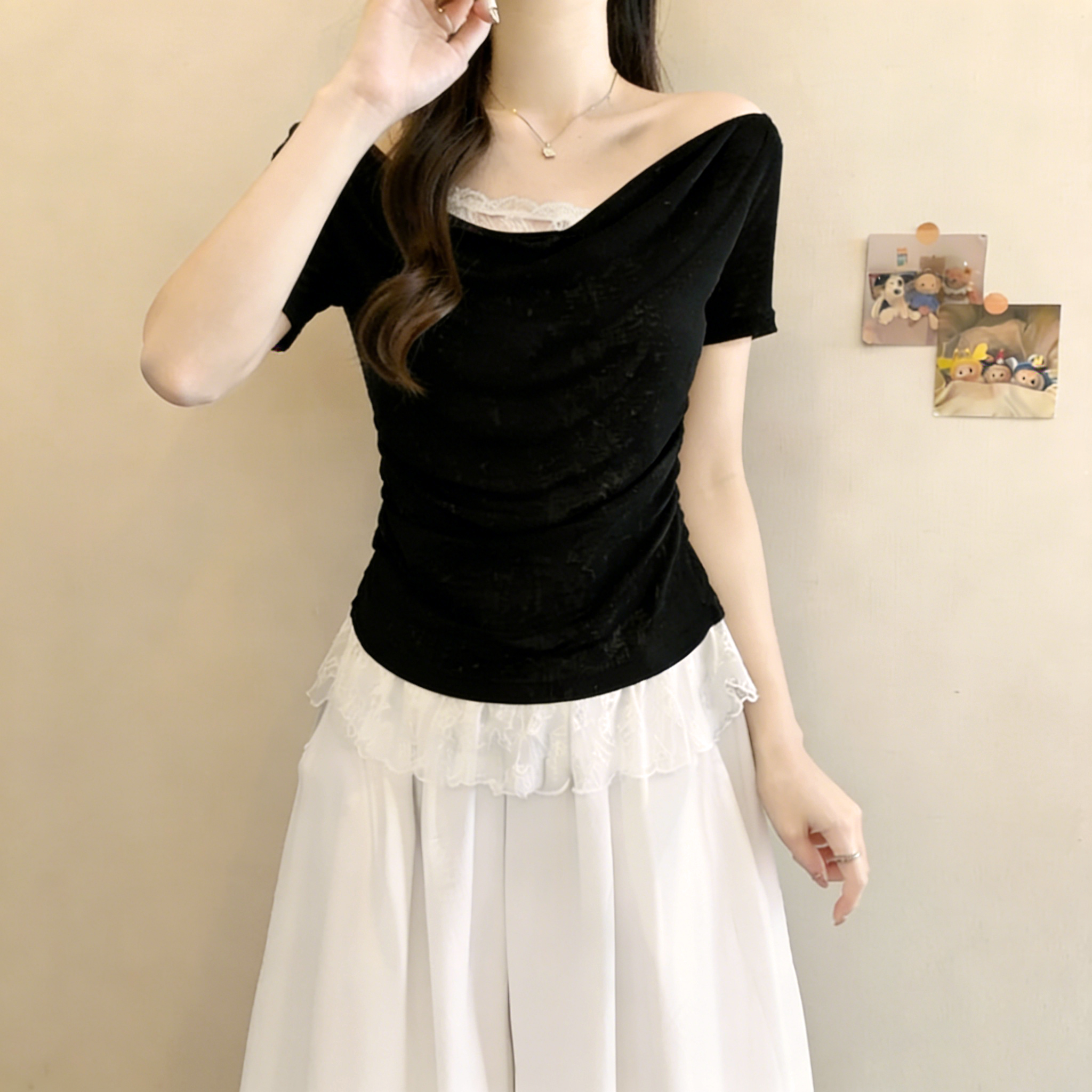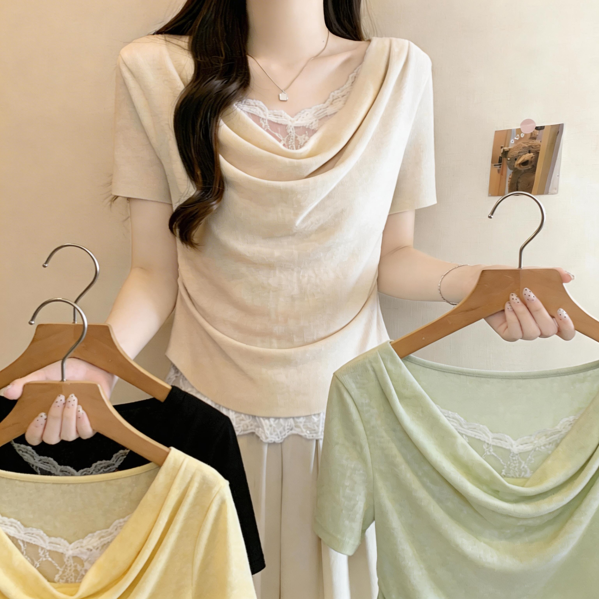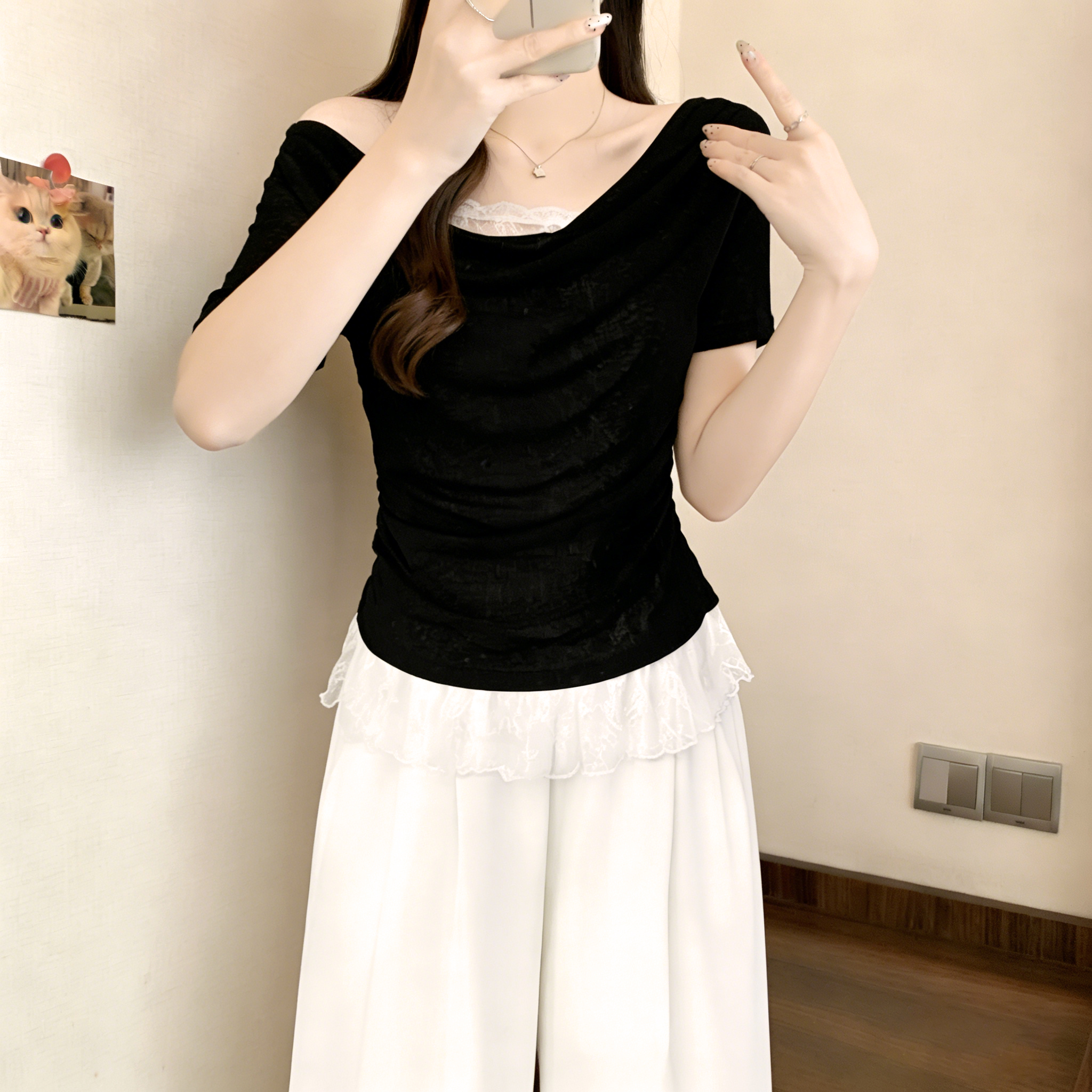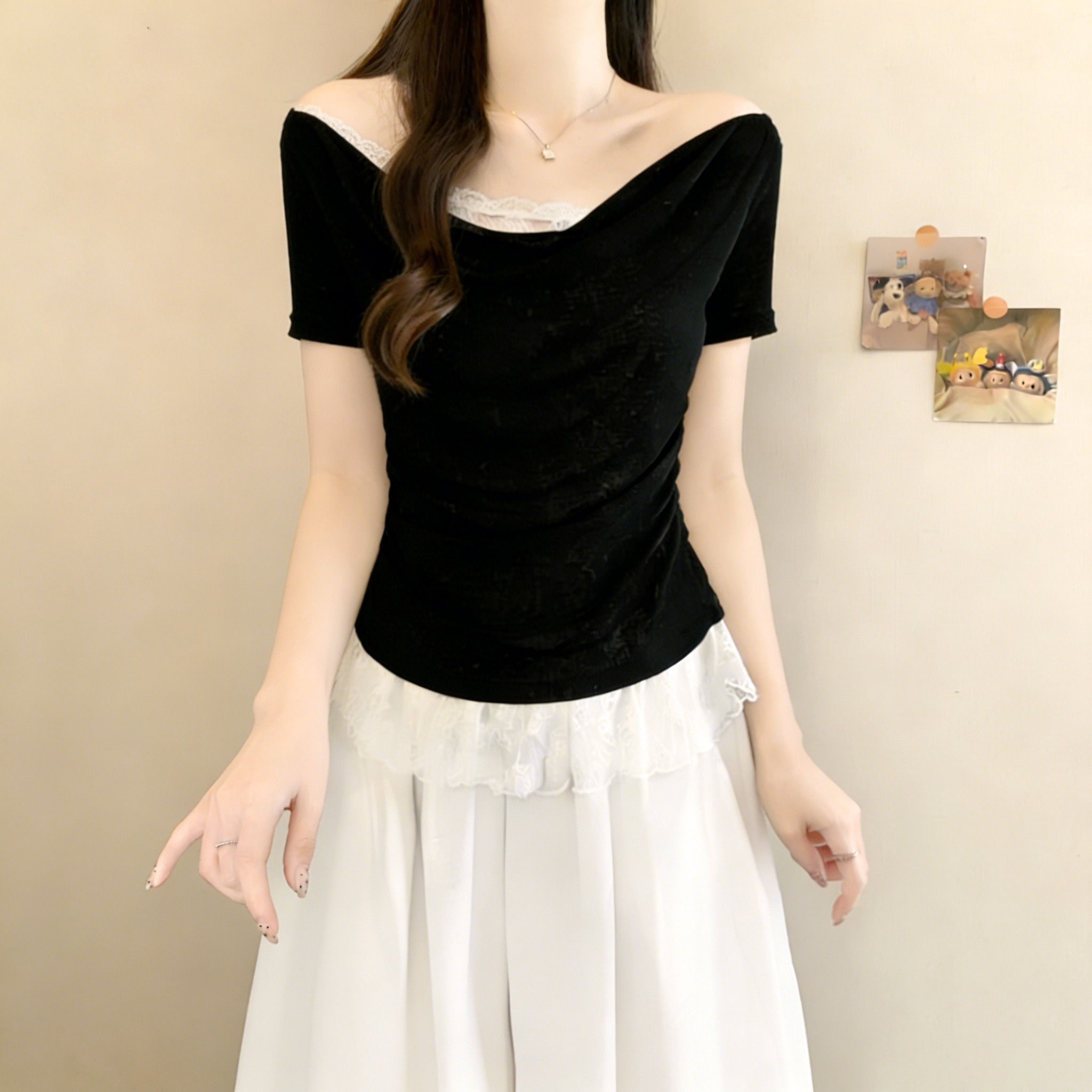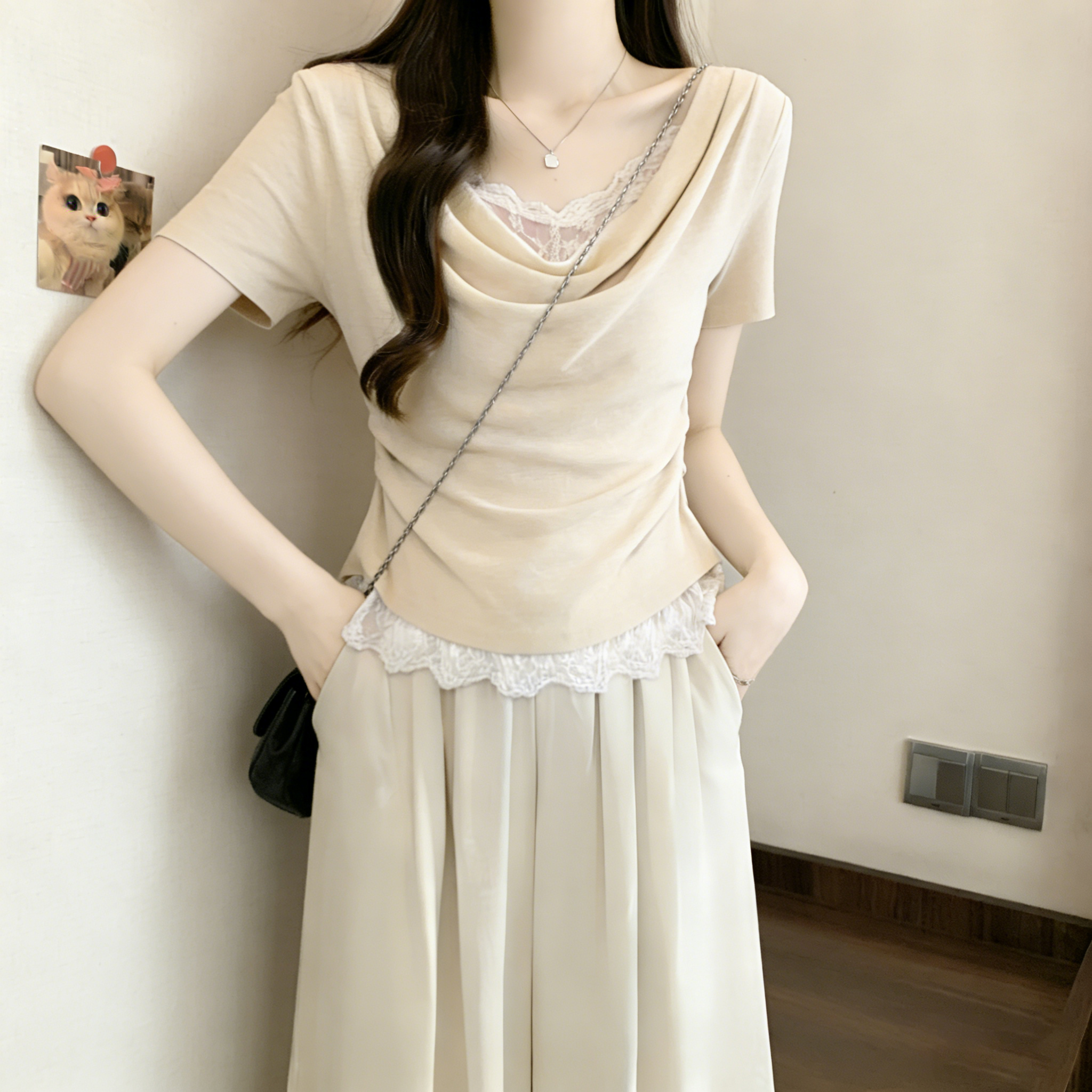 RY3075# 实拍~荡领短袖t恤女2026夏季新款别致胖MM纯欲蕾丝拼接上衣