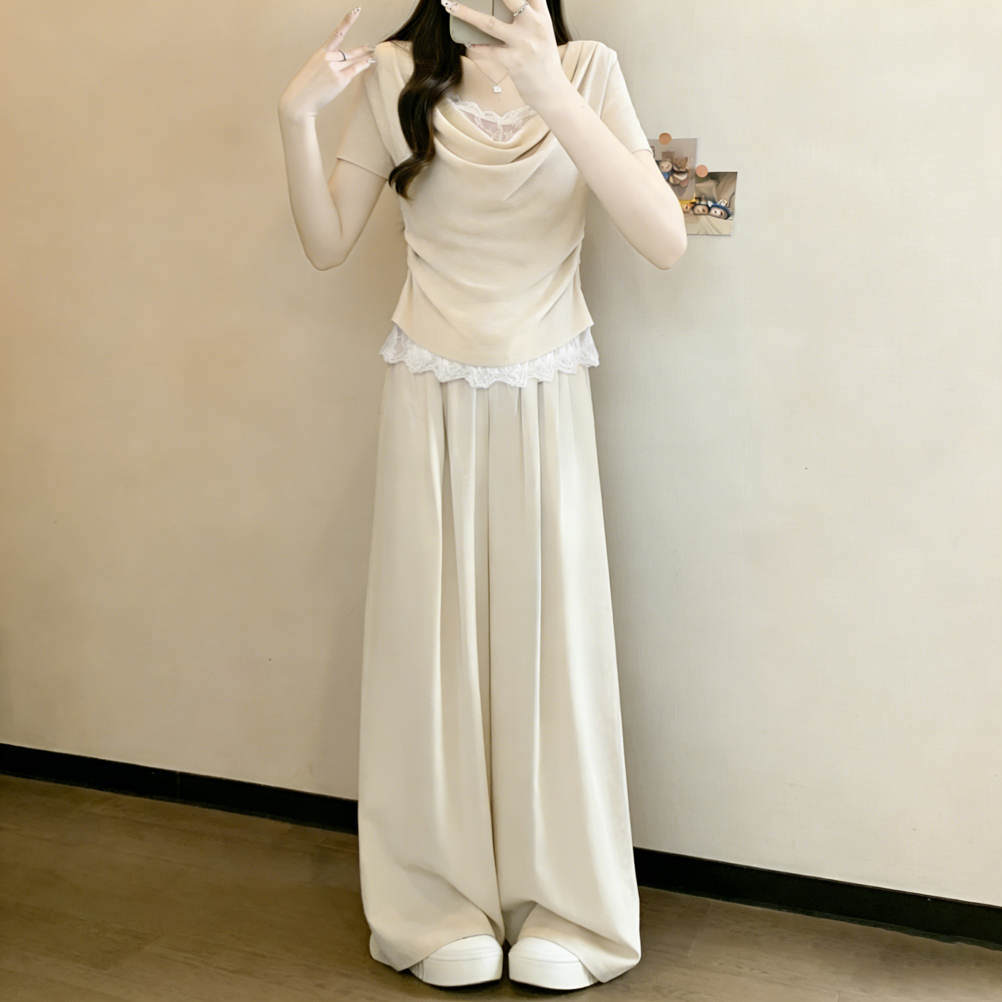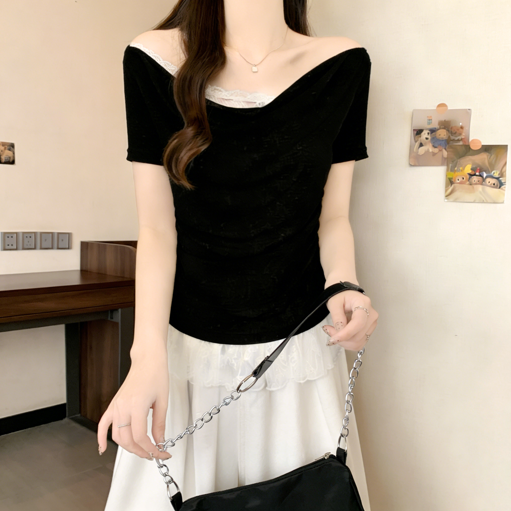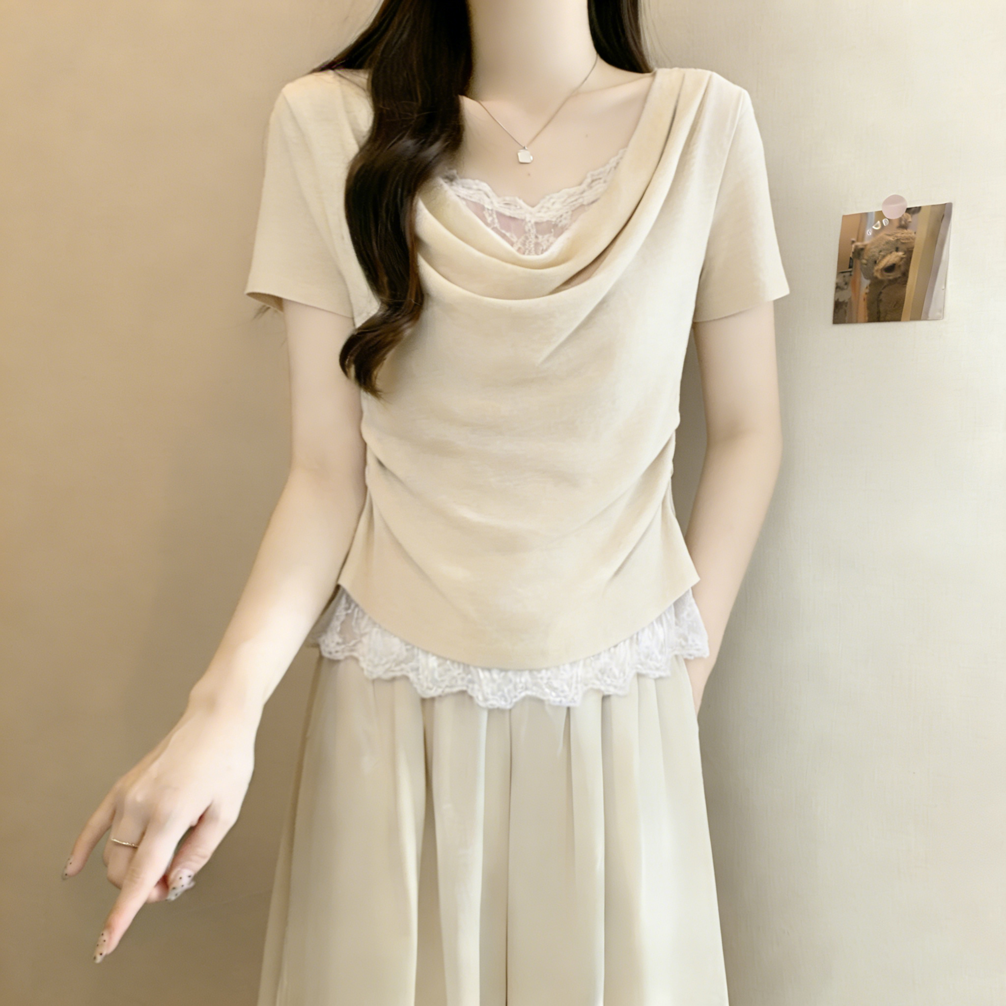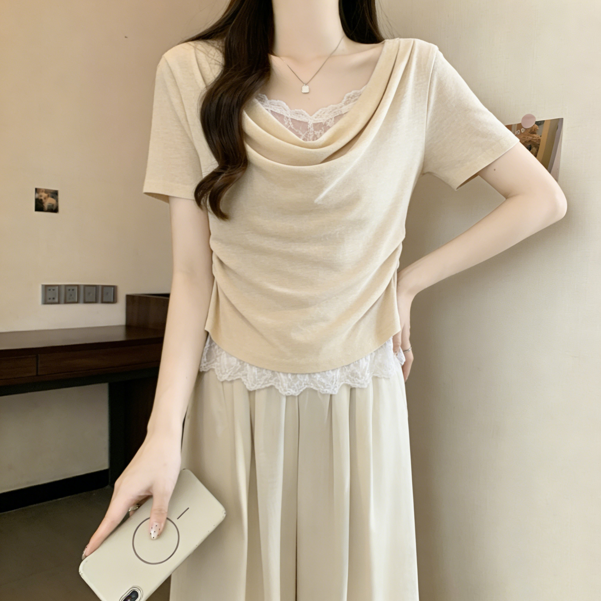 RY3075# 实拍~荡领短袖t恤女2026夏季新款别致胖MM纯欲蕾丝拼接上衣