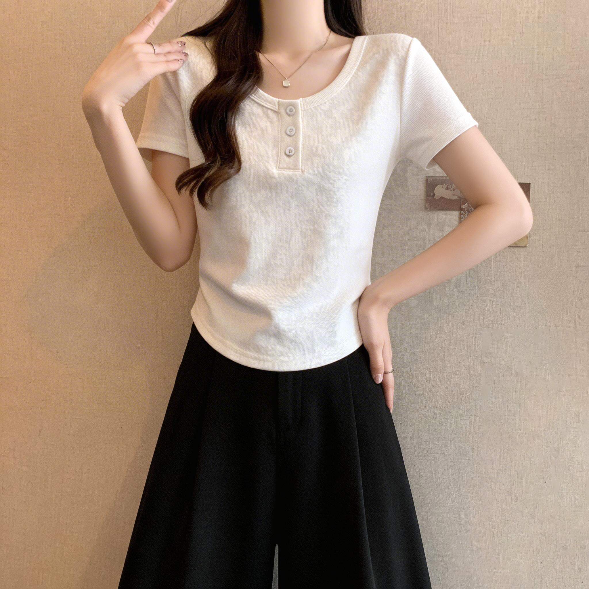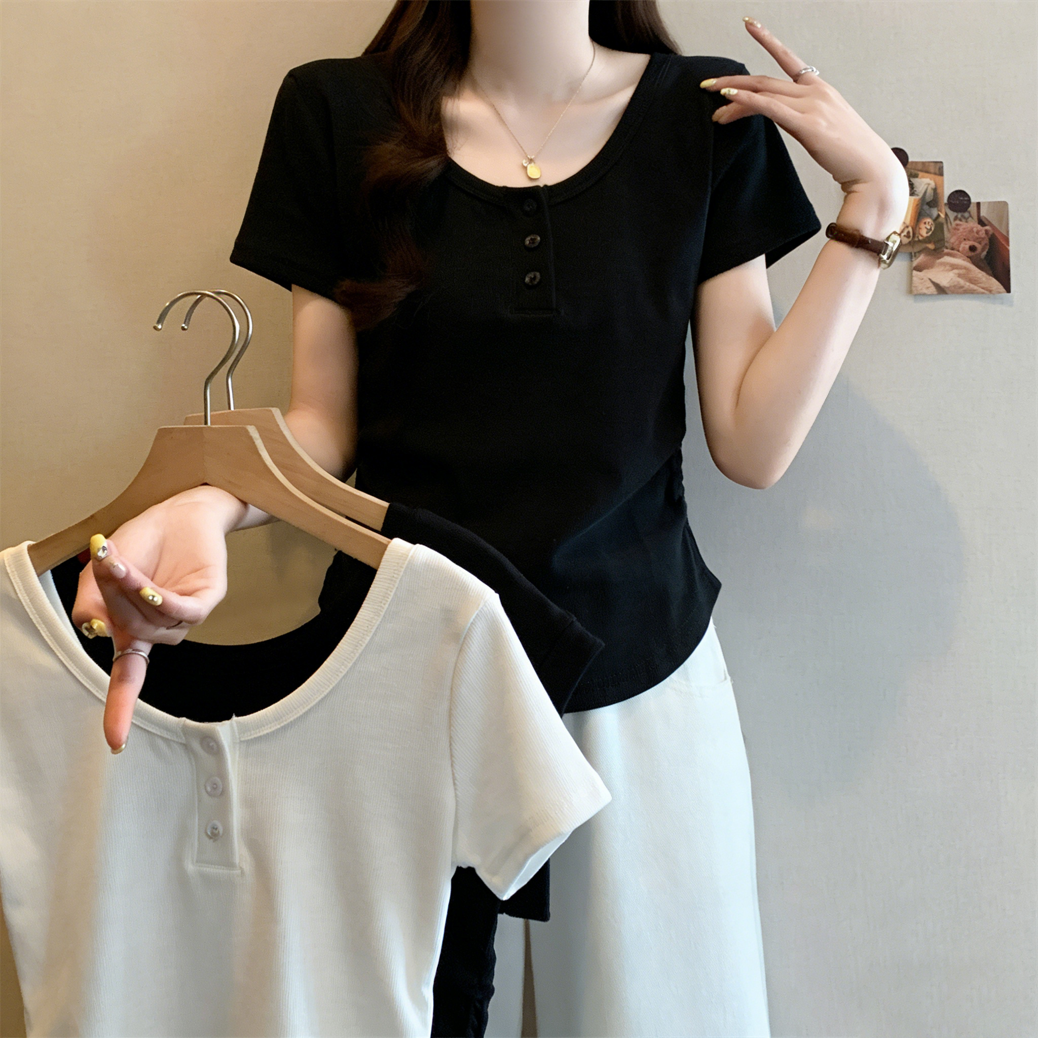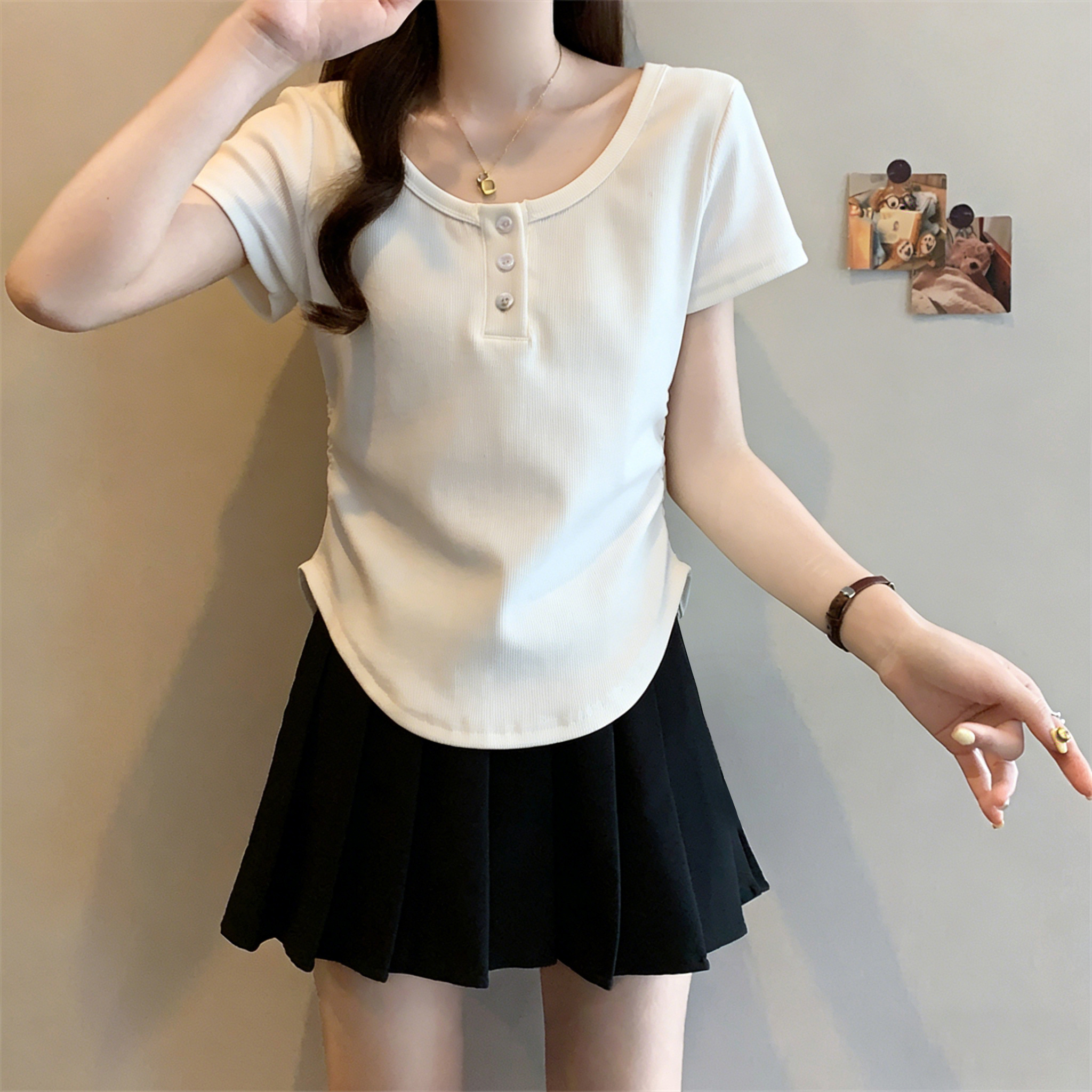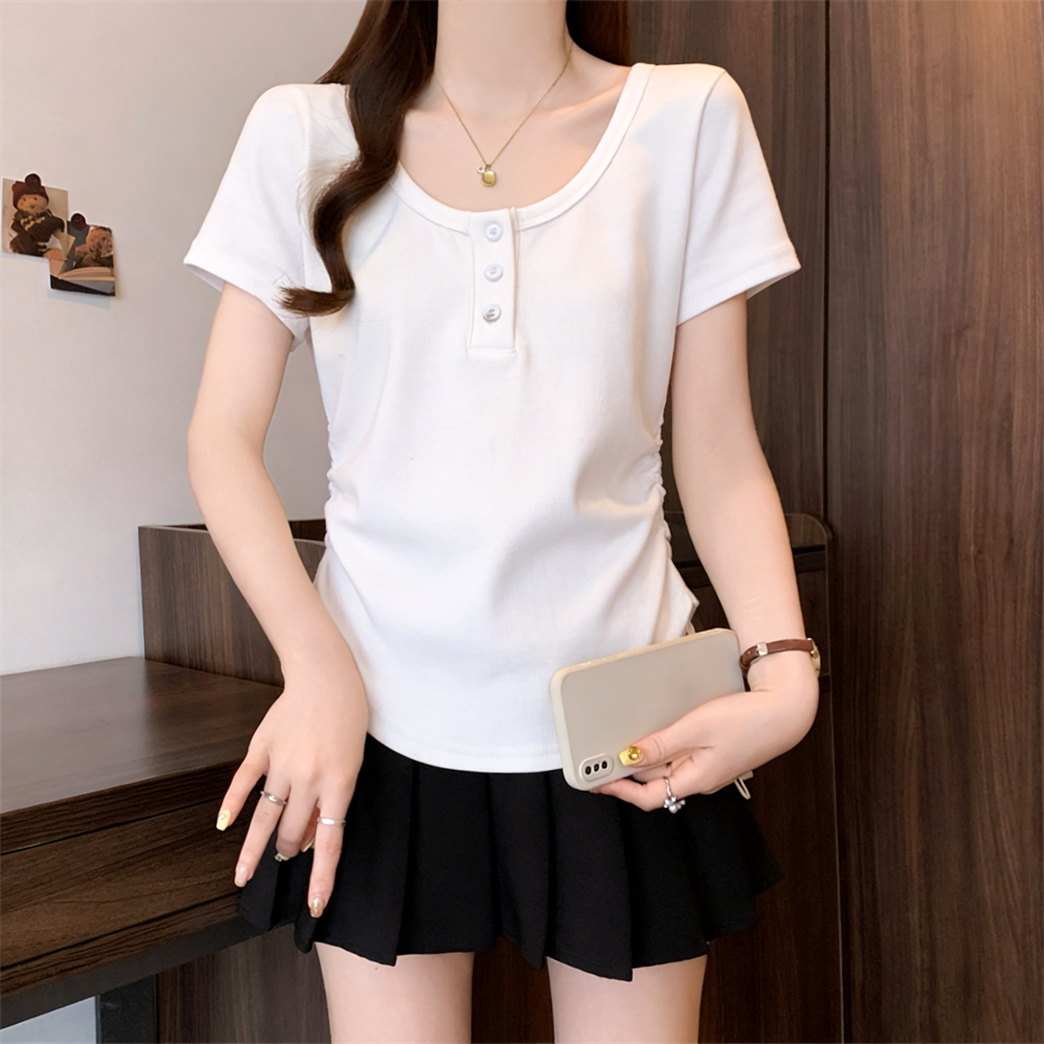 RY3076# 实拍~u领正肩短袖t恤女夏季胖mm遮肚子显瘦甜辣短款不规则上衣