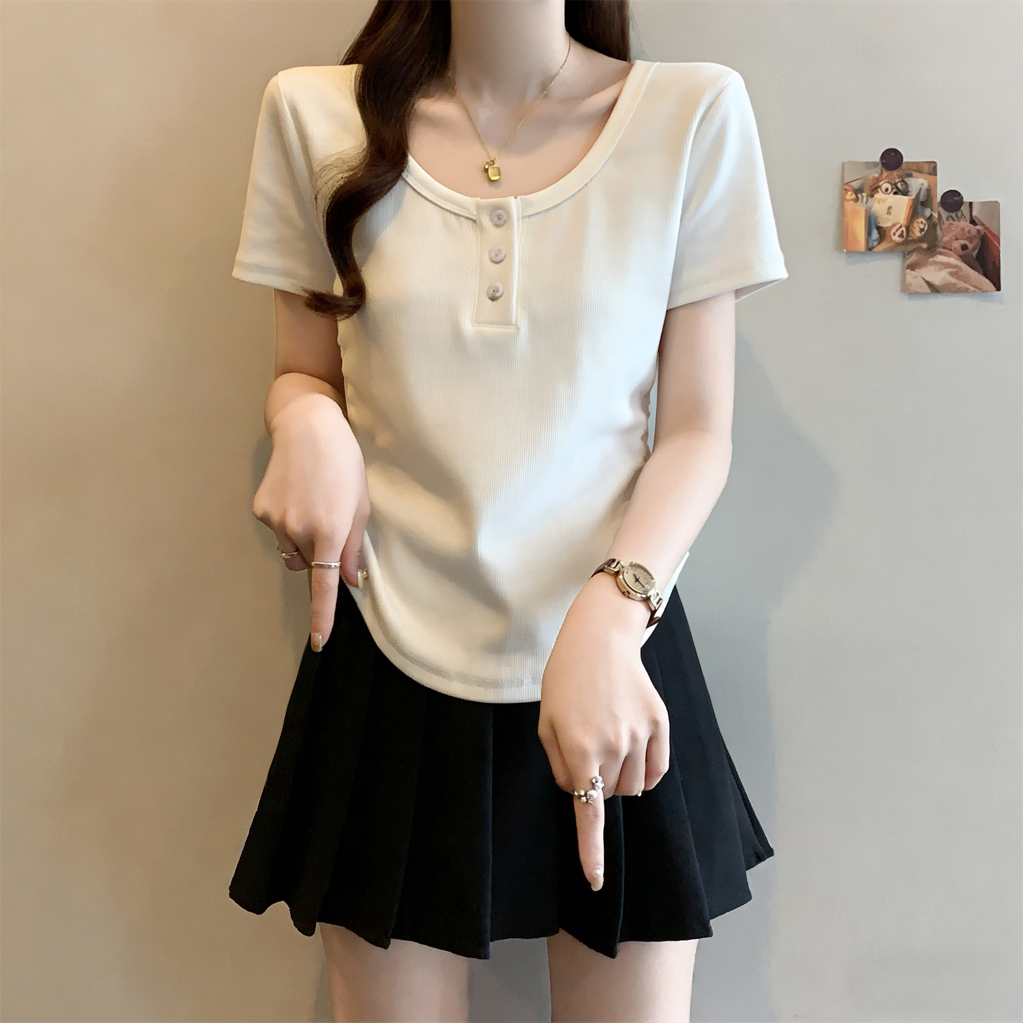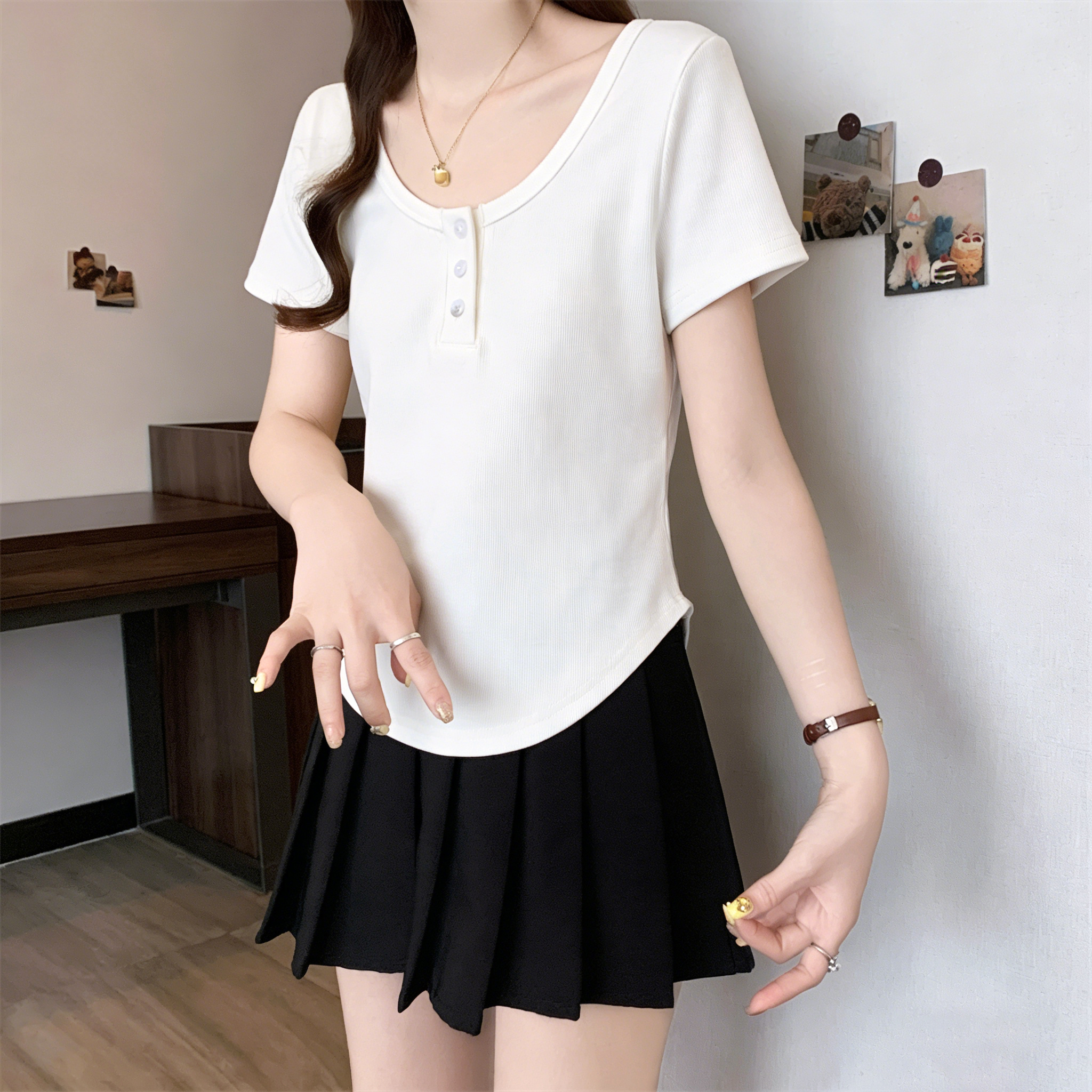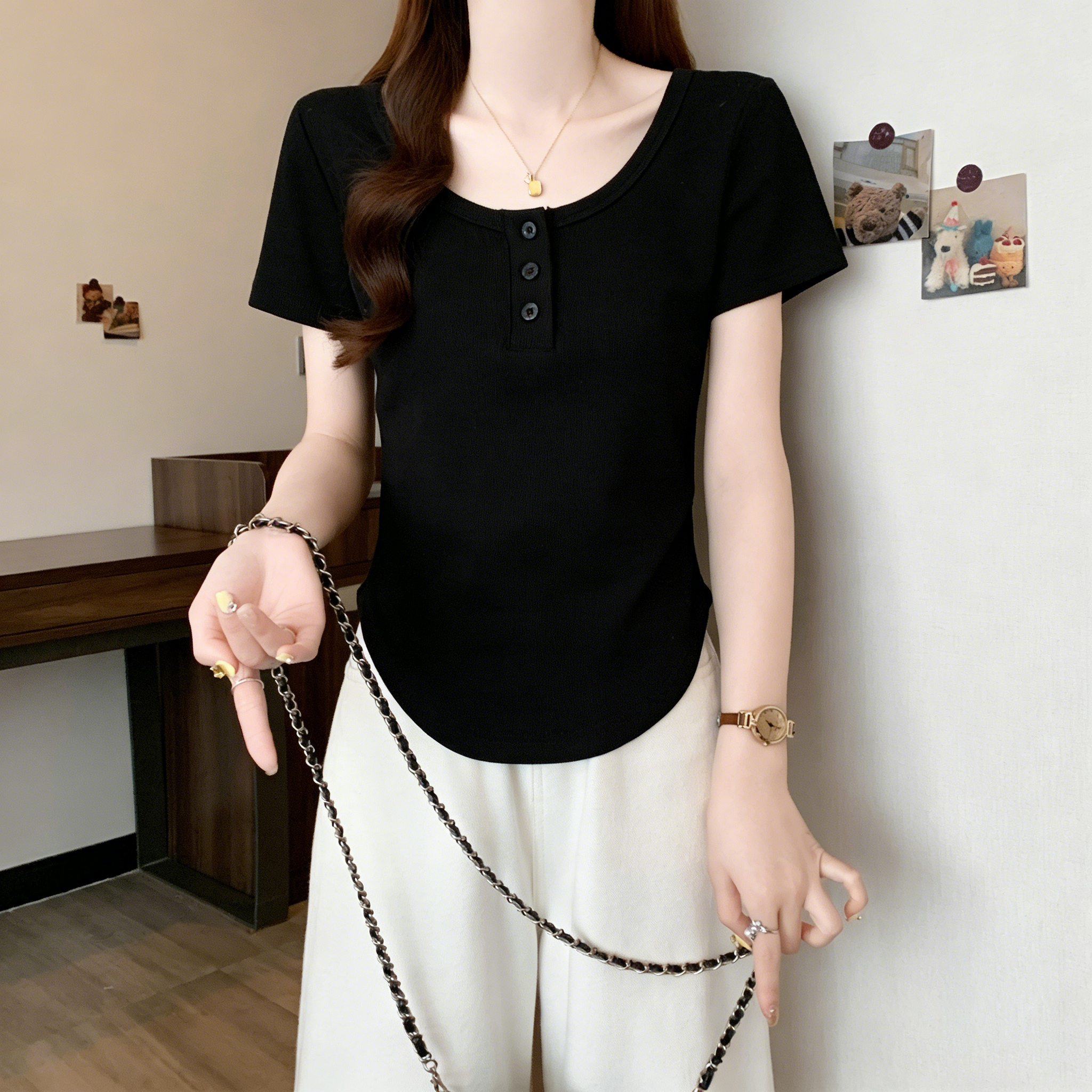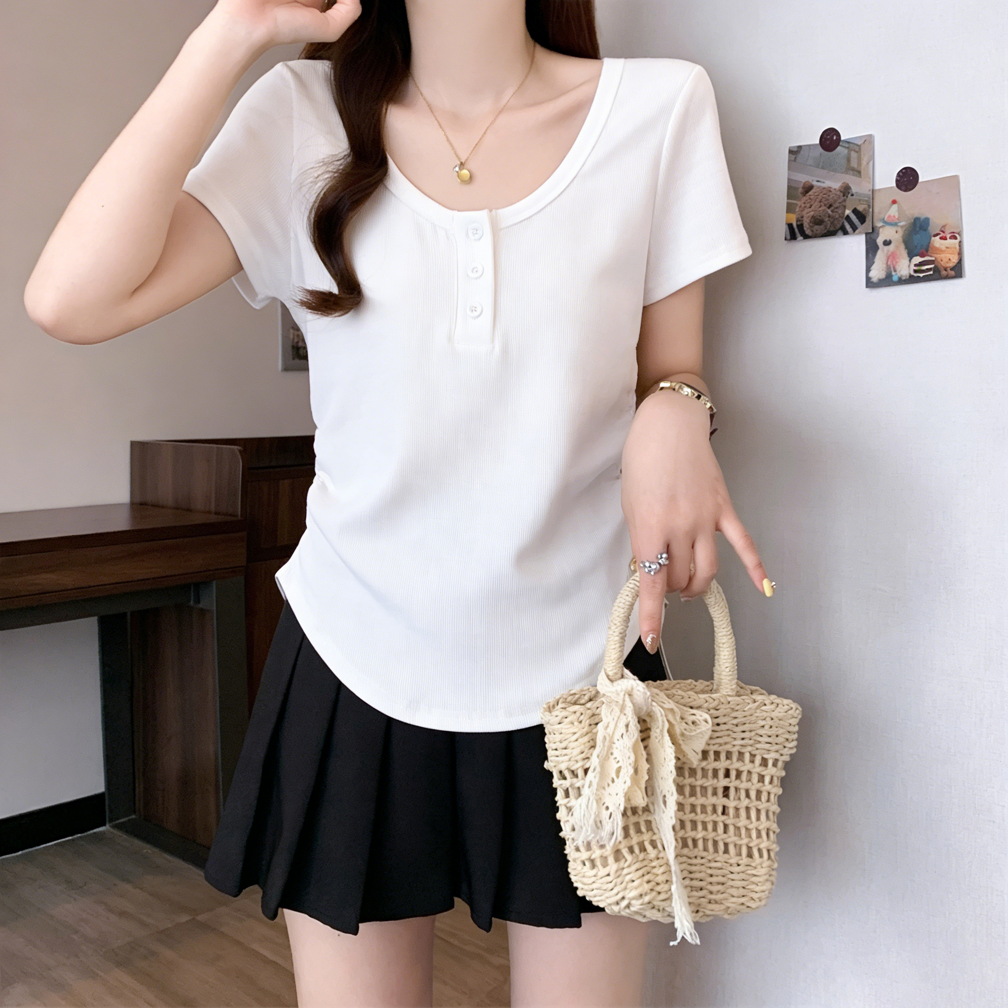 RY3076# 实拍~u领正肩短袖t恤女夏季胖mm遮肚子显瘦甜辣短款不规则上衣