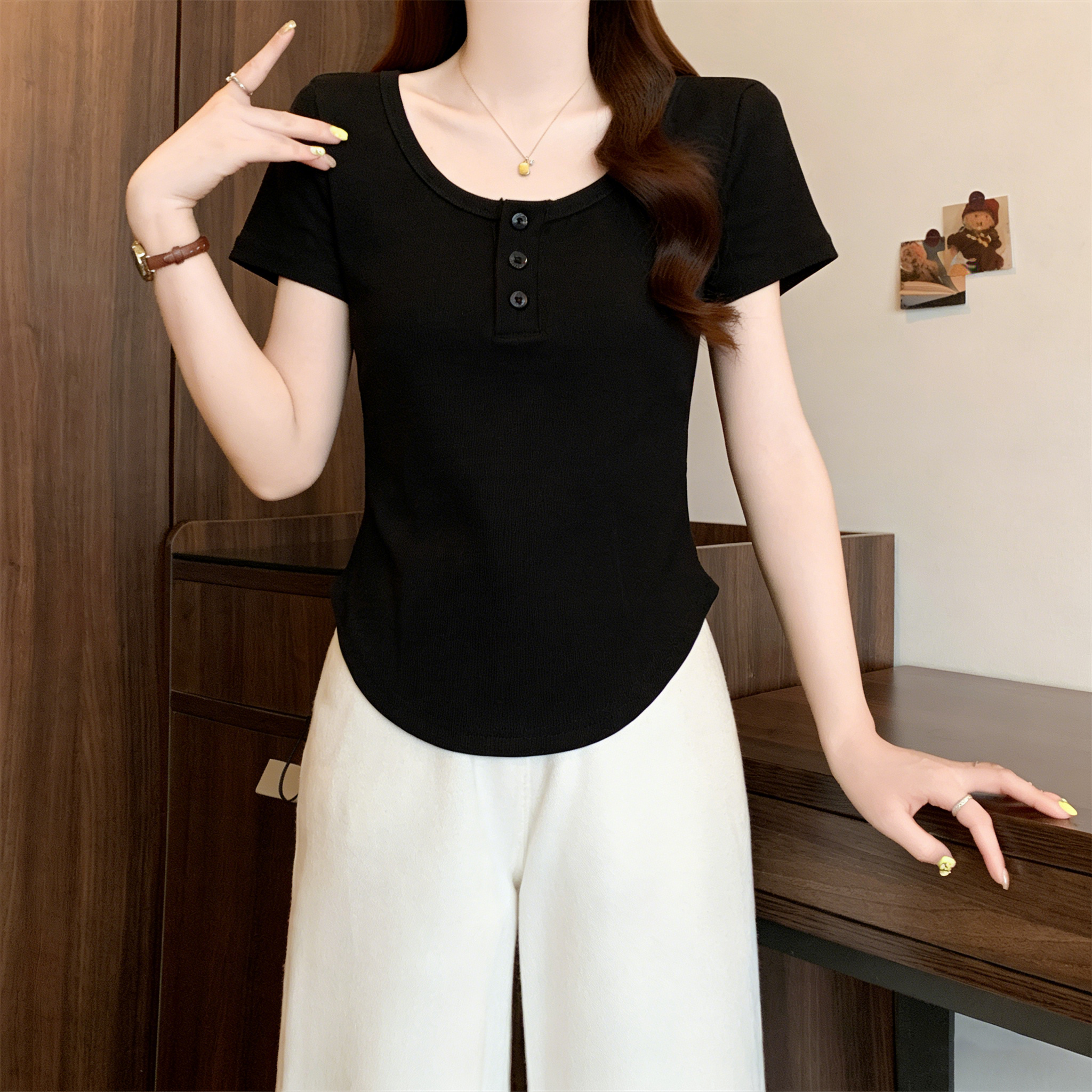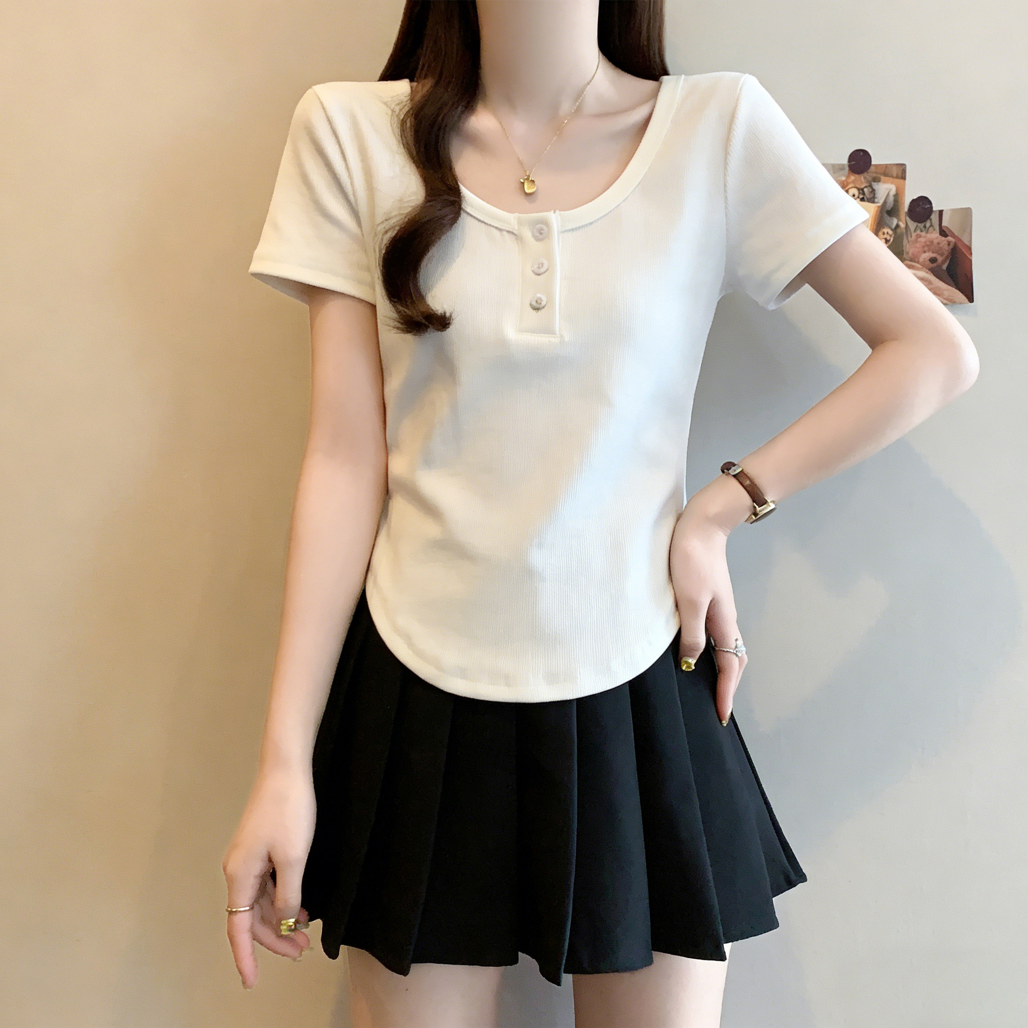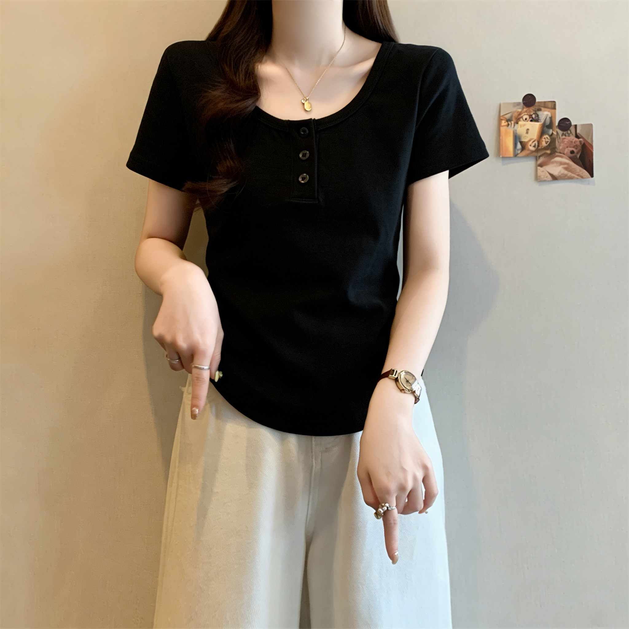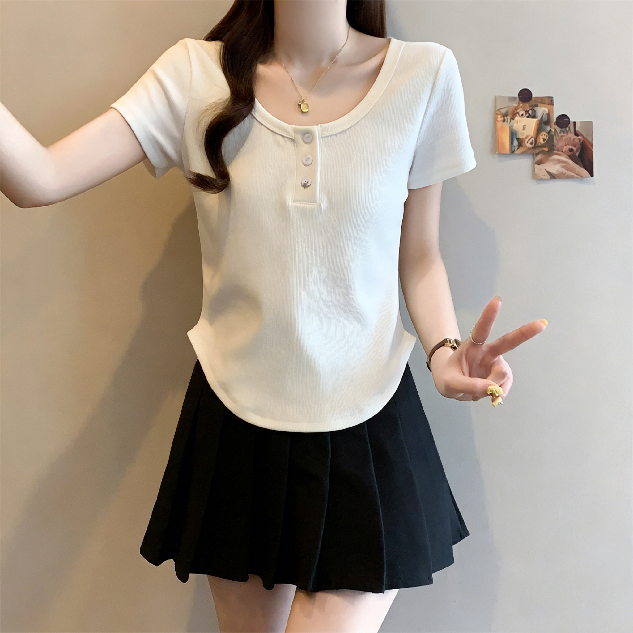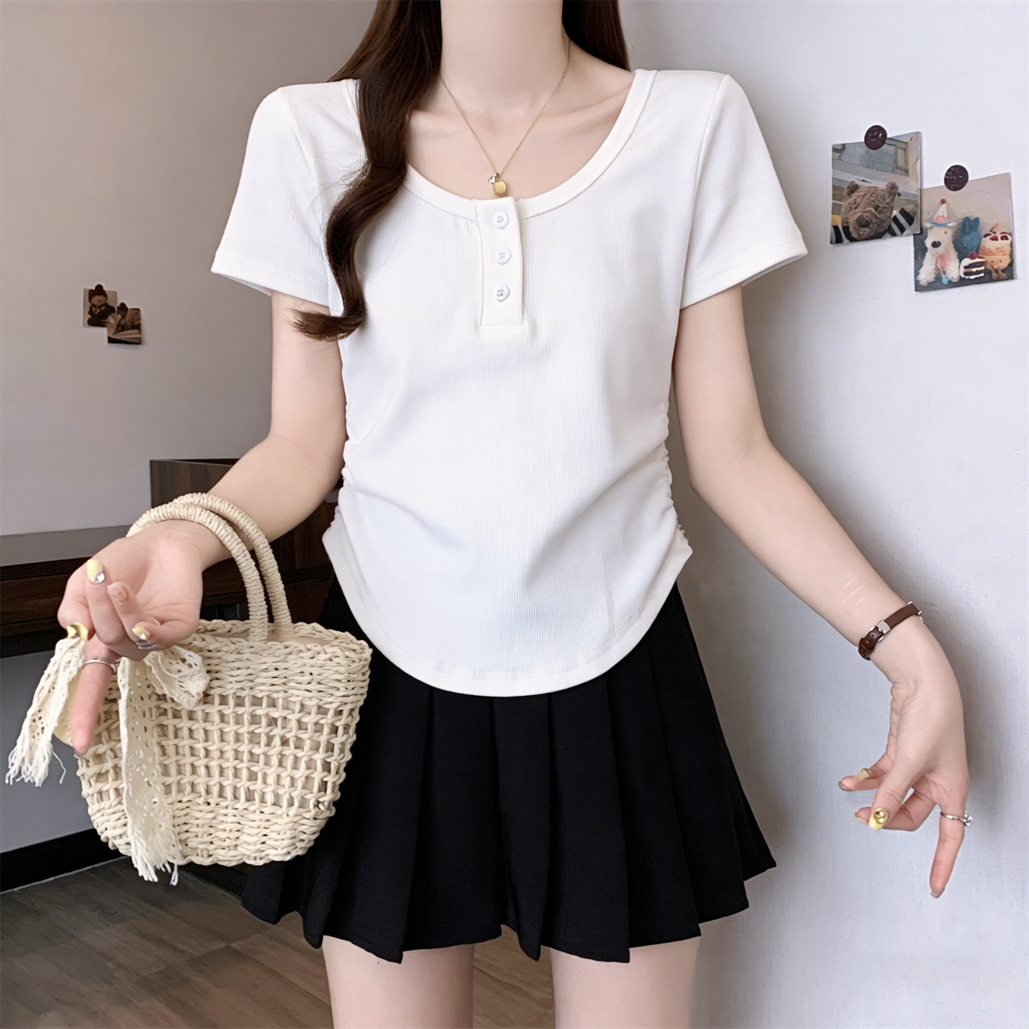 RY3076# 实拍~u领正肩短袖t恤女夏季胖mm遮肚子显瘦甜辣短款不规则上衣