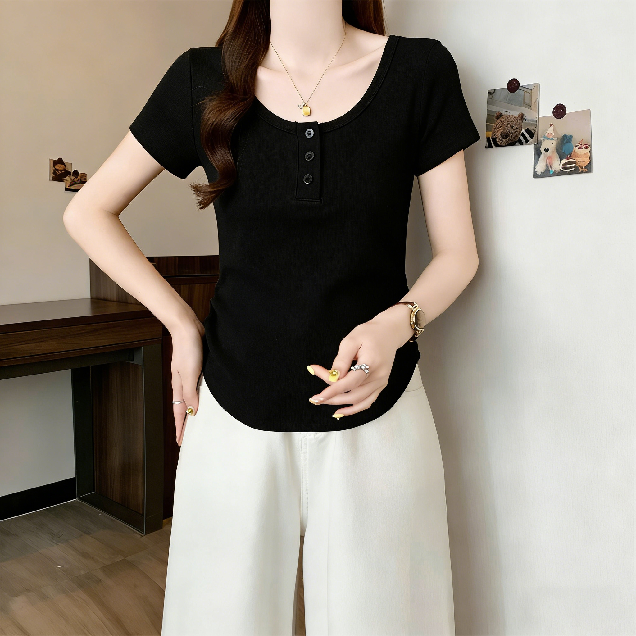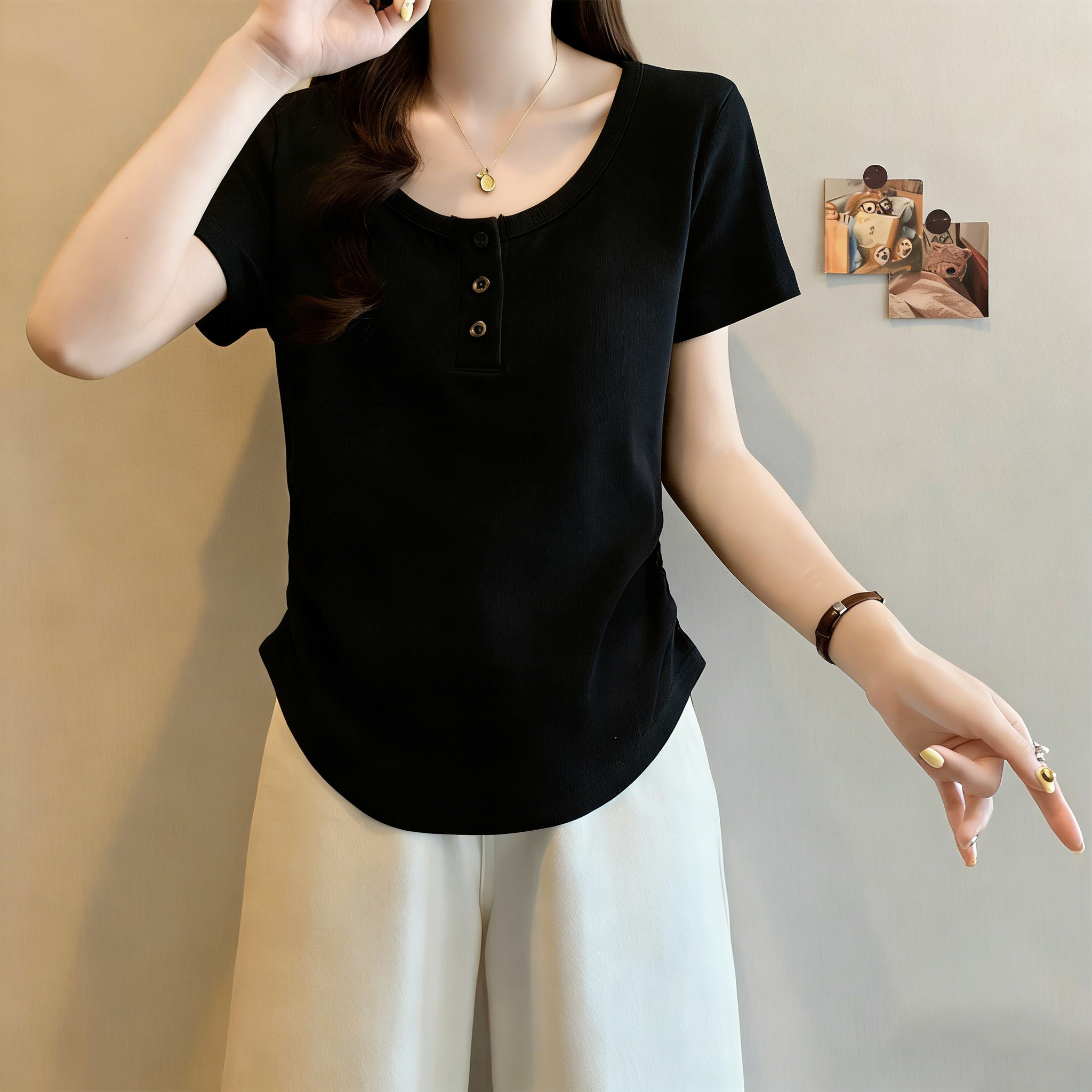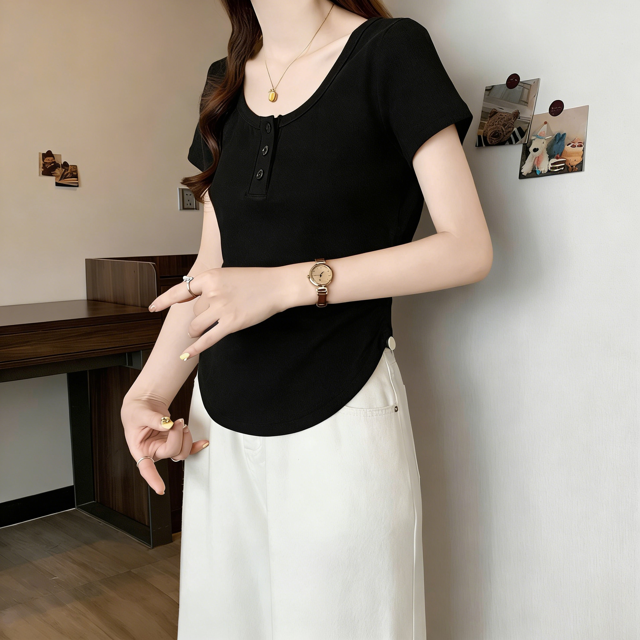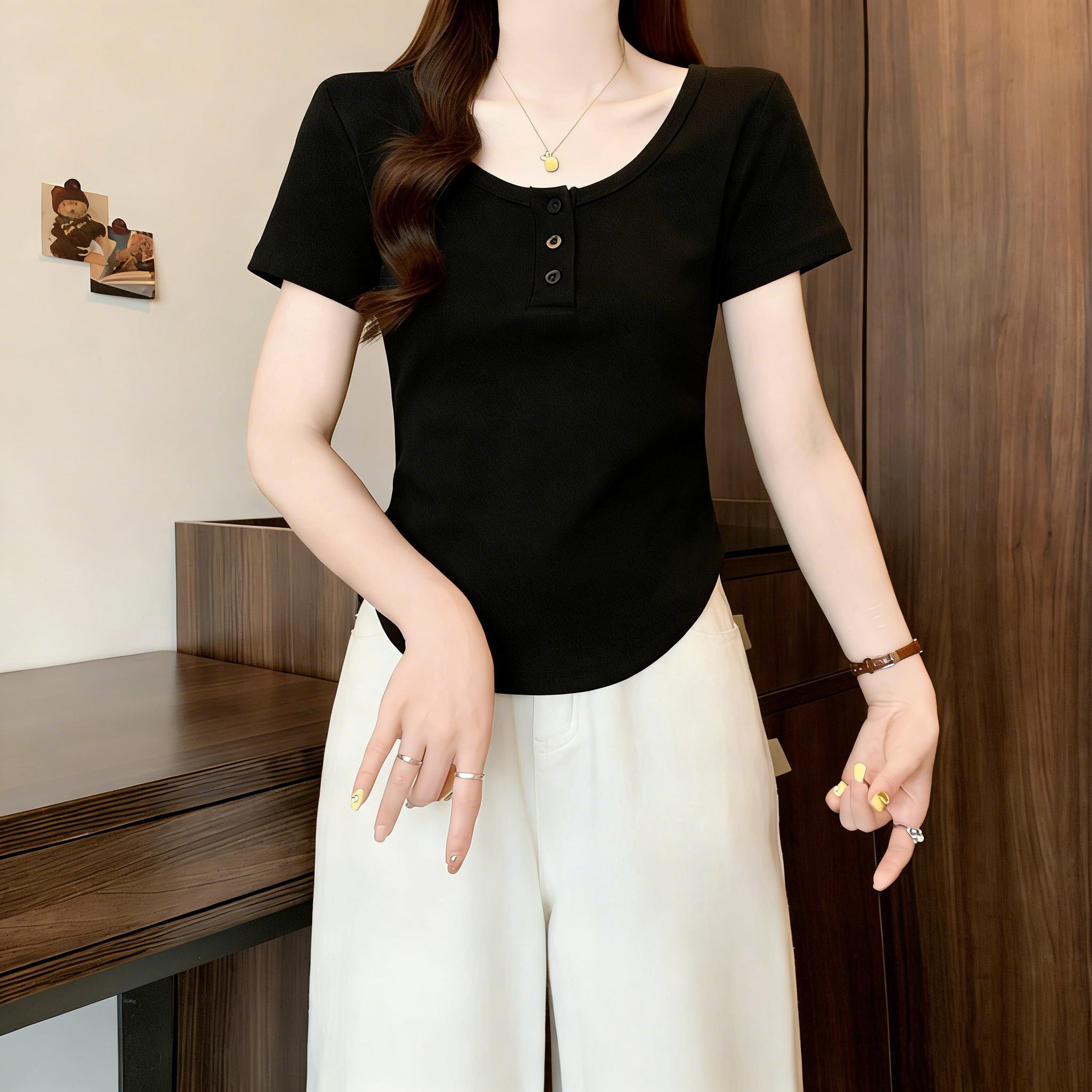 RY3076# 实拍~u领正肩短袖t恤女夏季胖mm遮肚子显瘦甜辣短款不规则上衣